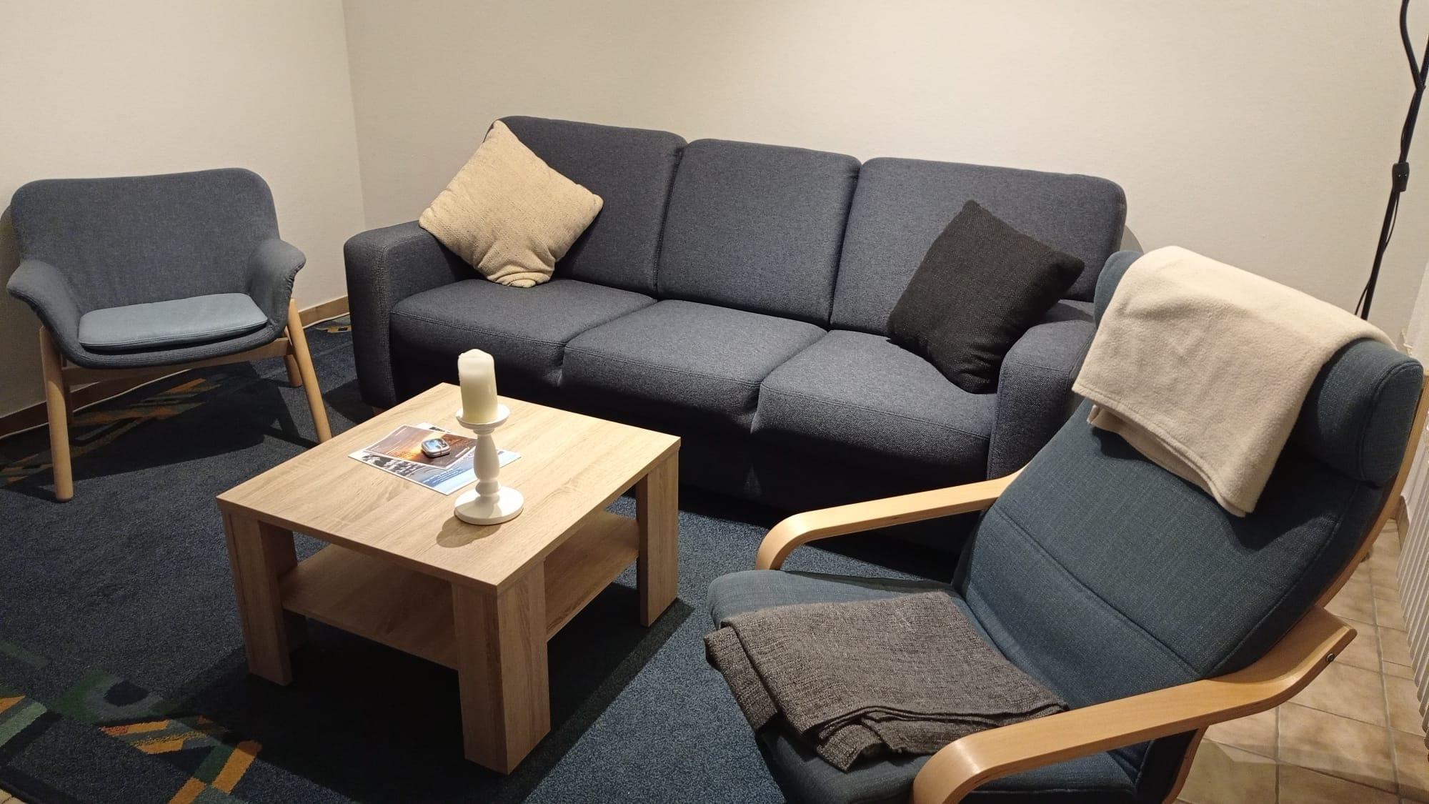 Gefliestes Wohn- und Esszimmer mit direktem Zugang zur Terrasse. Das Wohn- und Esszimmer ist mit einer modernen Couch, einem Schaukelsessel, einem Couchtisch sowie einem Essplatz für 4 Personen ausgestattet. Die Fenster lassen sich durch Plissees blickdicht verdunkeln. Zur Unterhaltung stehen ein Fernseher und eine Stereoanlage mit Radio und CD-Player zur Verfügung.