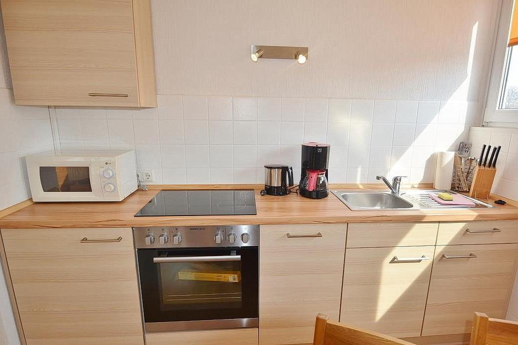 Komplett ausgestattete, moderne, zum Wohn- und Esszimmer offene Küche mit 4-Platten Cerankochfeld, Backofen, Spülmaschine, Kühlschrank mit kleinem 3-Sterne Gefrierfach, Mikrowelle, Kaffeemaschine, Toaster und Wasserkocher.