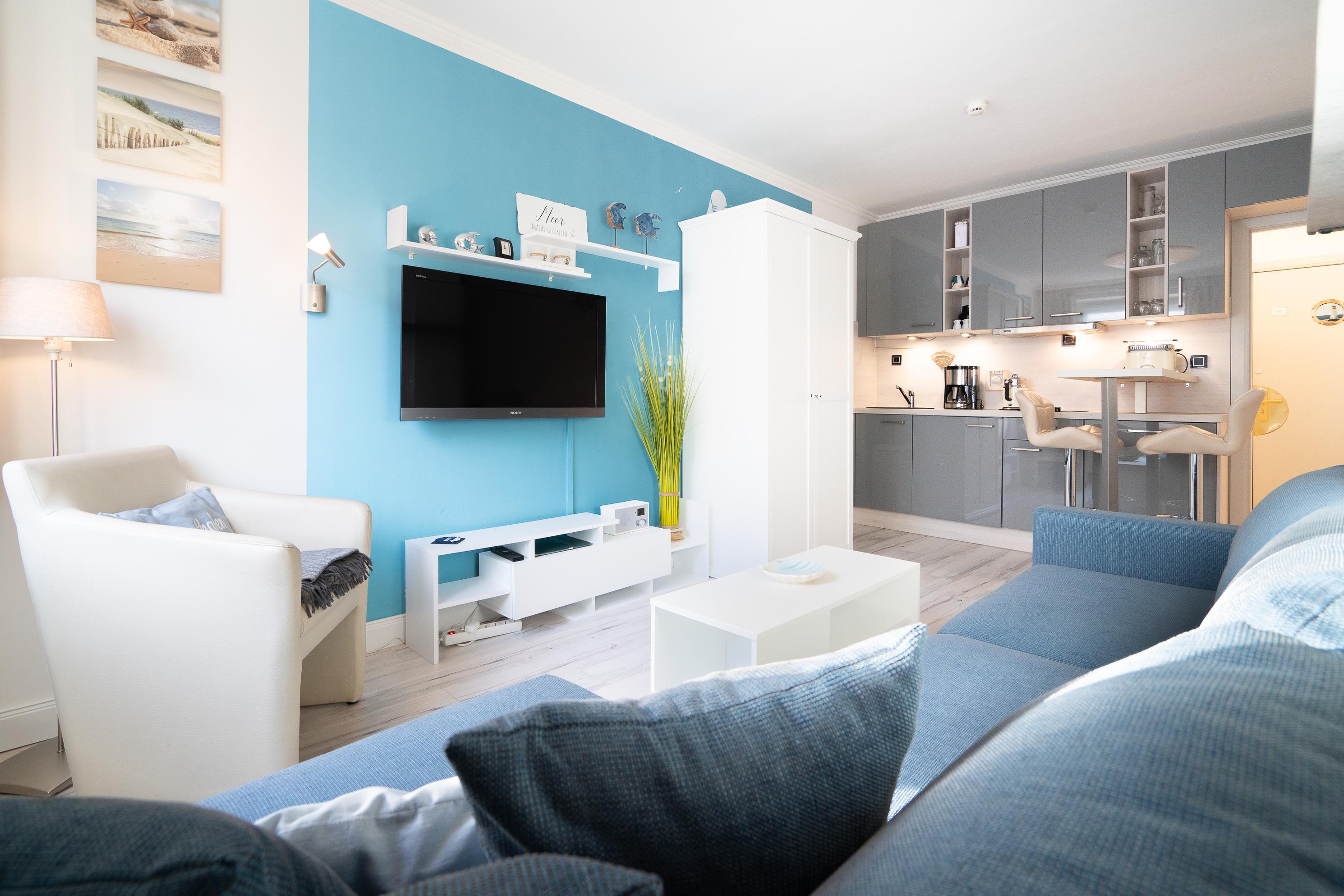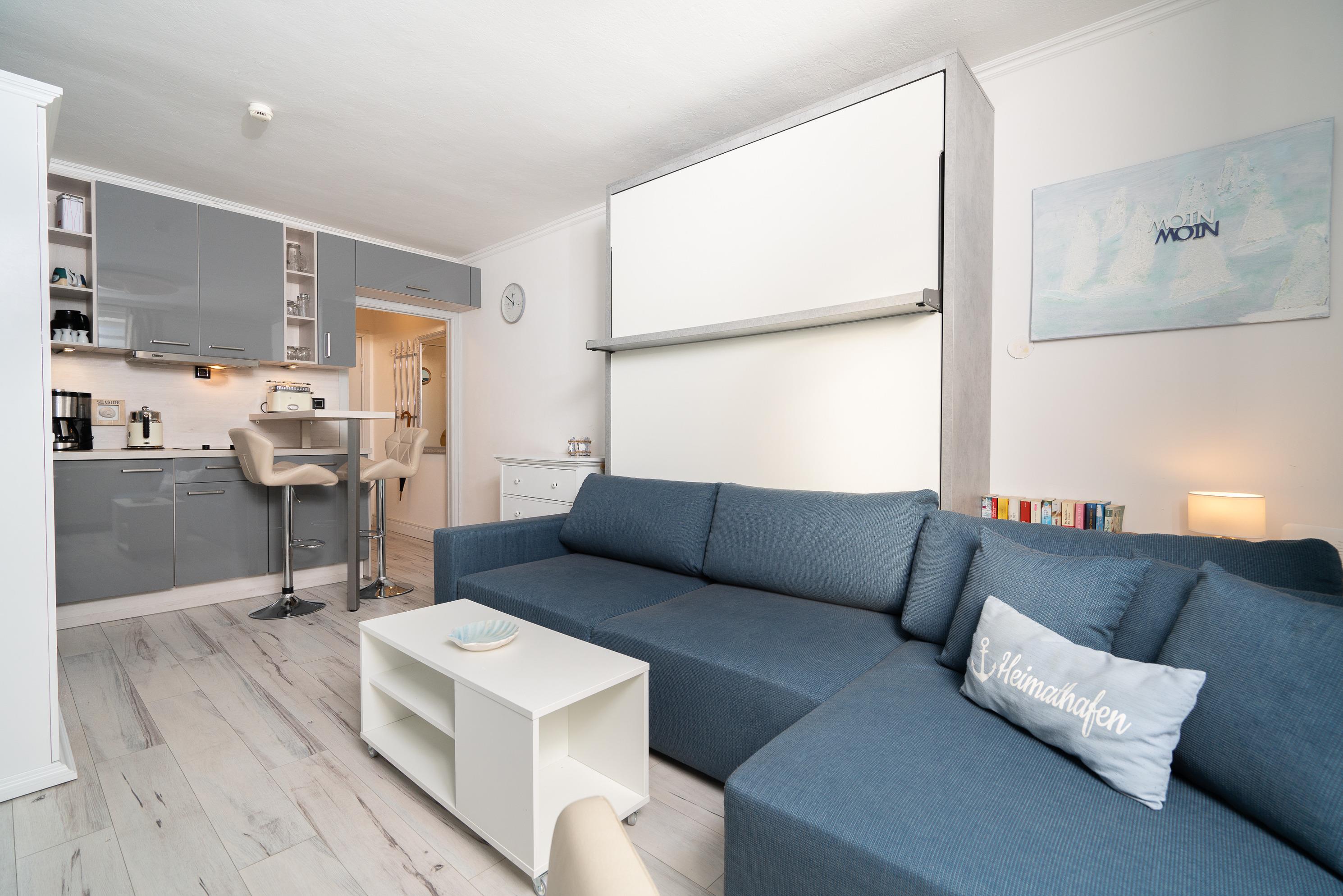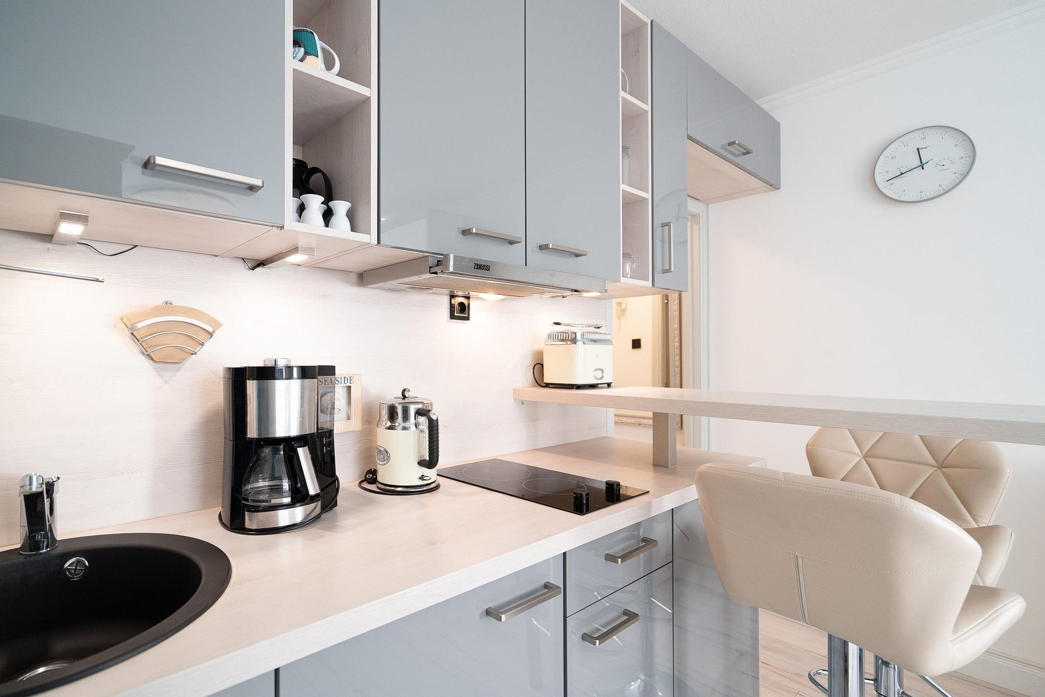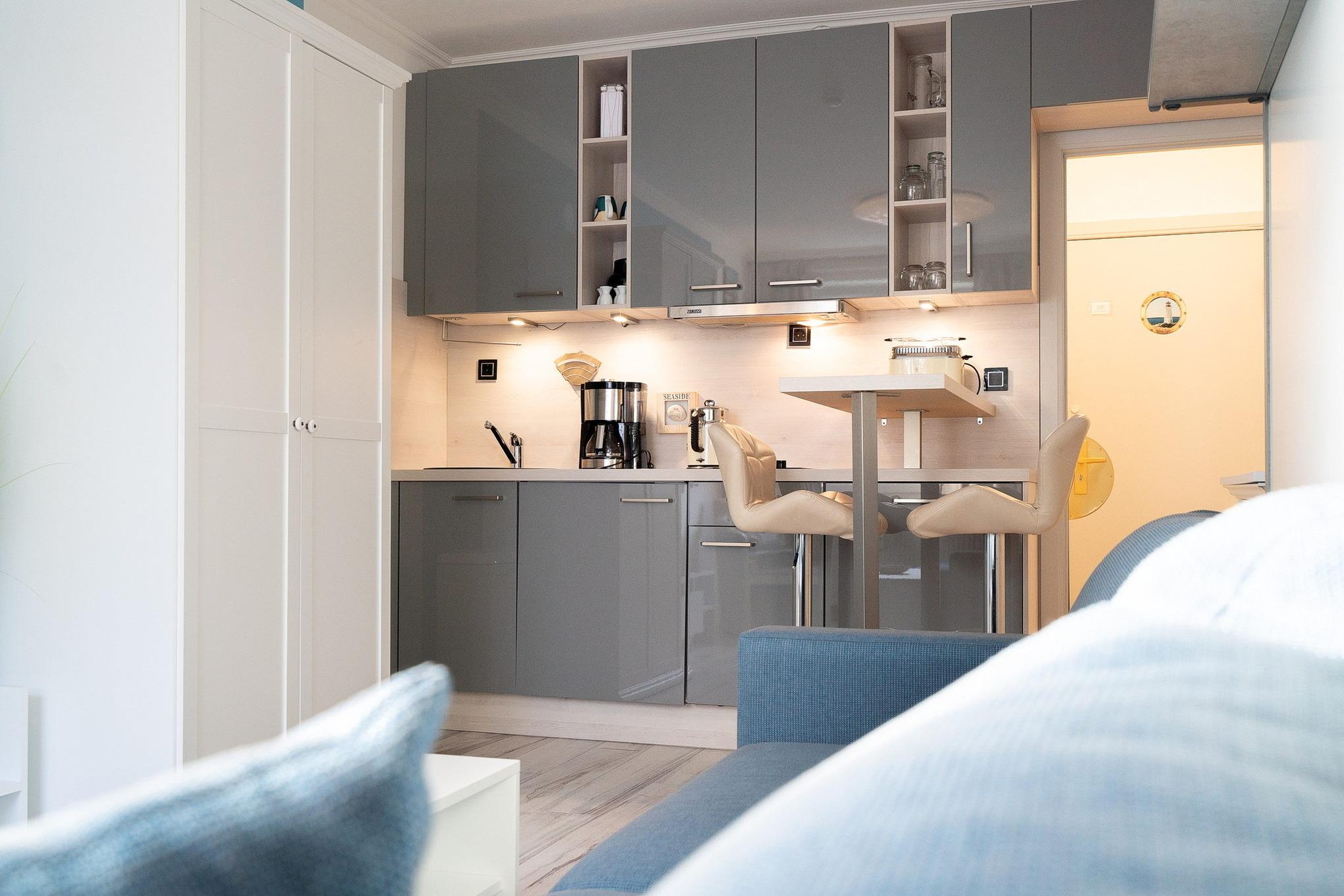 Komplett renovierte, vollständig ausgestattete, zum Wohn- und Schlafzimmer offene Küche mit 2-Platten Cerankochfeld, Kühlschrank mit kleinem Gefrierfach, Backofen, Geschirrspüler, Kaffeemaschine, Toaster und Wasserkocher.