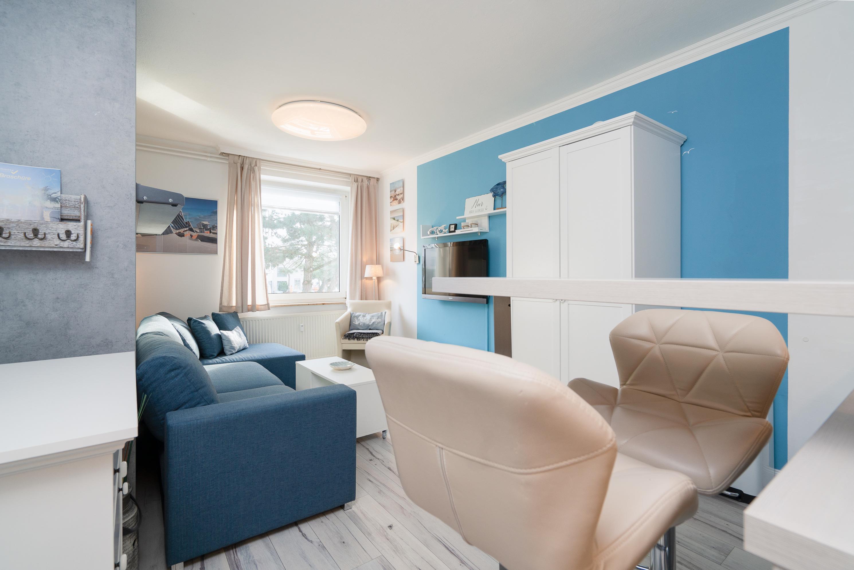 Das Wohn- und Schlafzimmer ist mit einem Schrankbett (160 x 200cm), Ecksofa, Sessel, Couchtisch und einem Essplatz für 2 Personen ausgestattet. Ein 2-türiger Kleiderschrank steht Ihnen zur Verfügung. Zur Unterhaltung stehen ein Flachbildfernseher und eine Mini-Stereoanlage zur Verfügung. Das Wohn- und Schlafzimmer ist mit modernem Laminatboden ausgelegt. Das Fenster lässt sich durch einen Vorhang etwas verdunkeln.