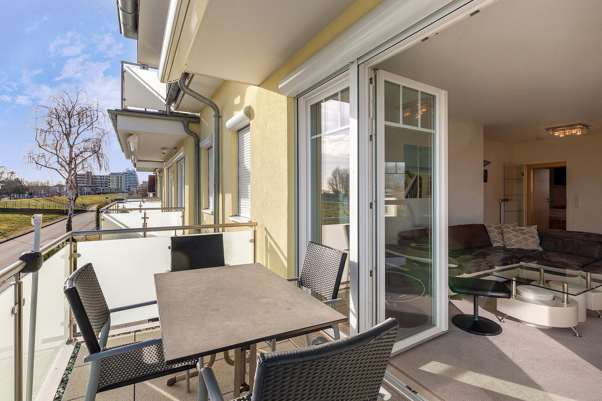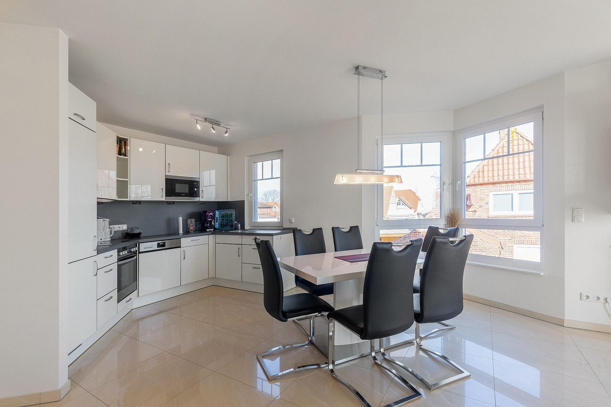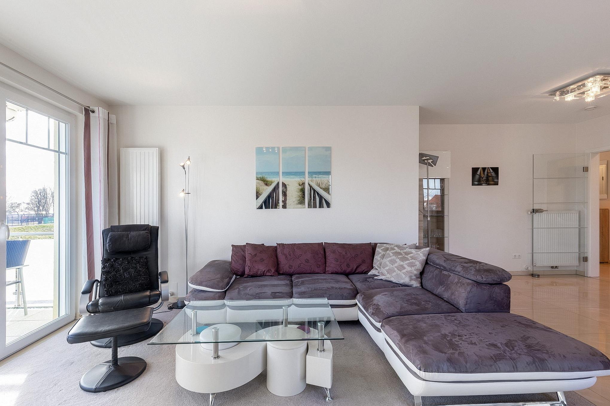 Das modern ausgestattete Wohn- und Esszimmer ist mit einem großzügigen Essplatz, einem Komfort-Ecksofa, einem Couchtisch, einer Wohnwand und einer Vitrine ausgestattet. Vom Wohnbereich direkter Zugang zum Balkon mit Blick auf den Deich, Promenade und aufs Meer. Das Zimmer ist mit Designer-Fliesen ausgelegt (Fußbodenheizung); die Fenster lassen sich durch elektrische Außenrollos vollständig verdunkeln. Zur Unterhaltung stehen ein Flachbildschirm mit Blue-Ray- und CD-Player sowie eine Mini-Stereoanlage mit Bluetooth und CD-Player zur Verfügung.