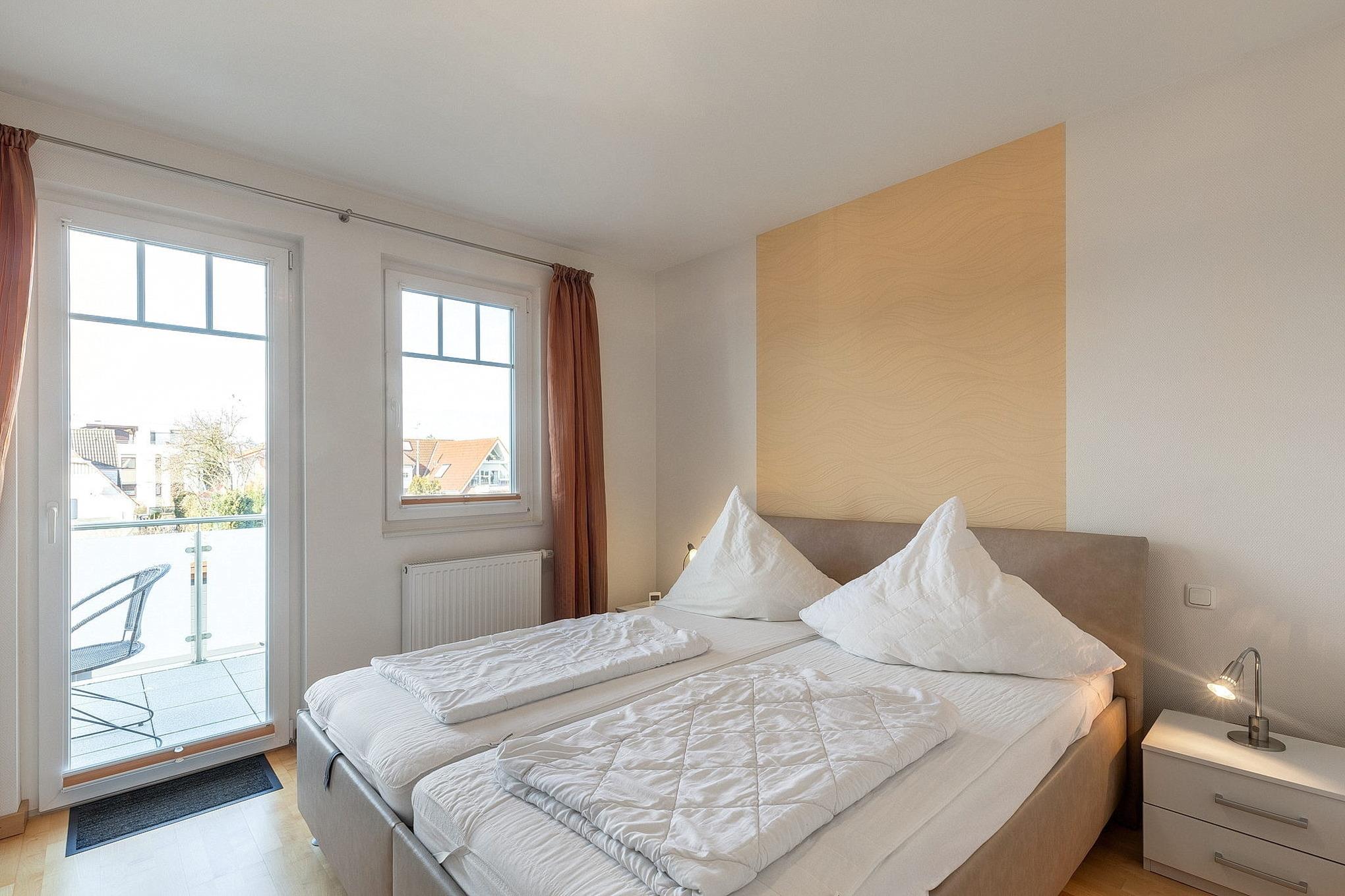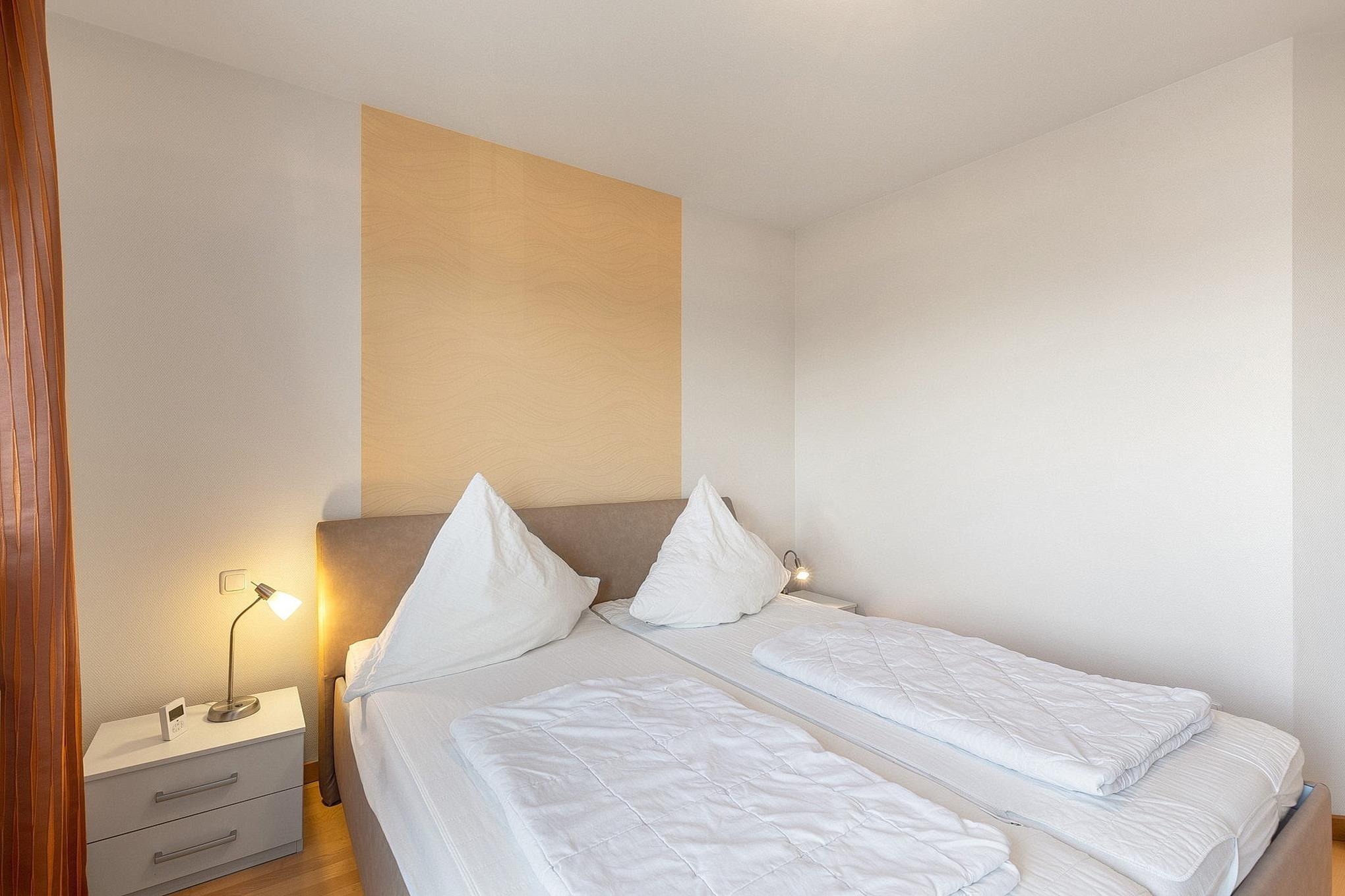 Modern ausgestattetes, separates Schlafzimmer mit direktem Zugang zum Balkon in nord-westliche Richtung. Das Schlafzimmer ist mit einem Doppelbett (2x 90x200cm) und einem Kleiderschrank ausgestattet. Die Fenster lassen sich durch elektrische Außenrollos vollständig verdunkeln. Das Zimmer ist mit Echtholzparket ausgelegt.