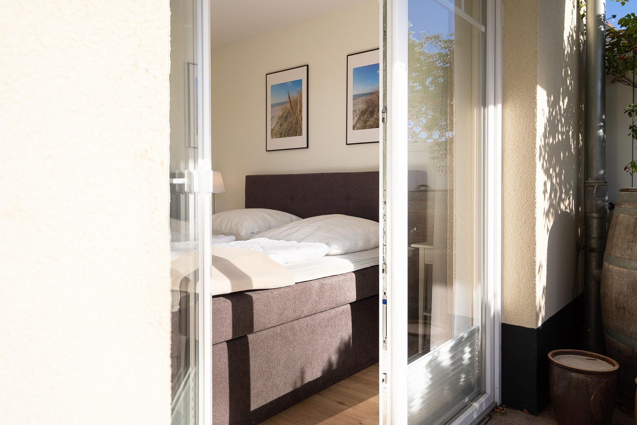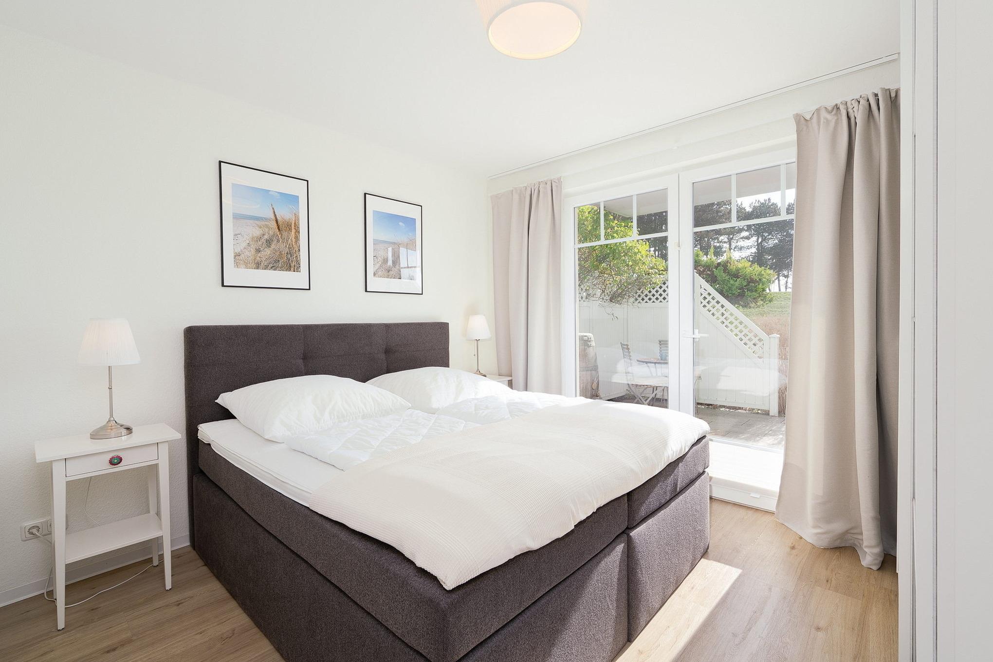 Das einfach eingerichtete Schlafzimmer ist mit einem Doppelbett (180x200cm) und einem Kleiderschrank ausgestattet. Das Fenster lässt sich vollständig verdunkeln.