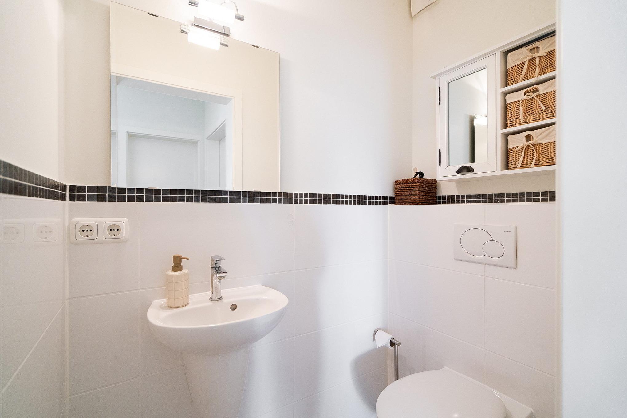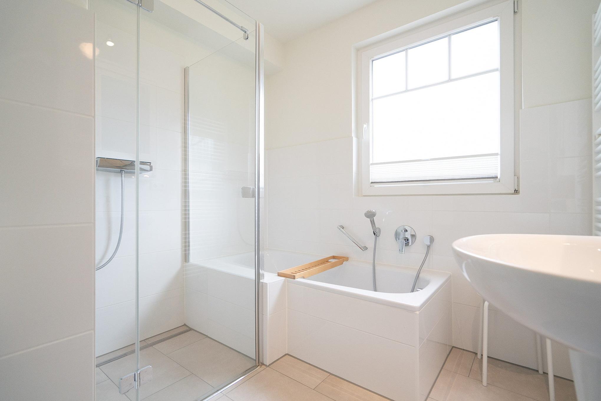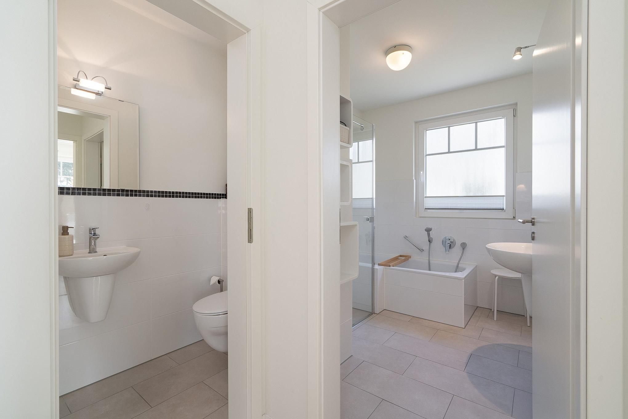 Die Wohnung verfügt über ein Tageslichtbadezimmer mit Dusche, Badewanne und Waschbecken, allerdings ohne WC. Zusätzlich gibt es noch eine separate Toilette mit Waschbecken ohne Fenster.
