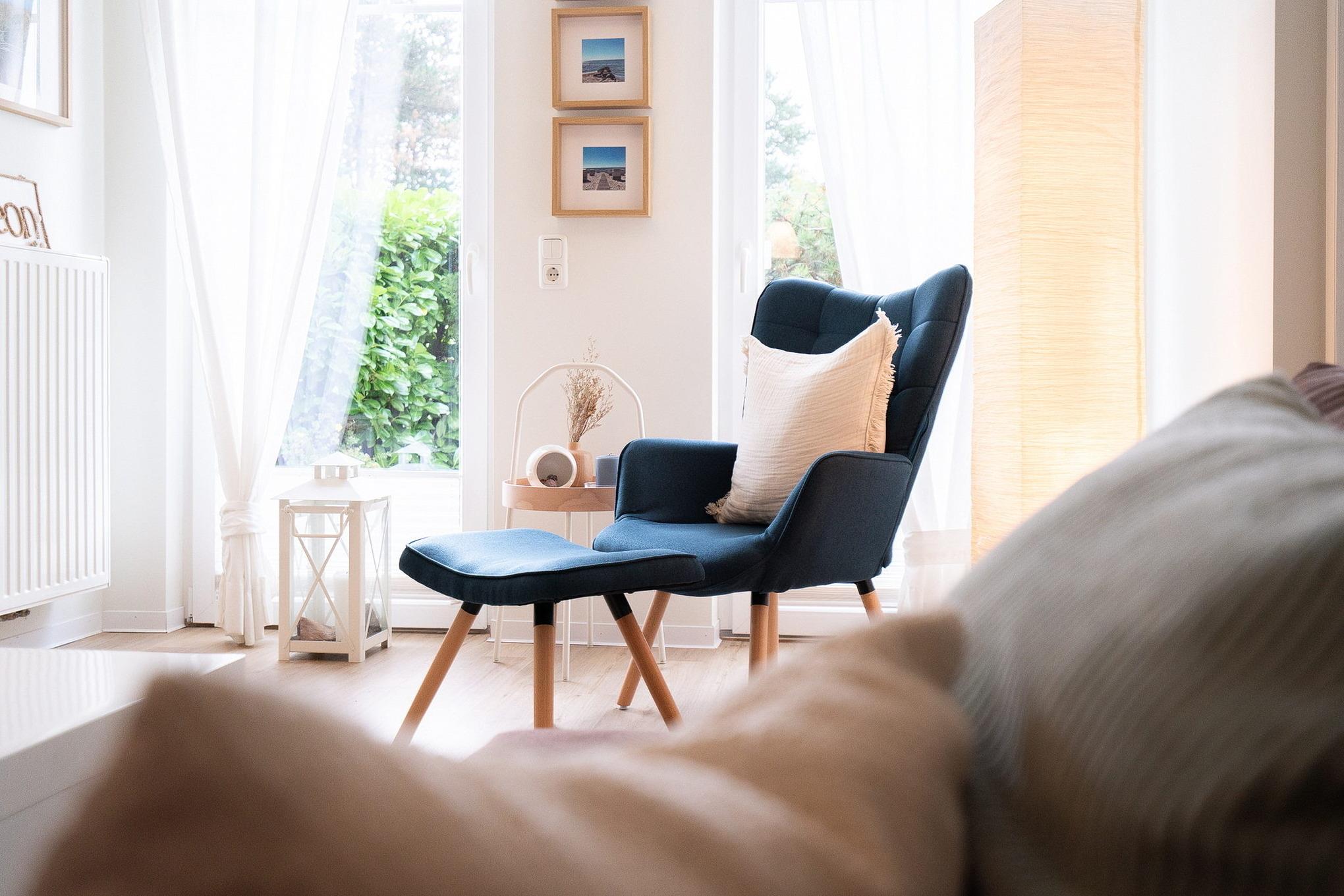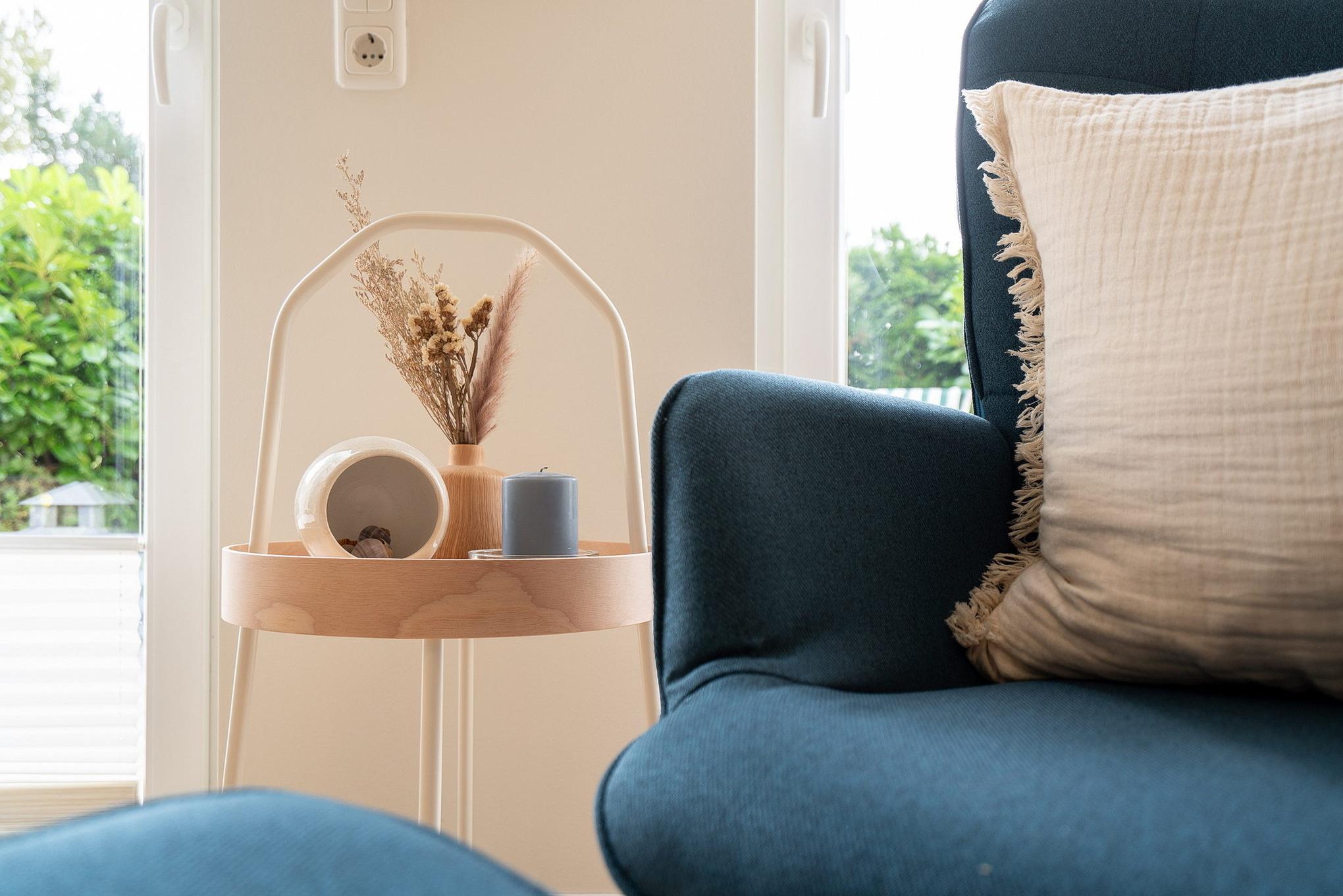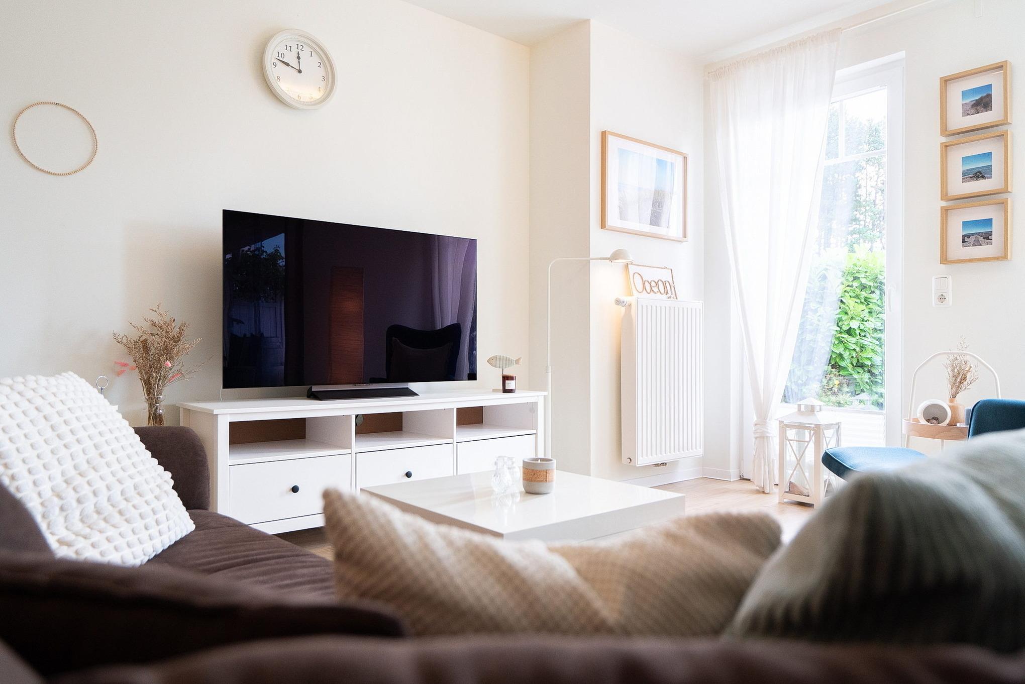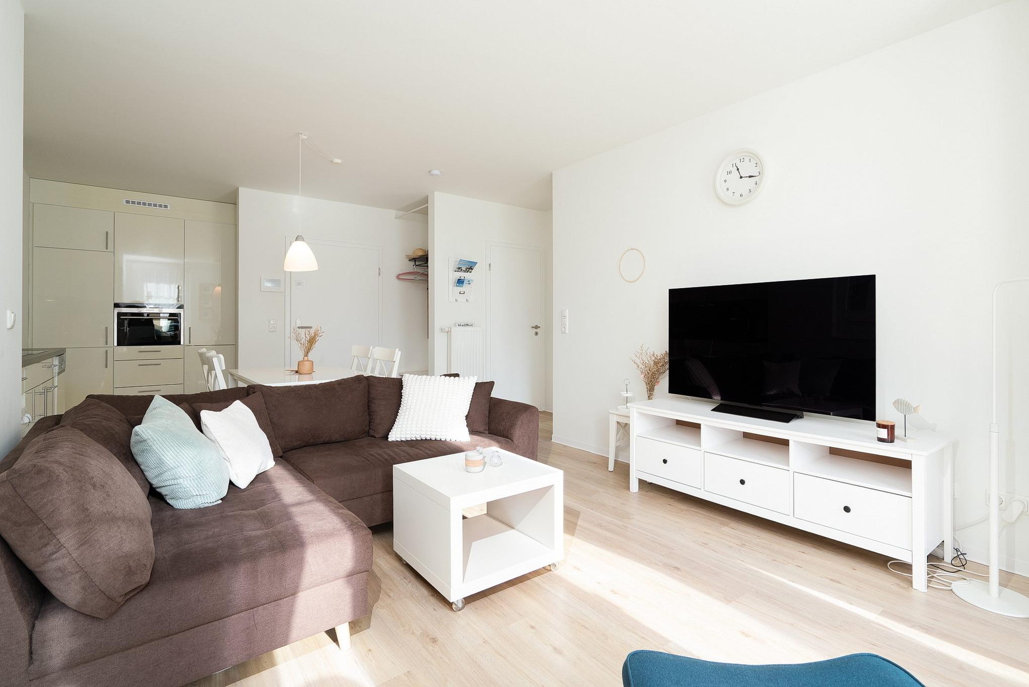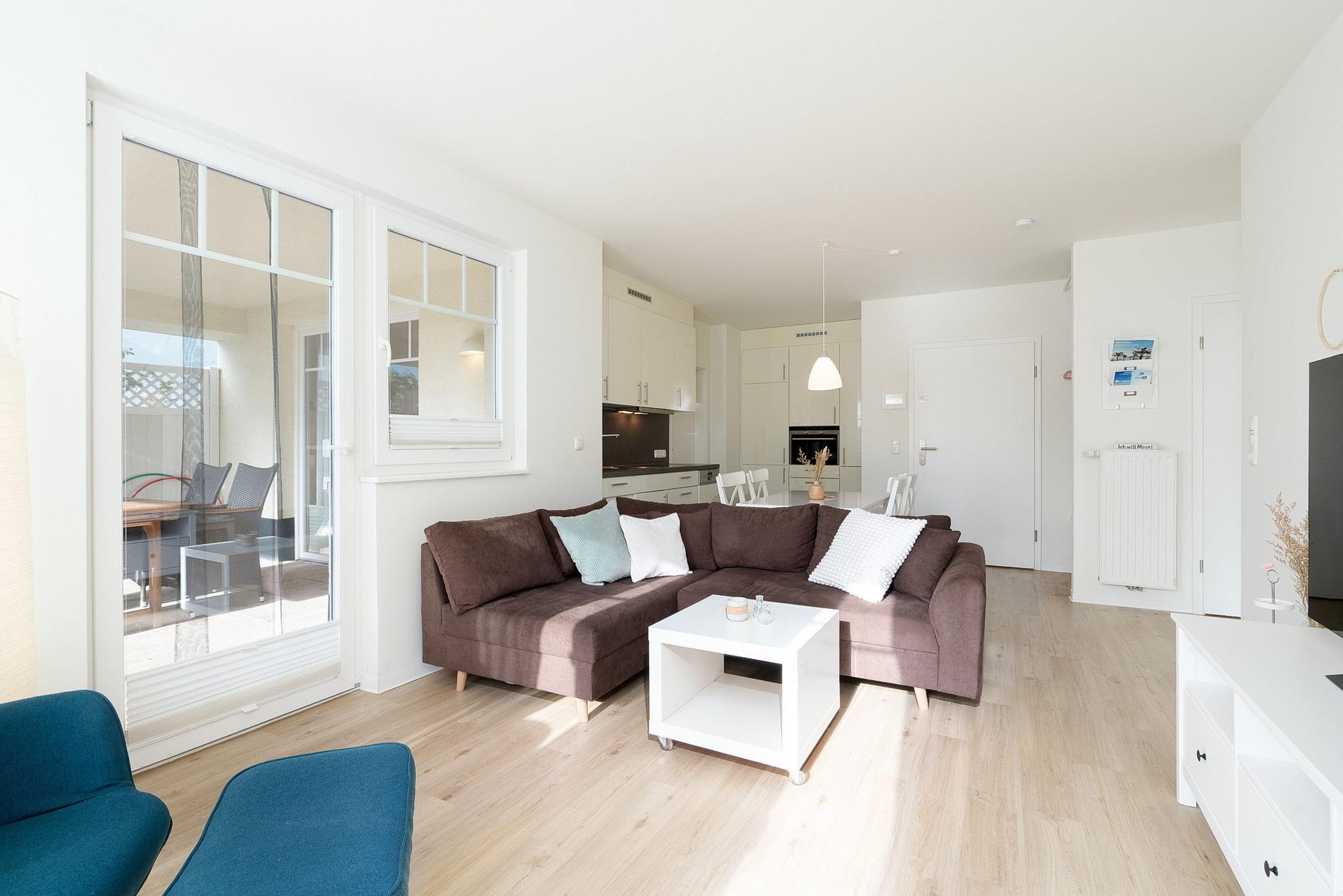 Helles, freundliches, modern und hochwertig ausgestattetes Wohn- und Esszimmer mit direktem Zugang zur Terrasse mit schönem Blick auf den Deich. Das Wohn- und Esszimmer ist mit einer Eckcouch, einem Sessel mit Fußauflage, einem Couchtisch und einem Essplatz für 4 Personen ausgestattet. Zur Unterhaltung stehen ein Flachbildschirm und ein Blu-Ray Player zur Verfügung. An den Fenstern befinden sich Plissees zum Sichtschutz.