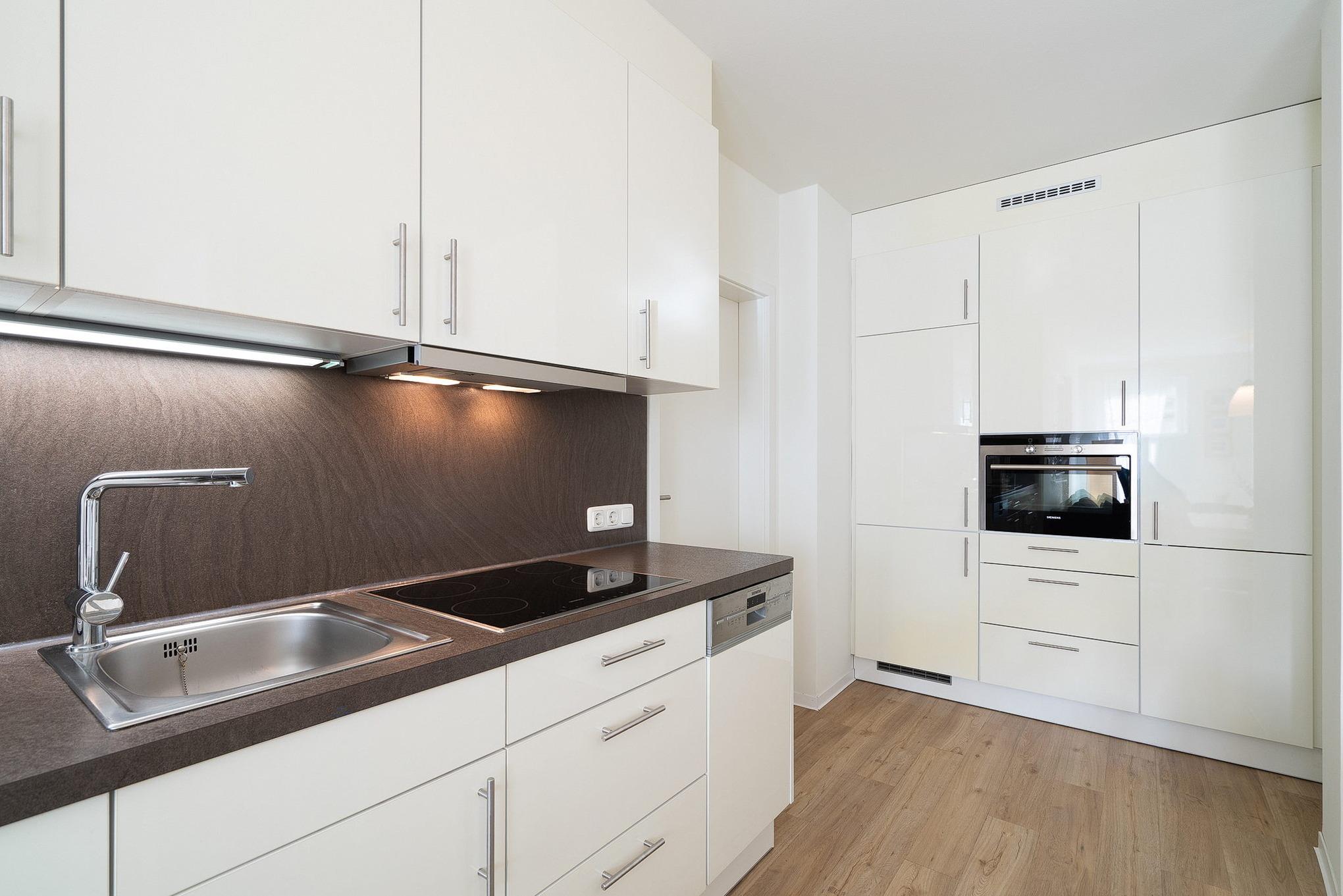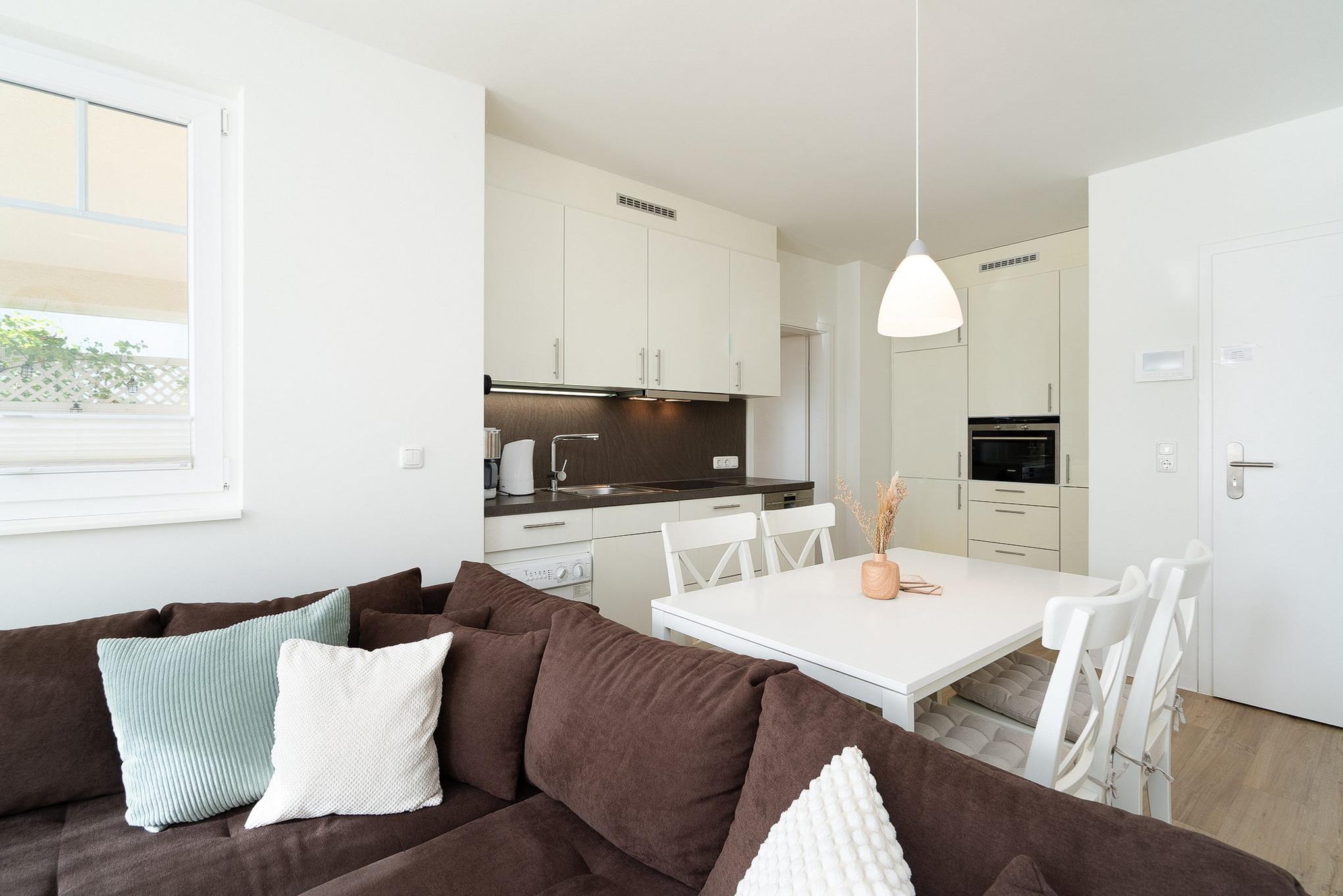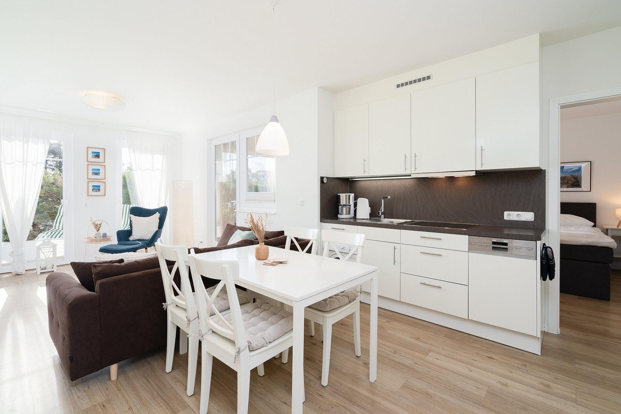 Moderne, komplett eingerichtete, zum Wohn- und Esszimmer offen Küche mit 4 Platten-Cerankochfeld, Backofen, Spülmaschine, Mikrowelle, Kühlschrank mit kleinem 3-Sterne Gefrierfach, Kaffeemaschine, Wasserkocher und Toaster. Außerdem befindet sich in der Küche eine kleine Waschmaschine.
