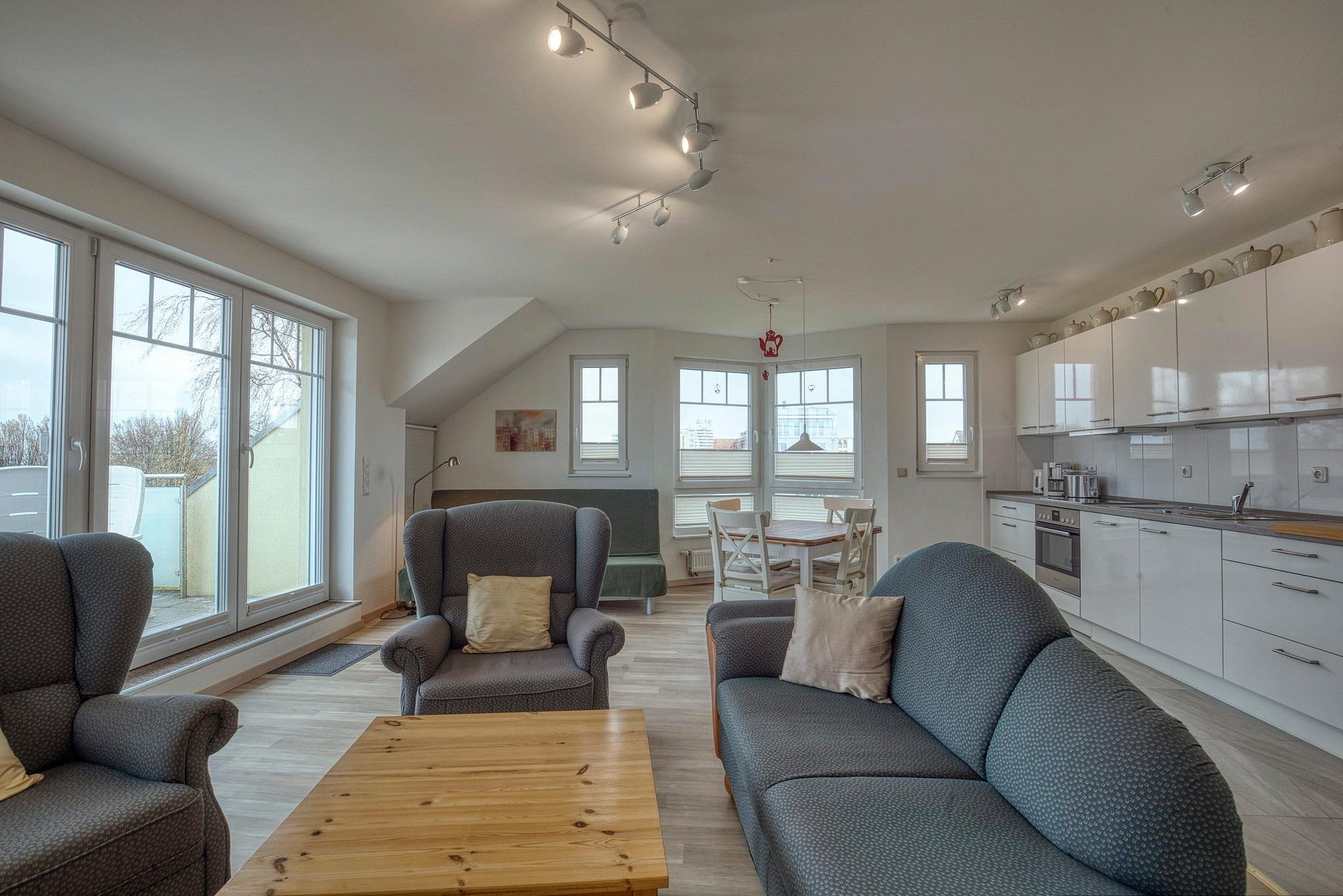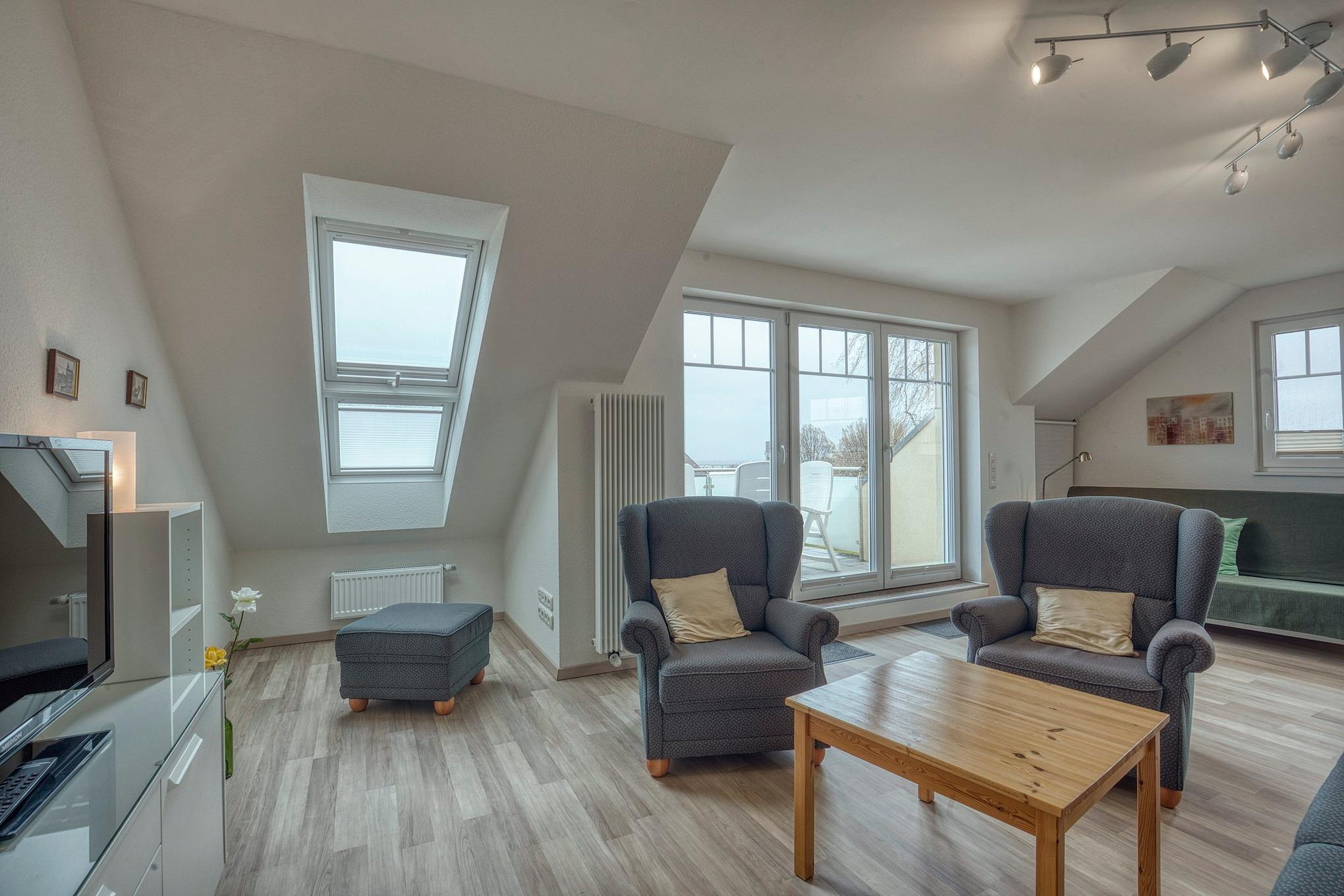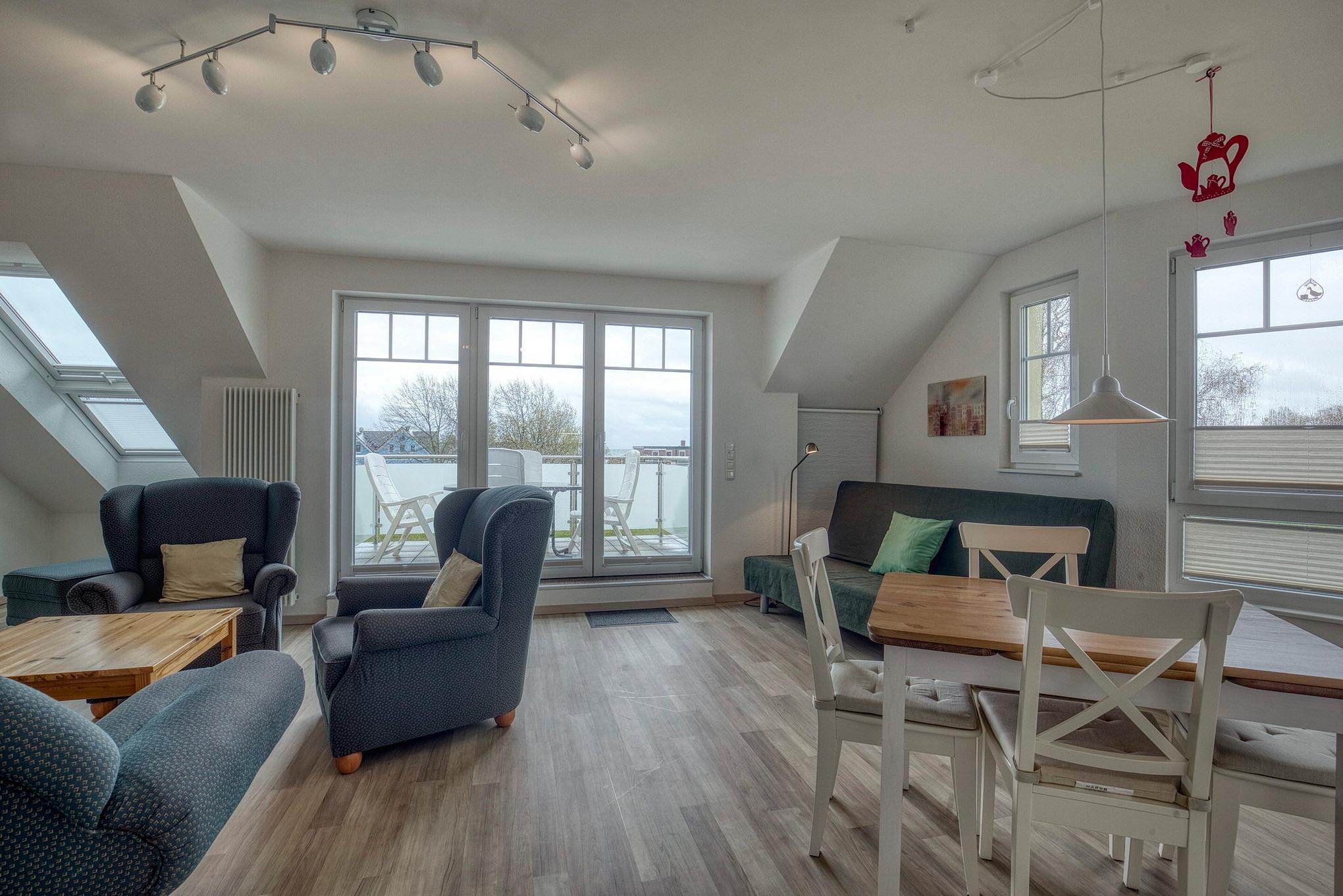 Das helle, geräumige Wohn- und Esszimmer ist mit einem Essplatz, eine Sitzecke (zwei Ohrensessel, eine Recamiere, Hocker) einem Kiefer-Couchtisch und Schlafsofa (140x200cm) ausgestattet. Vom Wohnbereich direkter Zugang zum ersten Balkon ( Süd-Ost Lage) mit Blick auf den Deich, Promenade und aufs Meer. Das Zimmer ist mit speziellen rutschgehemmten Laminat ausgelegt, die Fenster lassen sich durch elektrische Außenrollos vollständig verdunkeln. Zur Unterhaltung stehen ein Fernseher und eine Micro-Hi-Fi Anlage zur Verfügung.