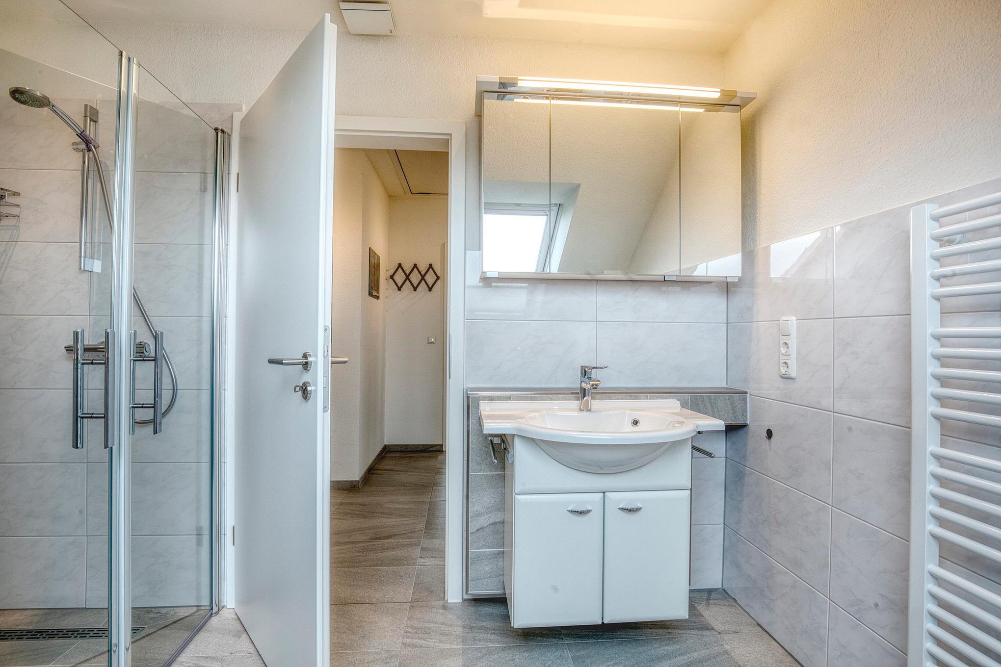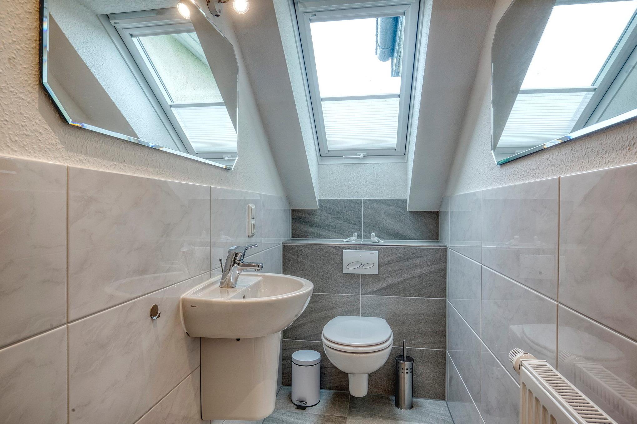 Modernes, gefliestes Tageslichtbad mit Dusche und Toilette. Zusätzlich gibt es ein separates Gäste-WC.