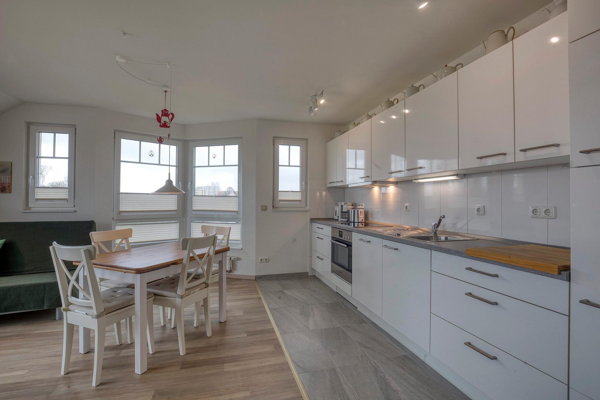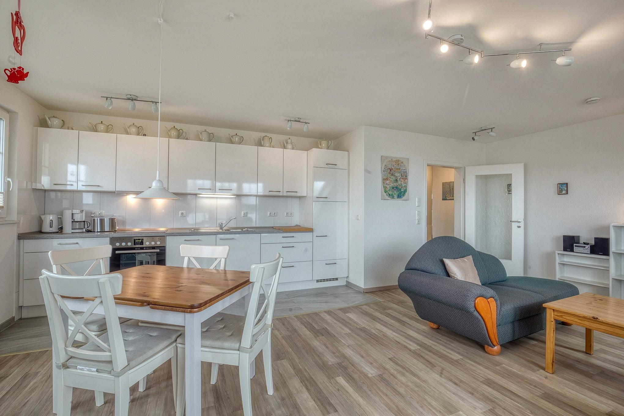 Komplett ausgestattete, zum Wohn- und Esszimmer offene Küche mit 4 Platten Cerankochfeld, Backofen, Spülmaschine, Kühlschrank mit kleinem Gefrierschrank, Kaffeemaschine, Wasserkocher und Toaster.