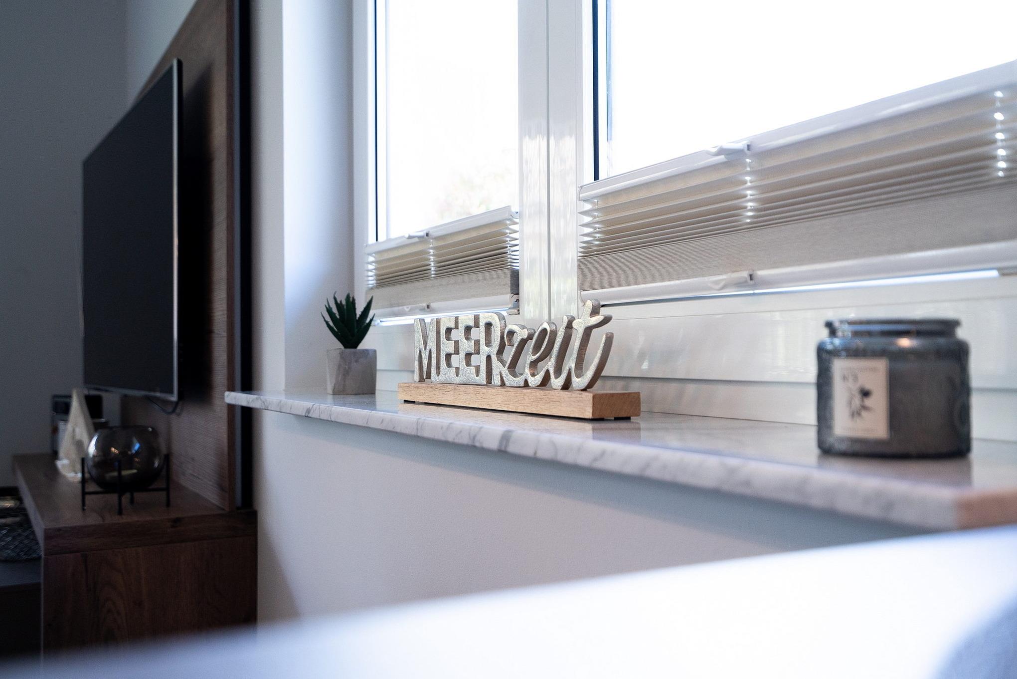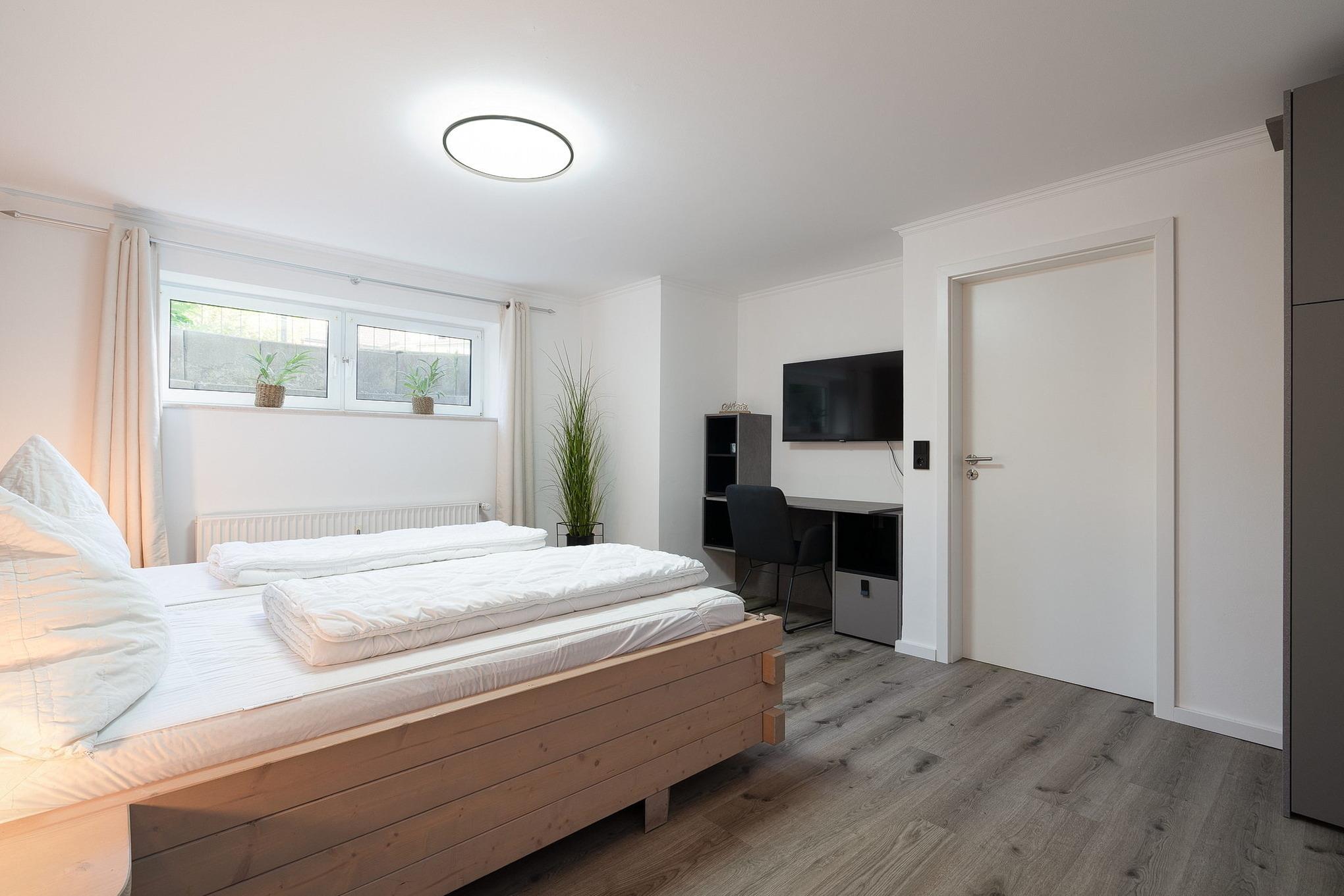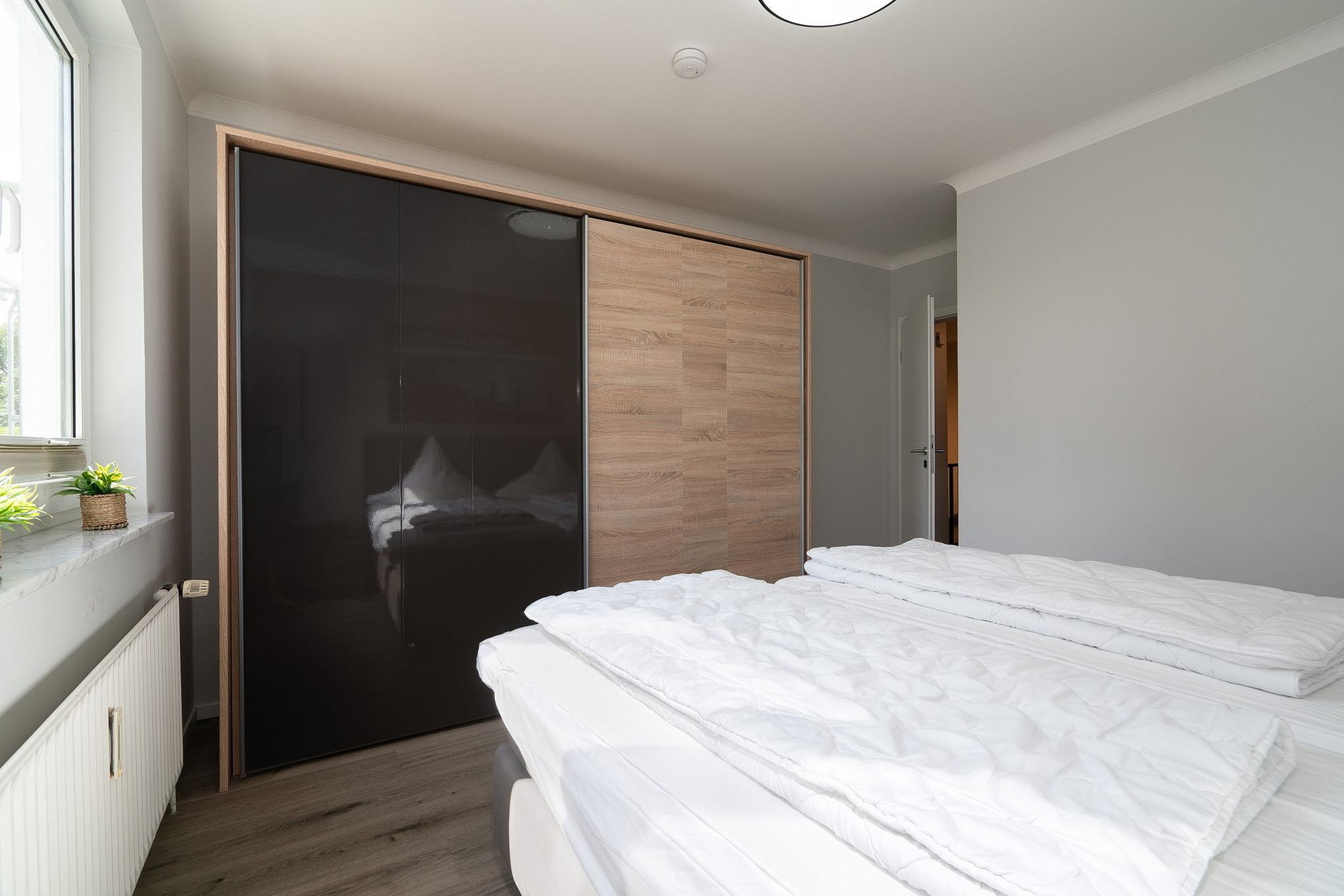 Das modern ausgestattete Schlafzimmer wurde mit einem neuen Boxspringbett (180x200cm) ausgestattet und verfügt über einen Kleiderschrank mit platzsparenden Schiebetüren. Der Raum wurde ebenfalls mit dem pflegeleichten, modernen Designboden ausgelegt. Die Fenster lassen sich durch die Plissees verdunkeln.