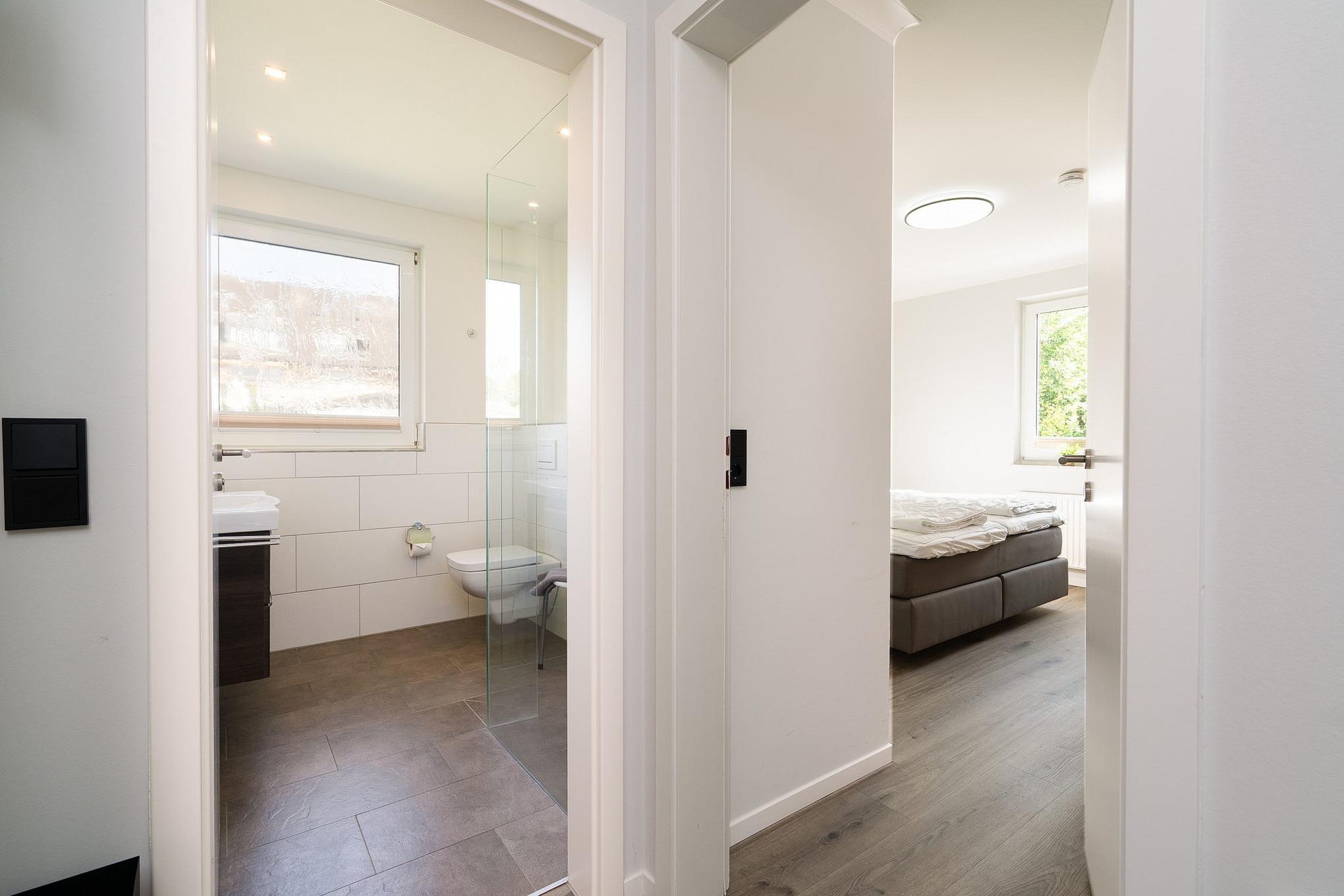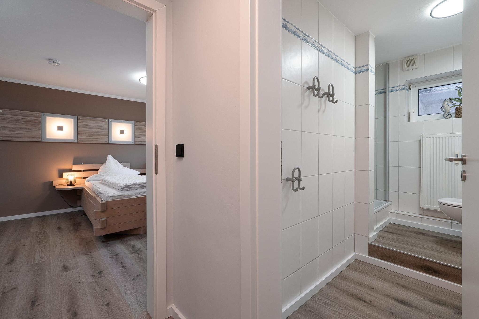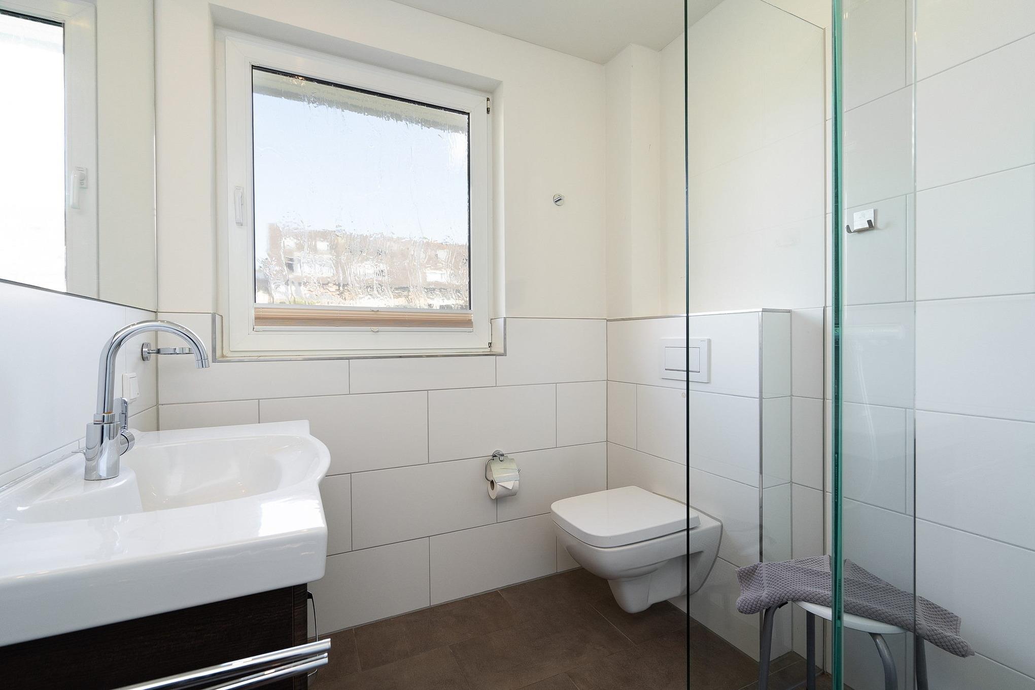 Direkt neben dem Schlafzimmer befindet sich das Tageslichtbad mit WC und Dusche (eine Stufe erhöht) und einer Waschtischanlage mit einem Spiegelschrank.