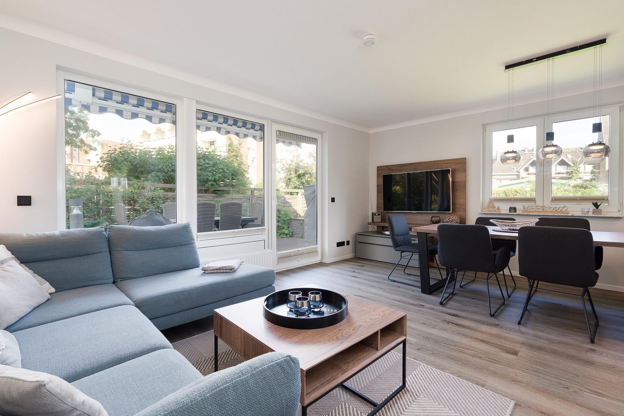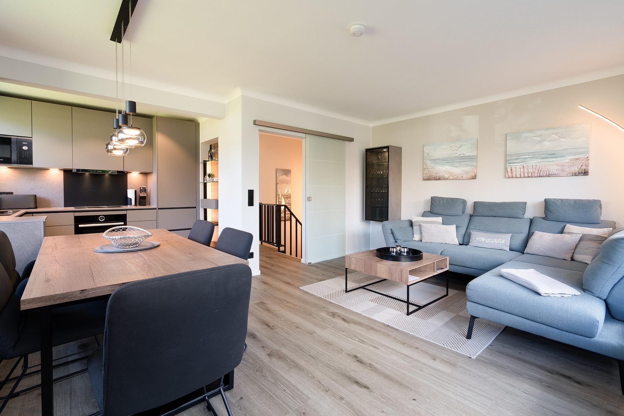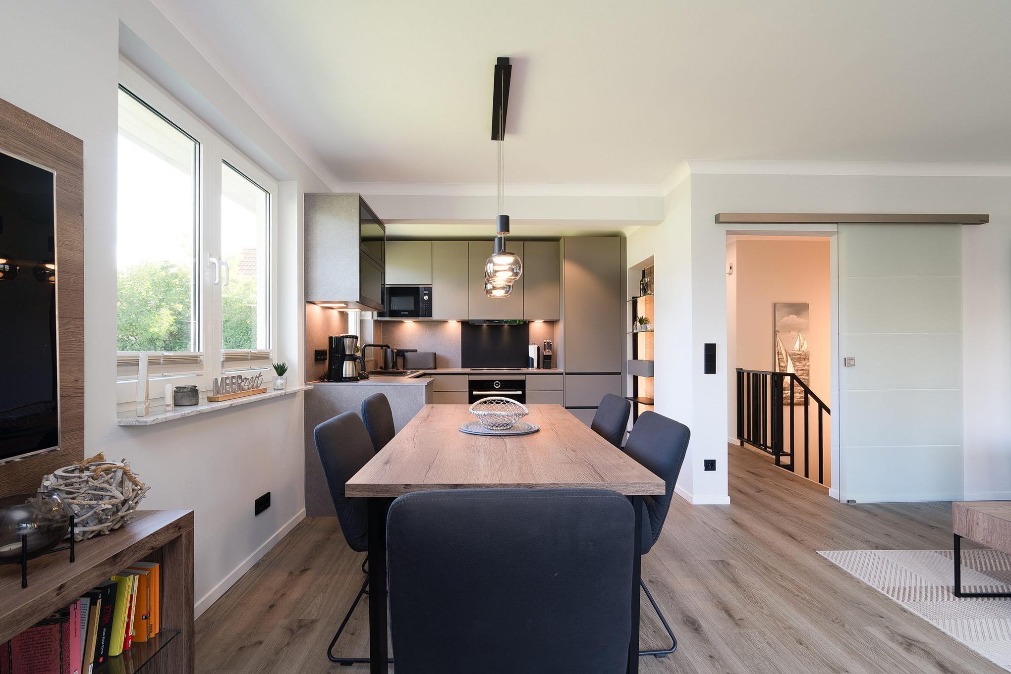 So können Sie sich nun auf einen geräumigen und modernen Wohn-/Essbereich mit offener Küche freuen - mit direkten Zugang zur Terrasse.