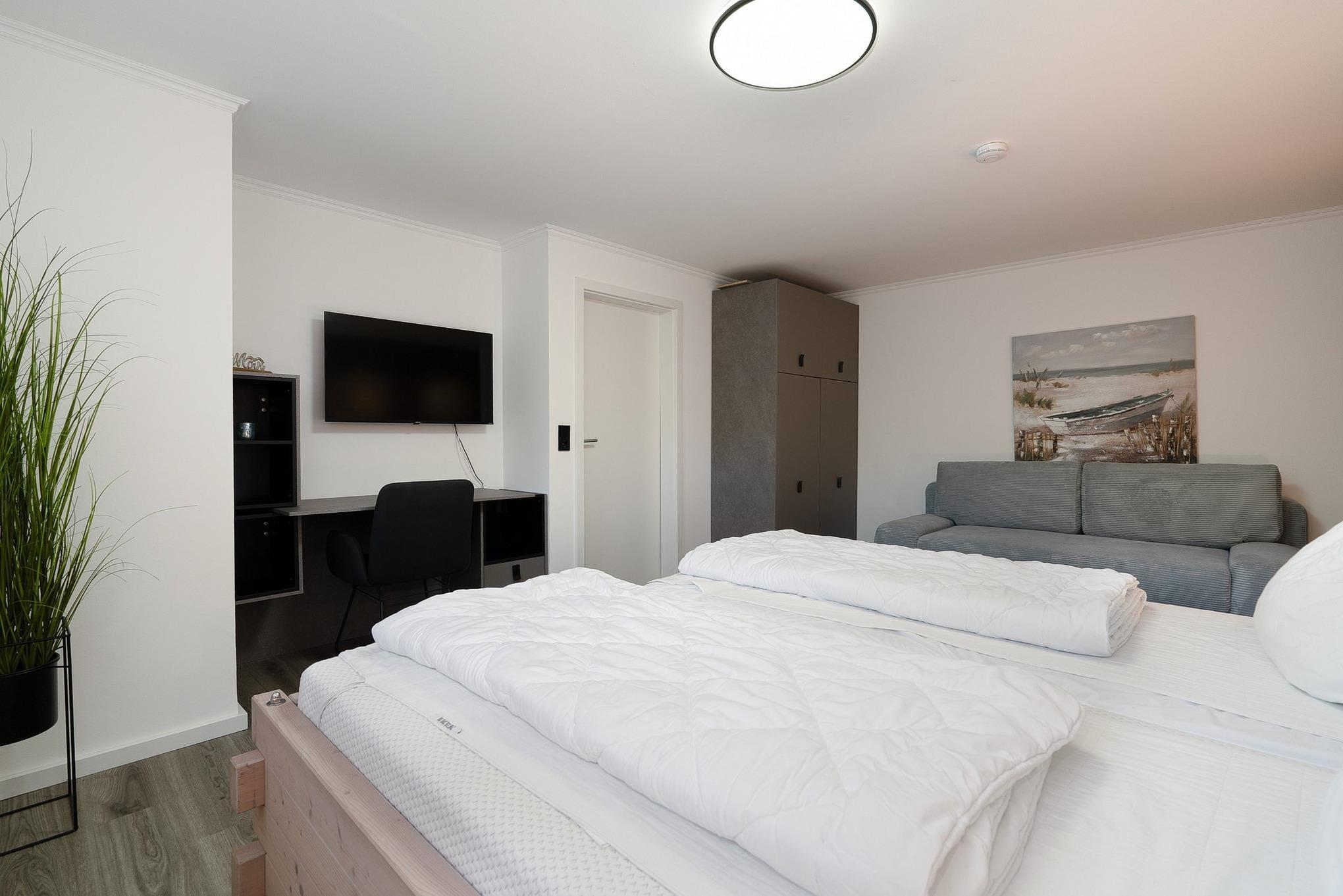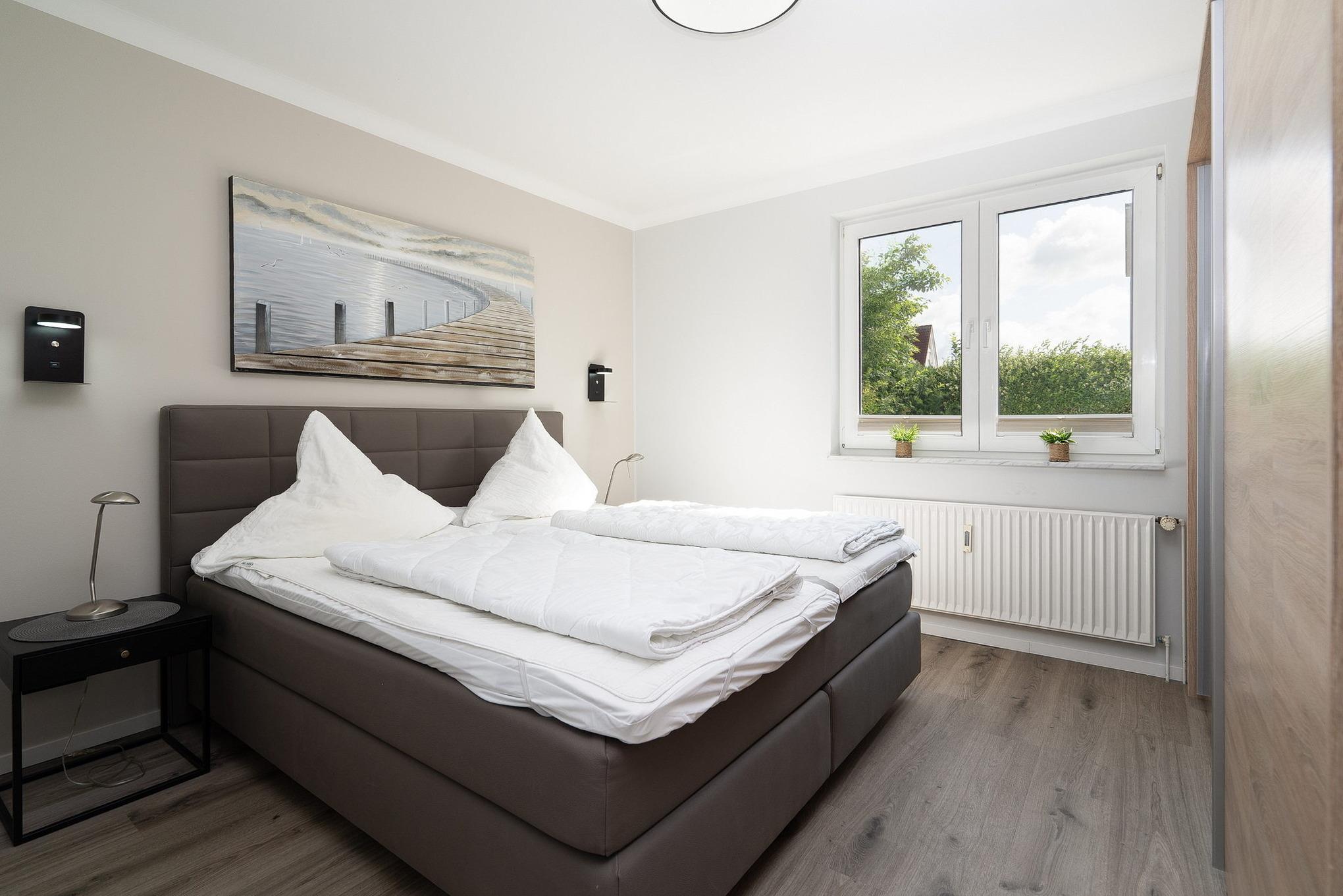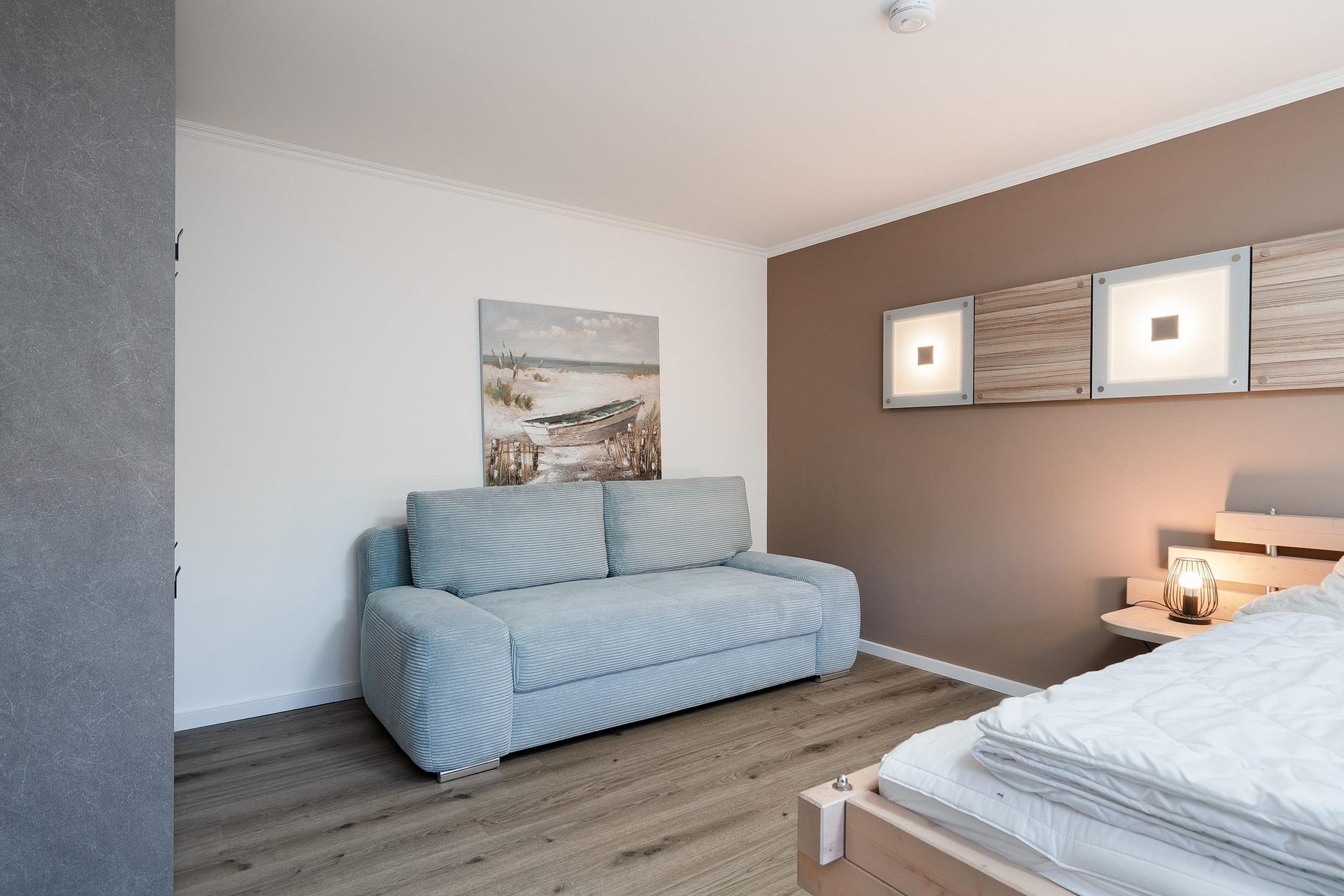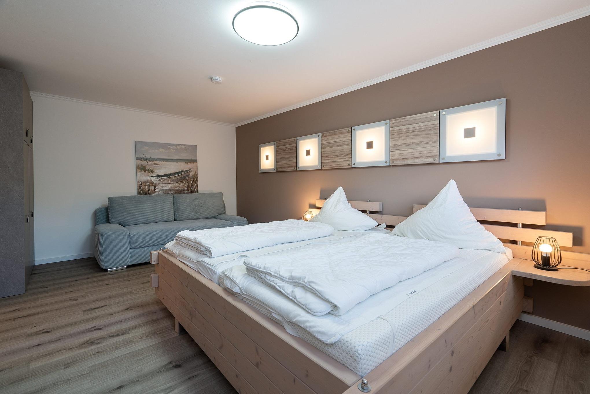 Der großzügige Schlafraum verfügt über ein massiv gebautes Holzbett (2x100x200cm). Zur weiteren Ausstattung zählt ein Kleiderschrank, ein Sidebord und zur Unterhaltung ein Flachbildschirm-TV. Der Fußboden ist gelfliest. Die Fenster lassen sich durch Vorhänge verdunkeln. Außerdem steht eine Schlafcouch zur Verfügung (160x200 cm).