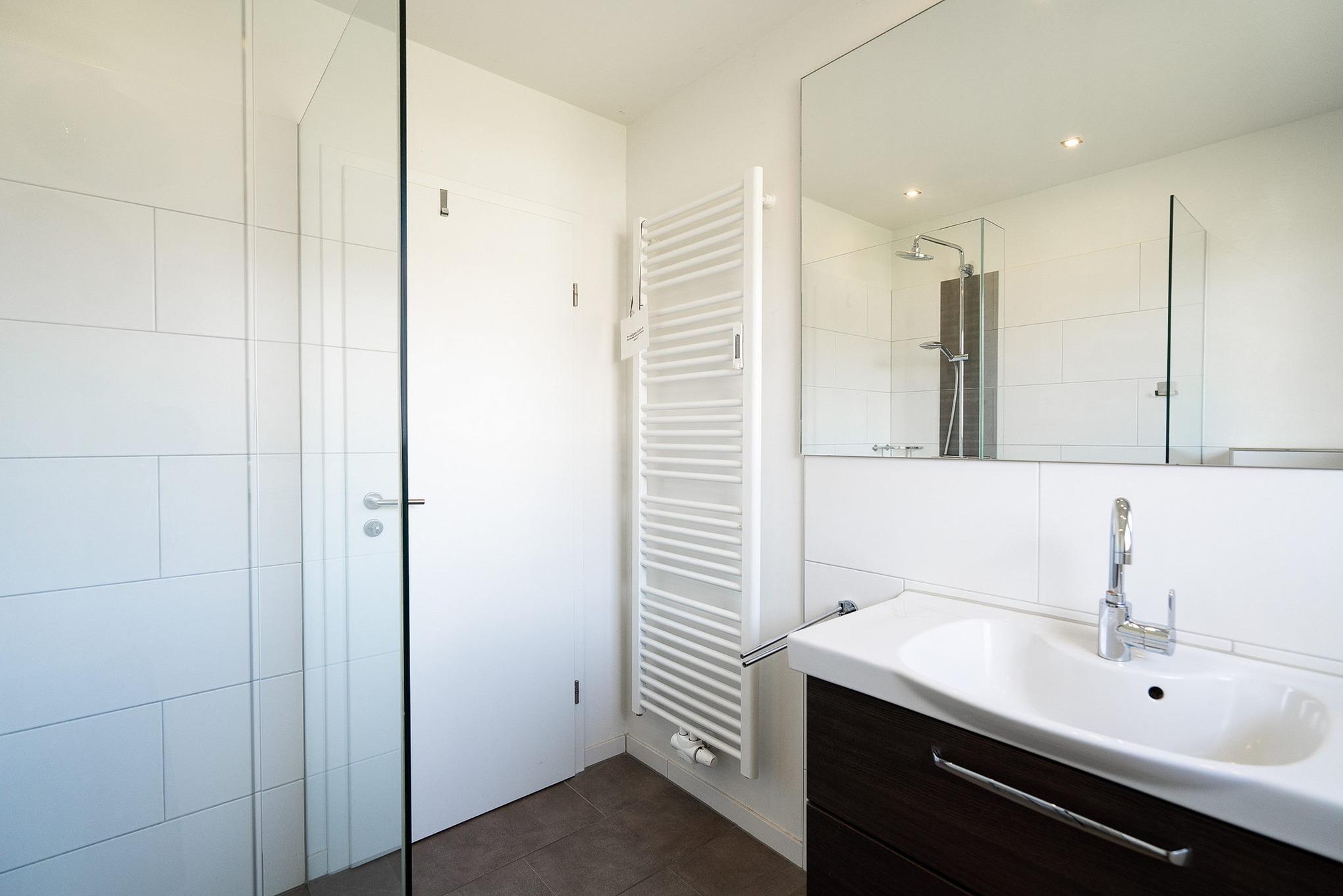 Das moderne gestaltete Tageslichtbad verfügt über eine geräumige und ebenerdige Dusche, WC und Waschtischanlage mit großem Wandspiegel.