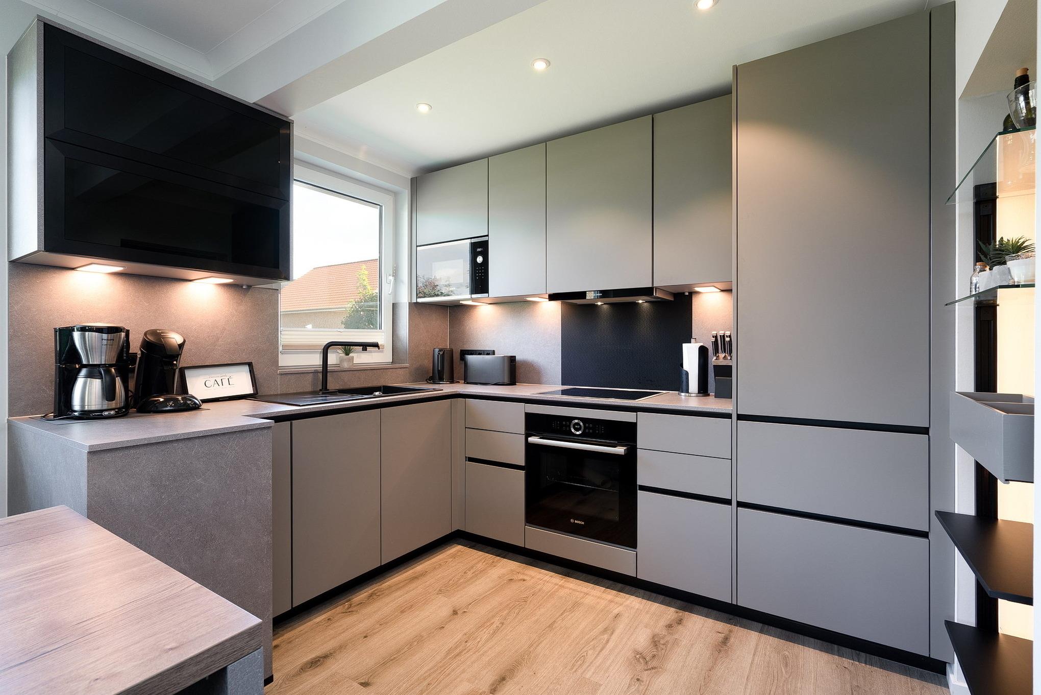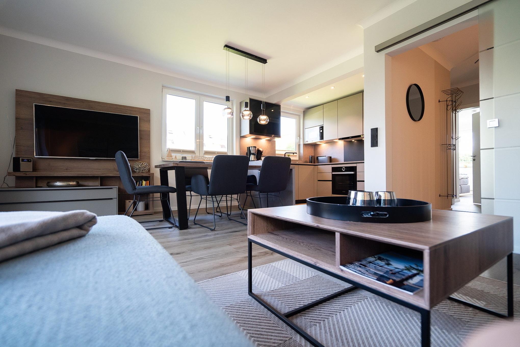 Die neue Küche wurde modern und sehr komfortabel ausgestattet: geräumiger Kühlschrank mit Gefrierfach, Backofen, Mikrowelle, Induktions-Kochfeld, Flachhaube, Geschirrspülmaschine und Kaffeemaschine. Am Esstisch können bis zu 5 Personen bequem Platz nehmen. Im Wohnbereich lädt das Stoff-Ecksofa zum Relaxen ein. Zu Ihrer Unterhaltung steht ein großer 55" Flachbildschirm-TV und ein Radio zur Verfügung. Der gesamte Bereich wurde durchgängig mit einem pflegeleichten, modernen Designboden ausgelegt.