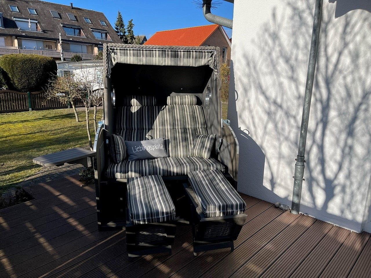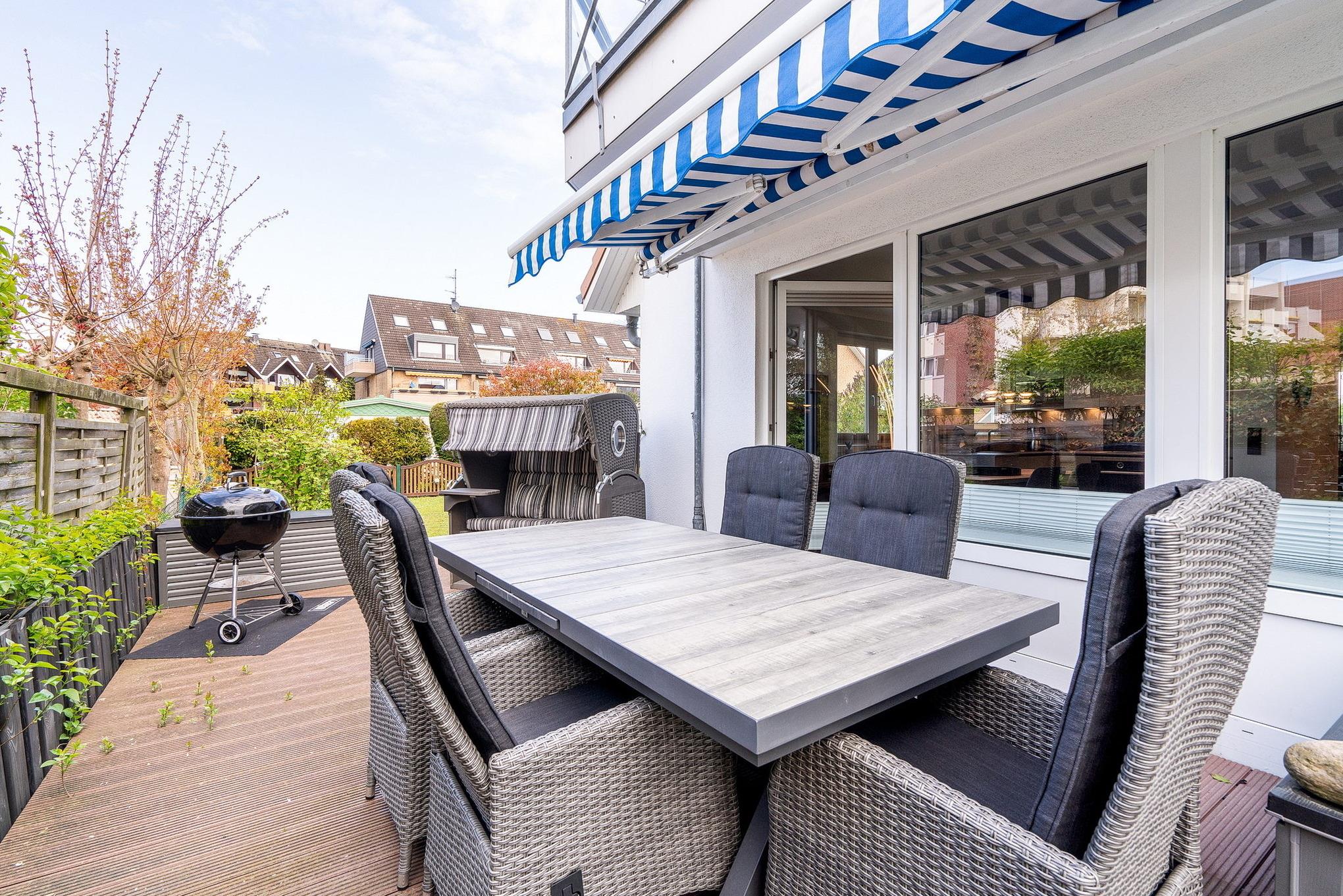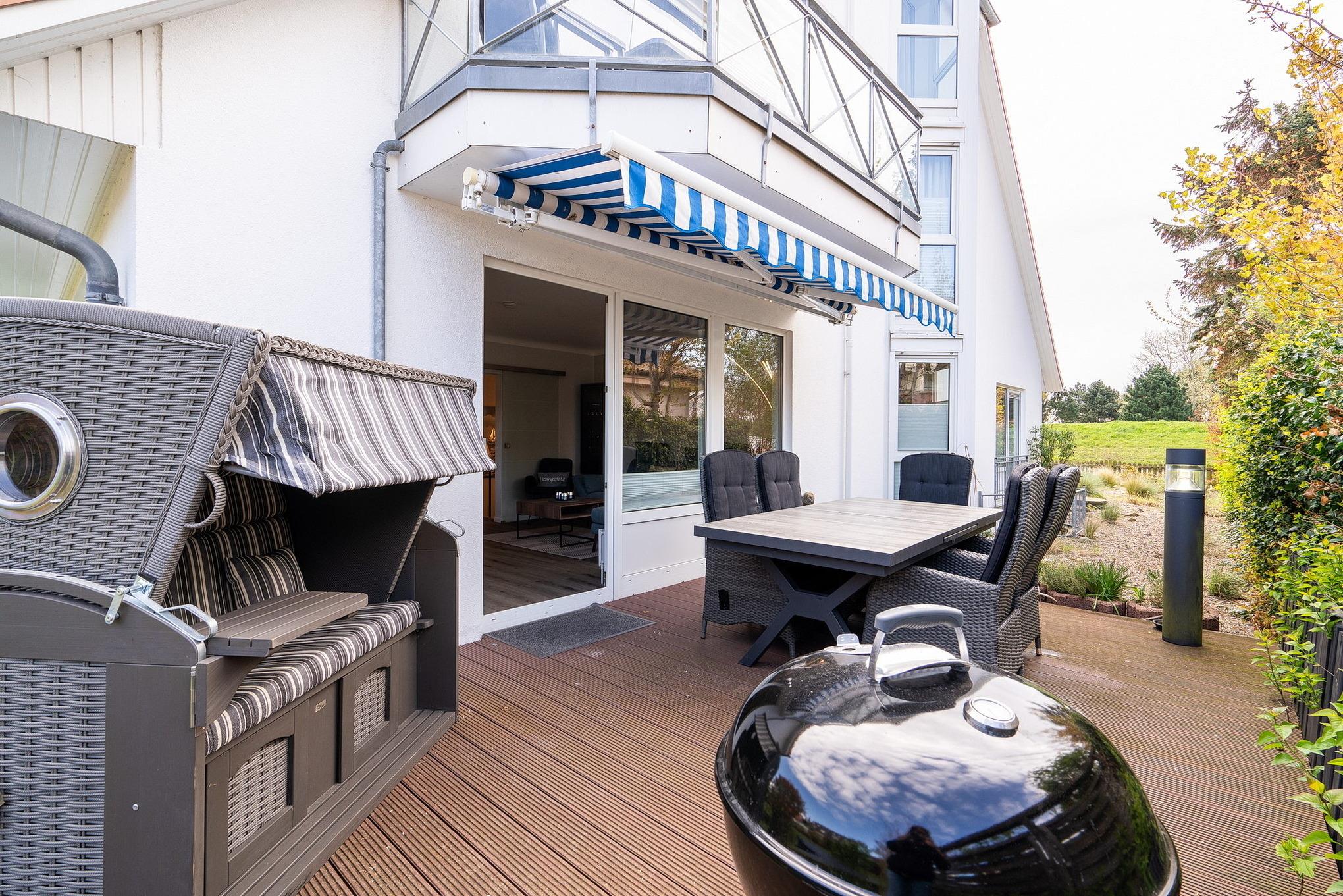Vom Wohn-Essbereich haben Sie direkten Zugang zur großen Terrasse, in westlicher Richtung, die ebenfalls mit viel Komfort ausgestattet wurde: großer Tisch mit Holzkeramikplatte, Rattan Stühle mit verstellbaren Rücklehnen, Markise sowie einen Standkorb. Hier können Sie Ihren Urlaubstag ganz entspannt starten oder in der Abendsonne ausklingen lassen. Gönnen Sie sich diese Oase der Entspannung.[nbsp][nbsp]