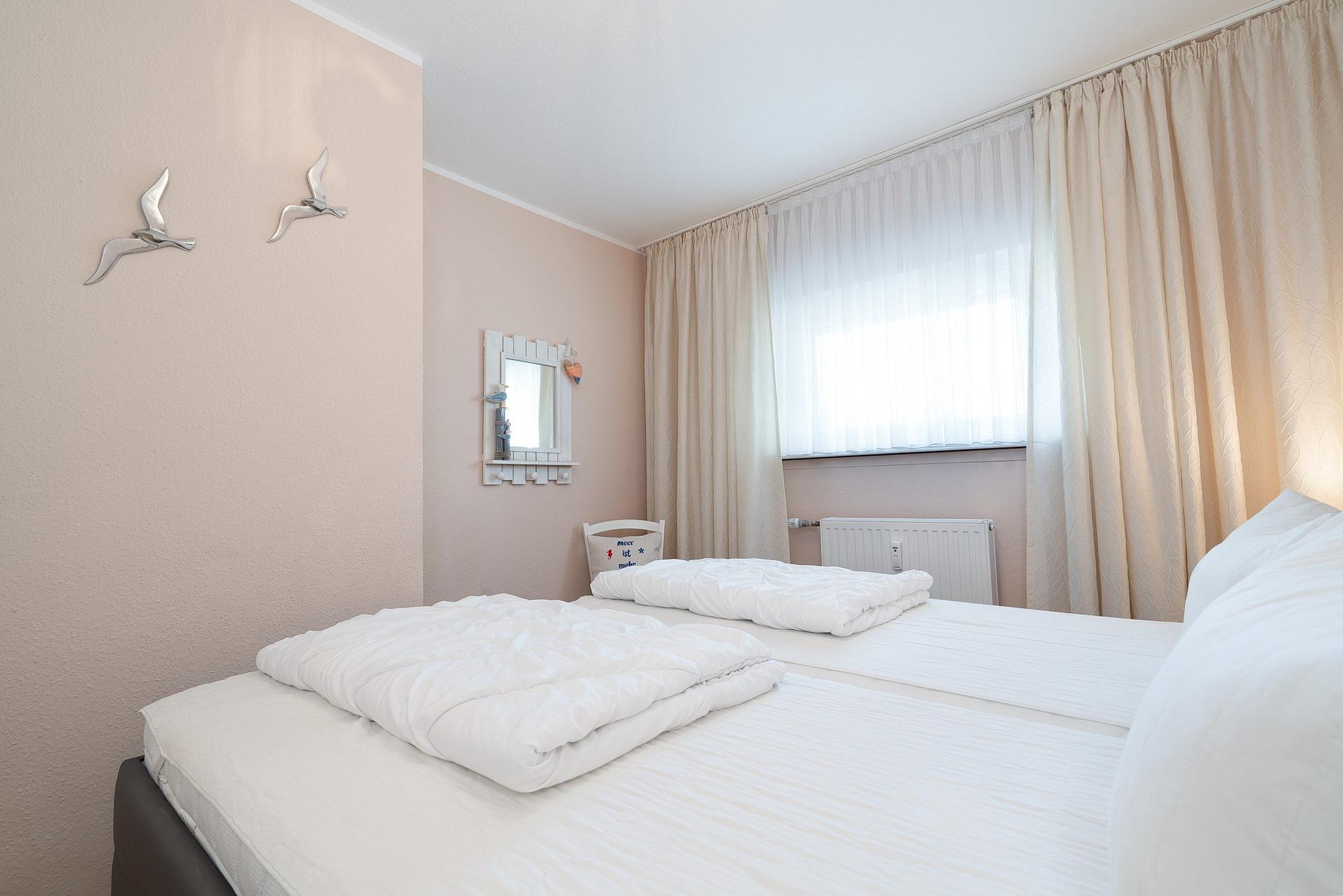 Modernes, gefliestes Schlafzimmer mit Polsterbett. Das Schlafzimmer ist mit einem Polster-Doppelbett (2x 90cm x 200cm) mit verstellbarem Lattenrost (Kopf- und Fußteil), 2 Nachttischen und einem Kleiderschrank ausgestattet. Das Fenster zum Laubengang lässt sich durch einen Außenrolladen und einer Gardine verdunkeln.