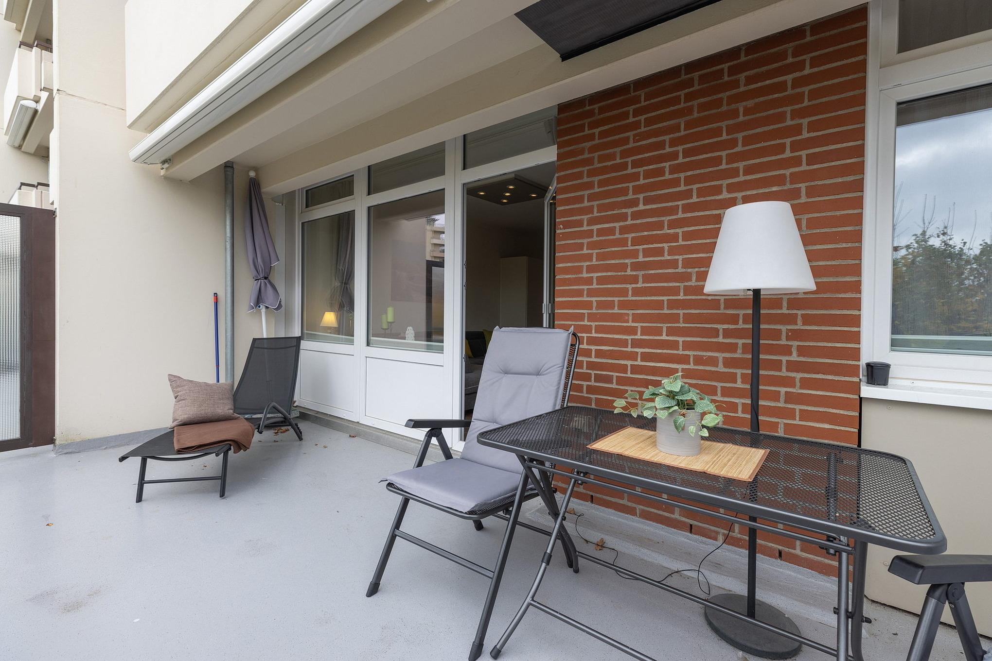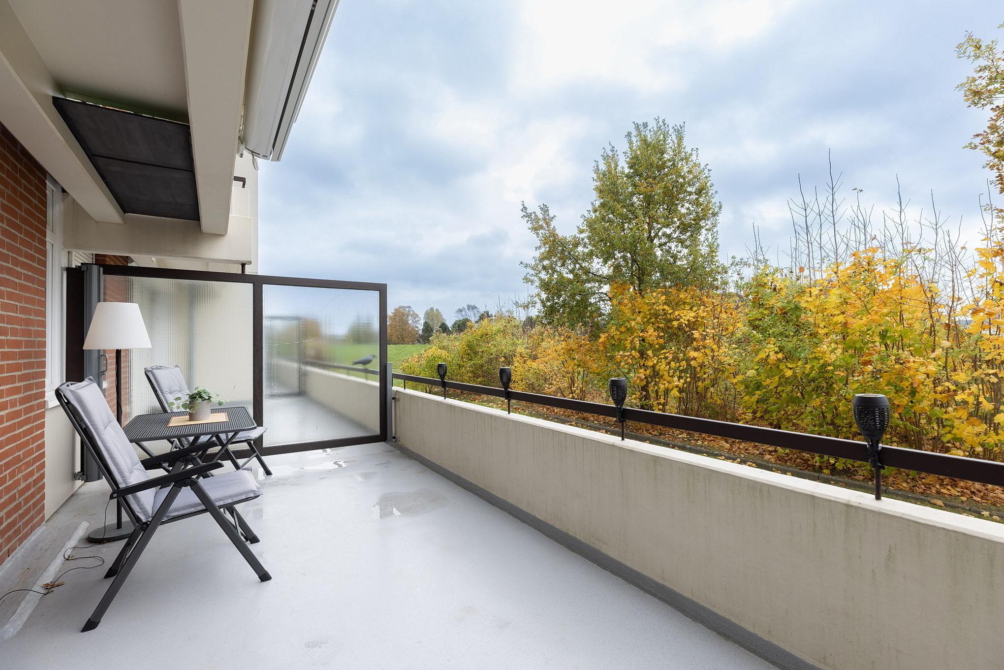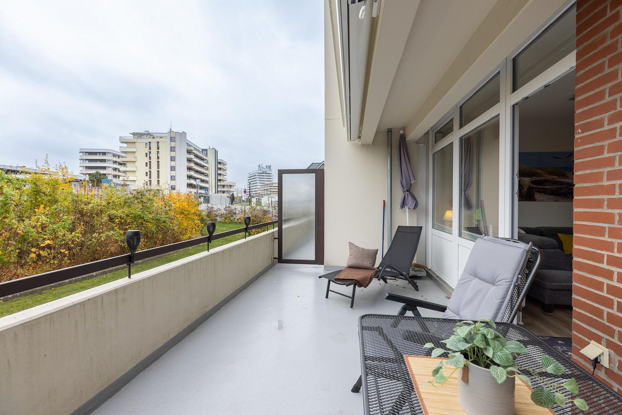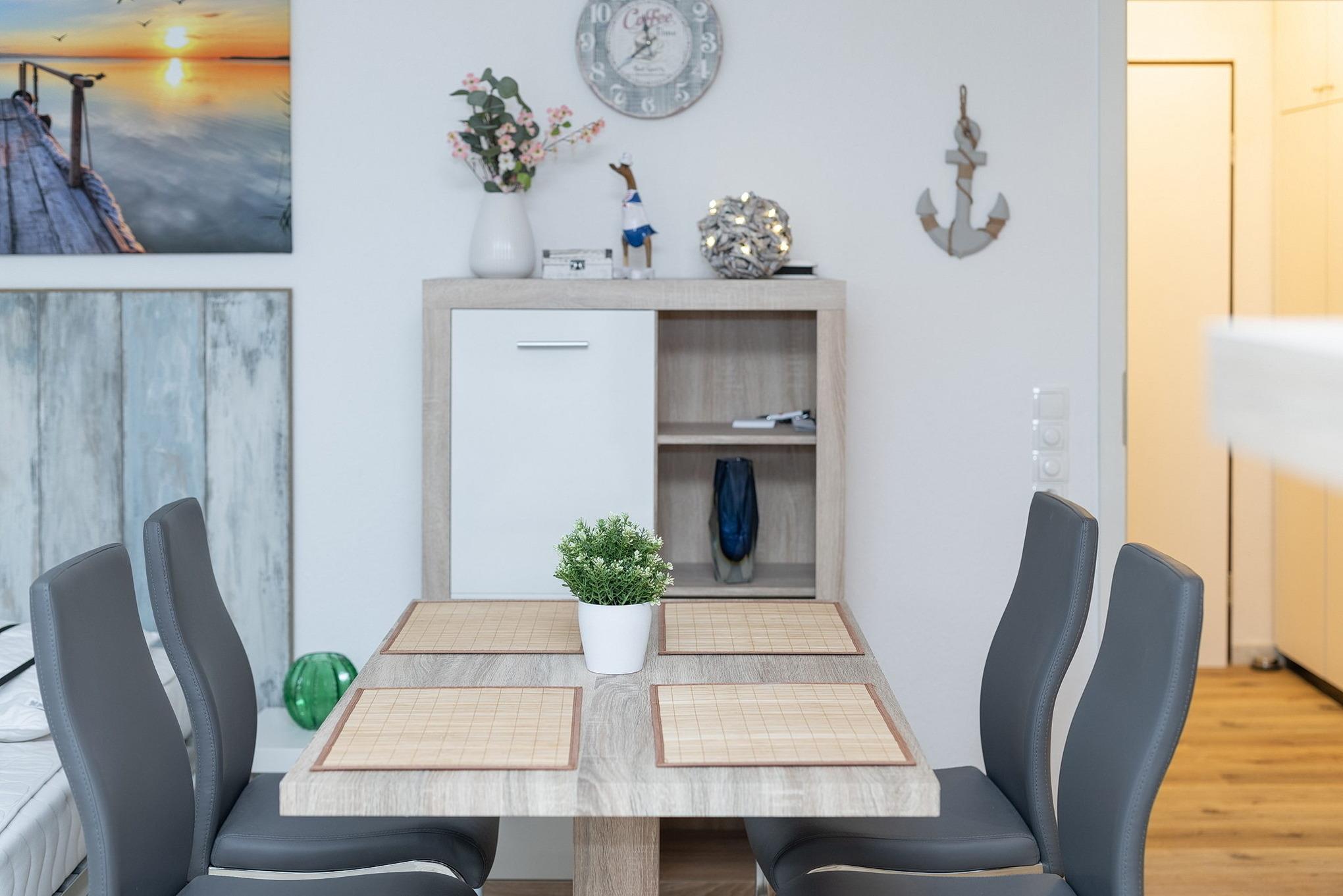 Heller moderner Wohnbereich mit direktem Zugang zum Balkon. Das moderne Wohnzimmer ist mit einem gemütlichen Ecksofa ausgestattet, einem Schrankbett (160x200) und einer Essecke für 4 Personen. Zur Unterhaltung steht Ihnen ein Flachbildfernseher, Radio und Blu-ray Player zur Verfügung. Der Raum ist mit Vinylboden ausgelegt. Die Fenster lassen sich durch dunkle Plissees leicht verdunkeln.