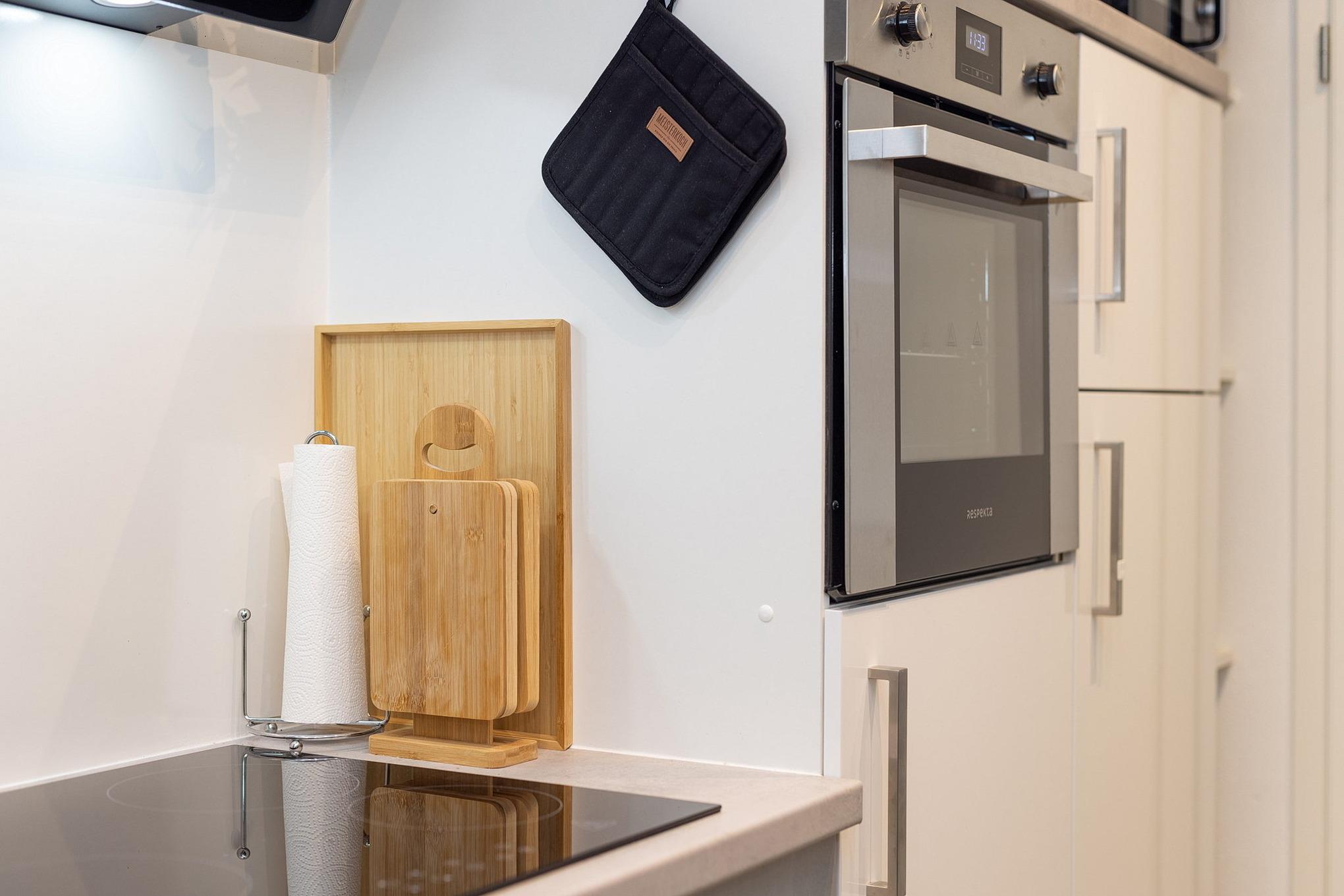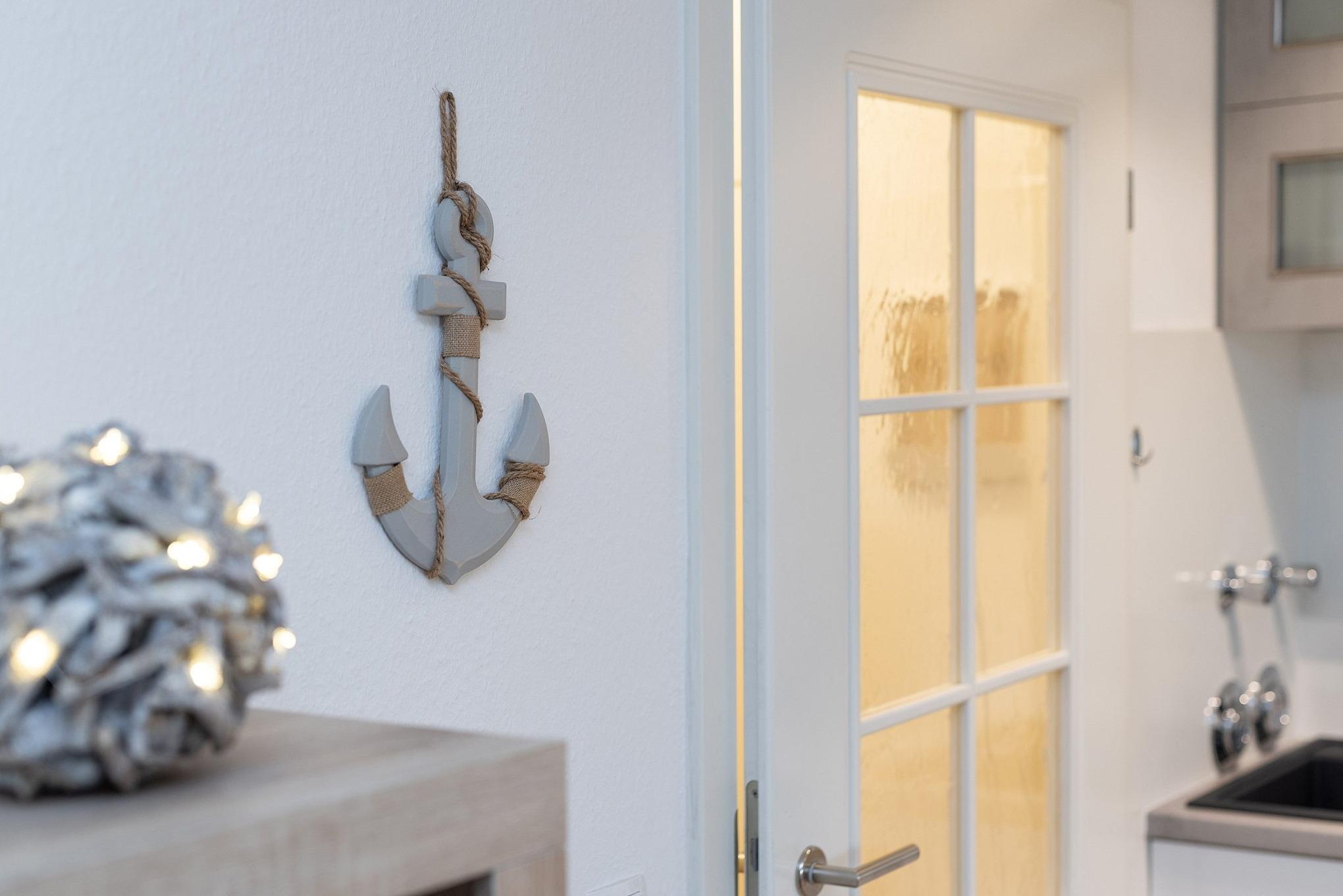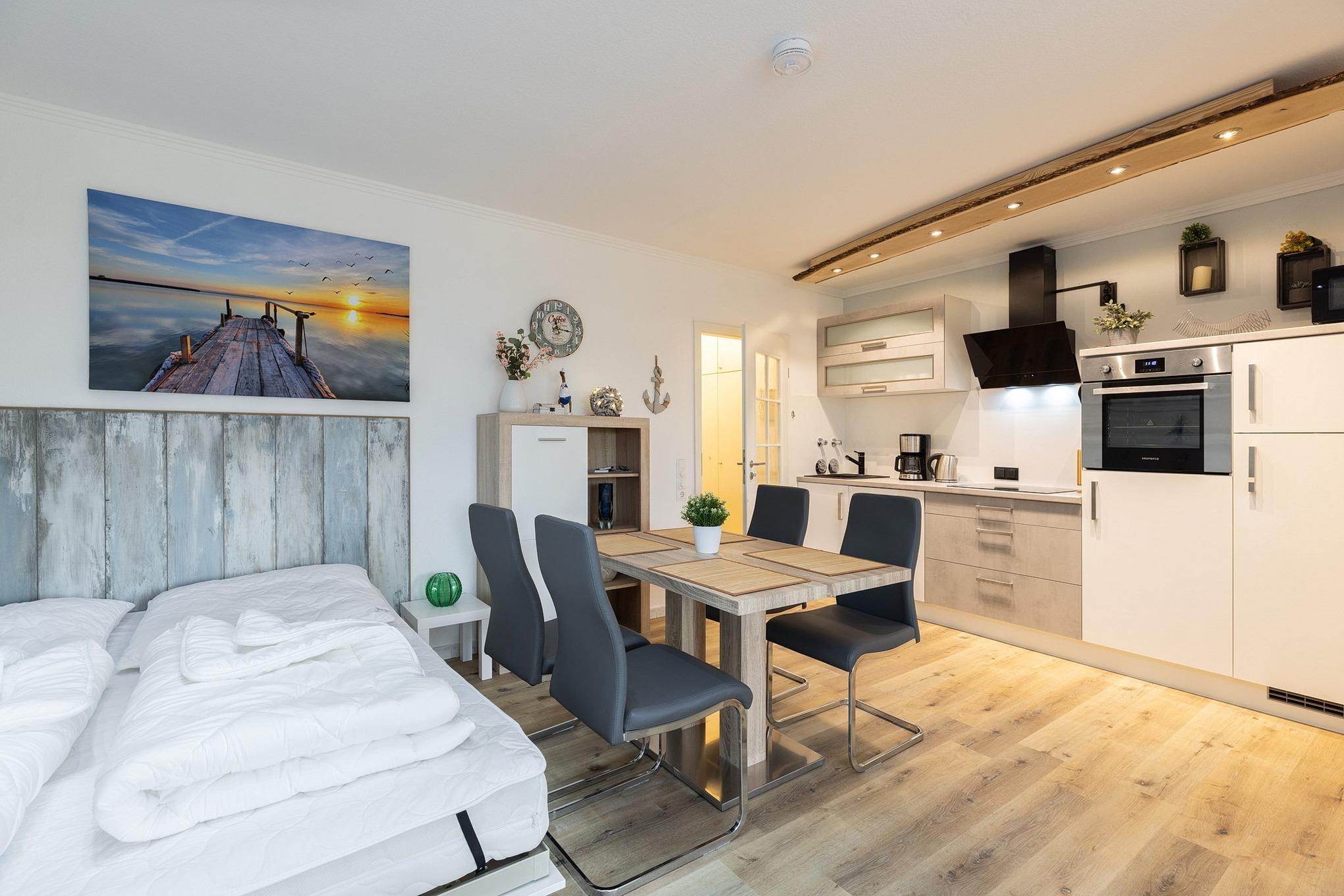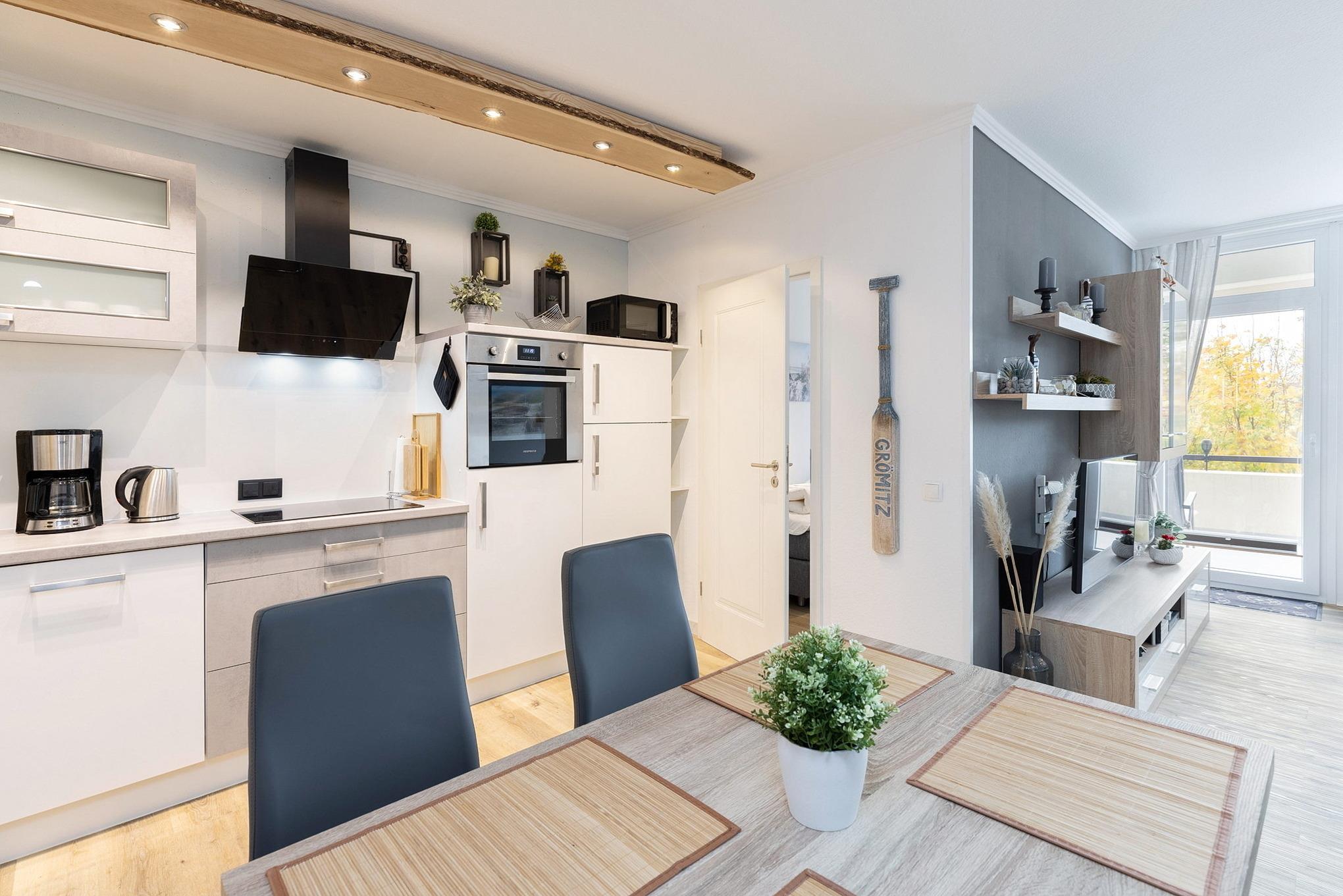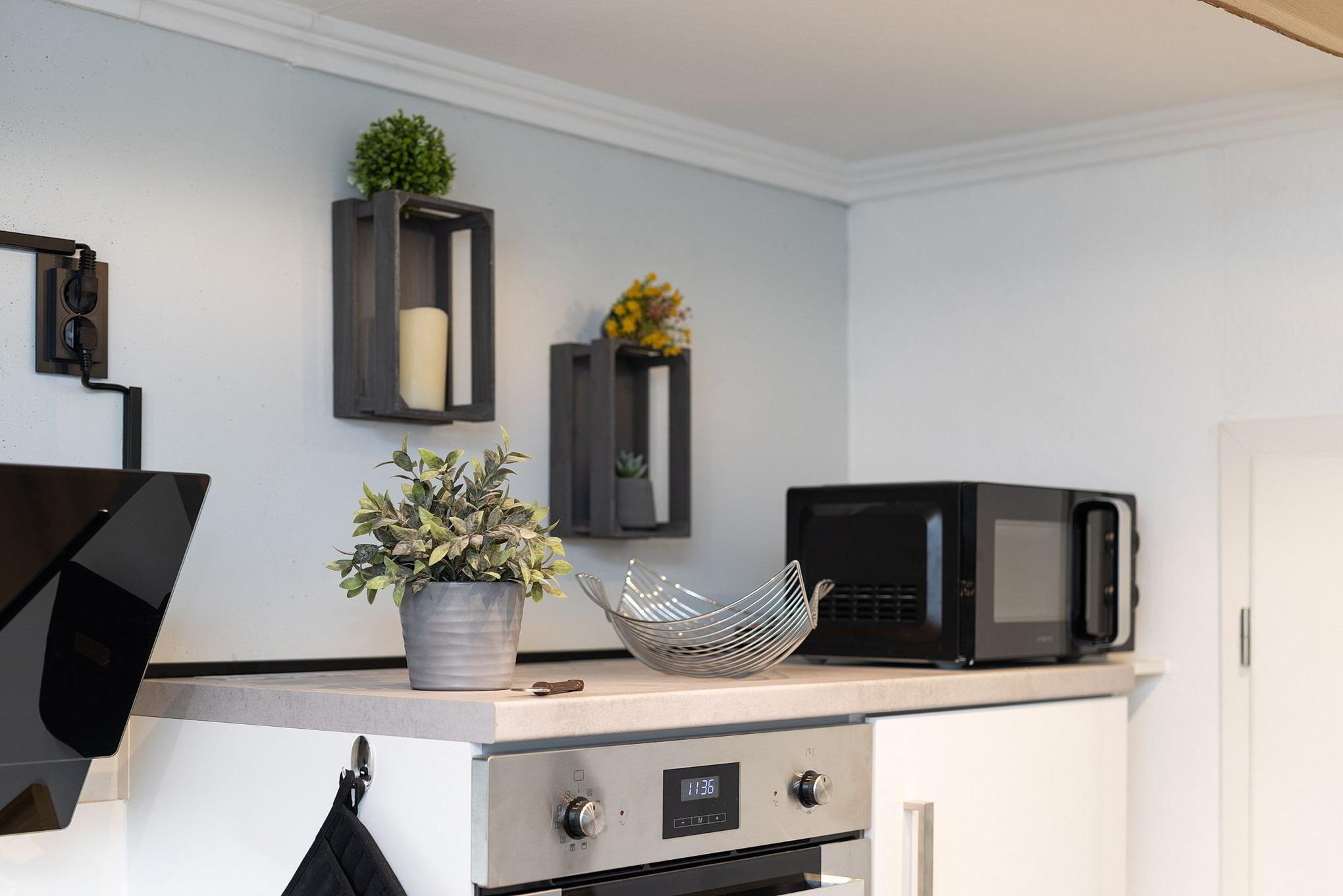 Komplett ausgestattete Küchenzeile mit 4-Platten-Cerankochfeld, Spülmaschine und Kühlschrank mit extra Gefrierfach sind vorhanden. Ein Wasserkocher, Mikrowelle, Backofen, Eierkocher, Toaster und eine Filter-Kaffeemaschine stehen Ihnen zur Verfügung.