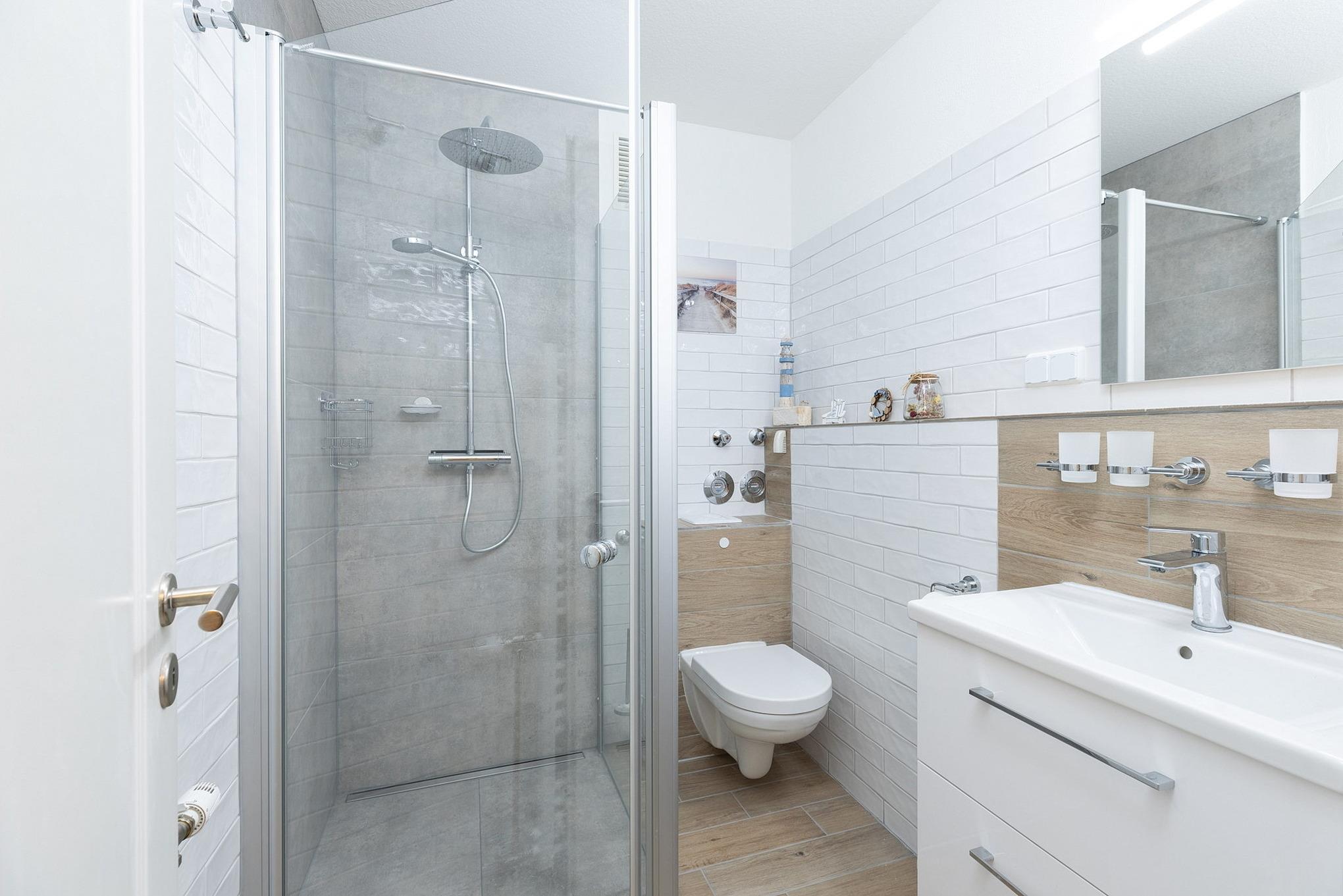 Helles freundliches Badezimmer mit WC, Waschbecken und Dusche. Es steht Ihnen ein Fön zur Verfügung.