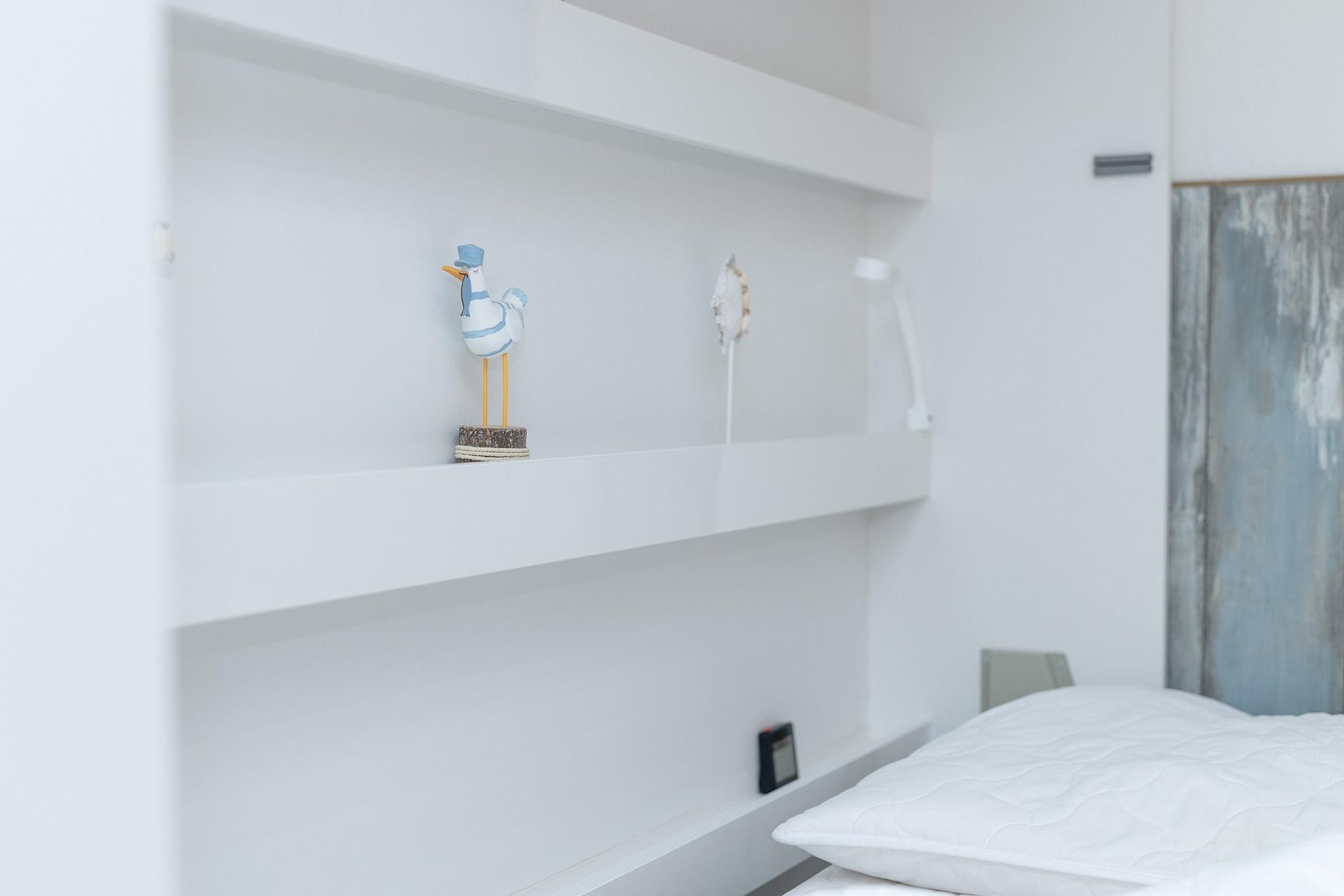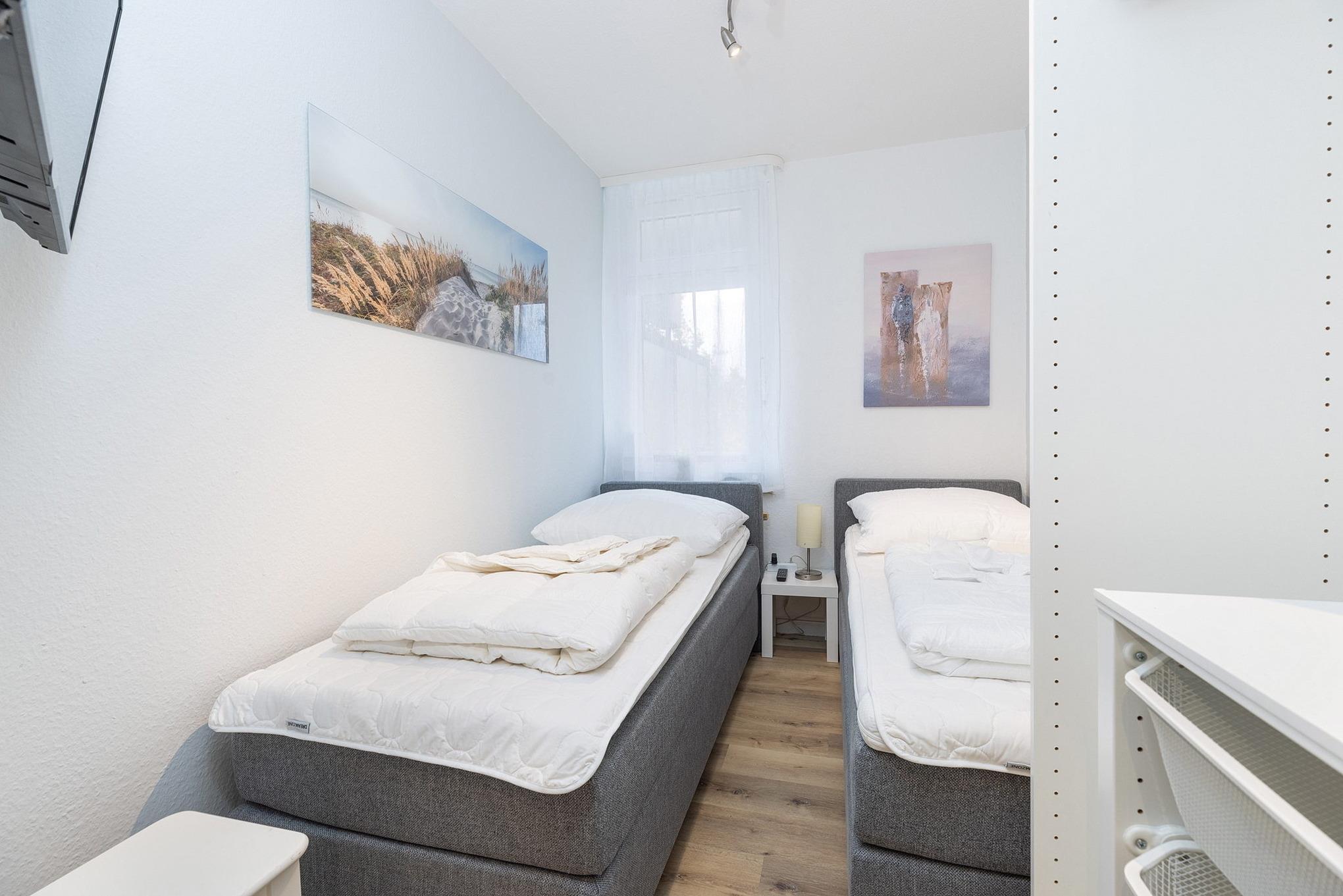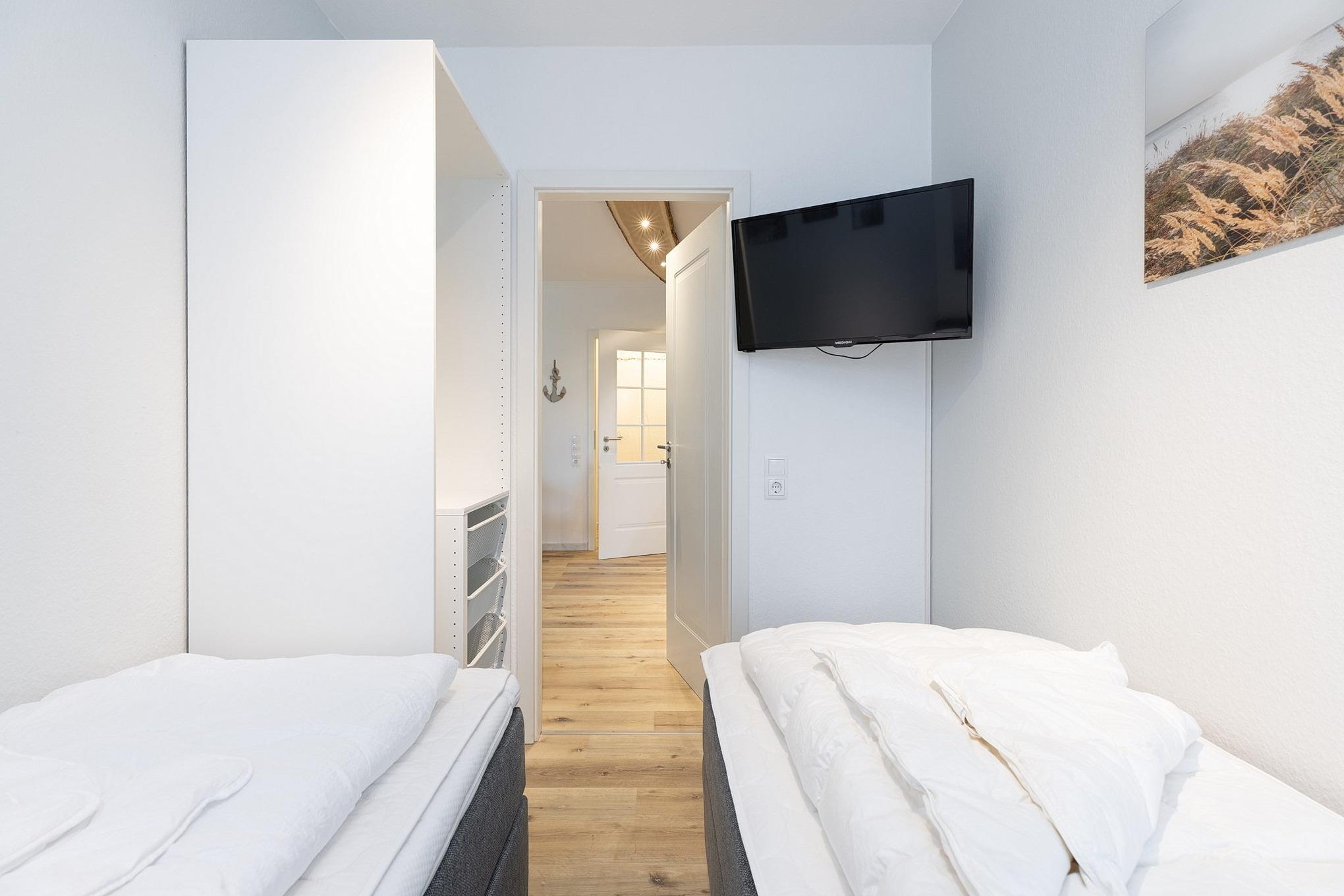Kleines gemütliches Schlafzimmer mit 2 Einzelbetten (je 80 x 2,00). Ein Kleiderschrank ist vorhanden. Der Schlafraum ist mit Vinylboden ausgelegt und lässt sich durch ein dunkles Plissee leicht verdunkeln. Zur Unterhaltung steht Ihnen ein Flachbildfernseher und Radio zur Verfügung.