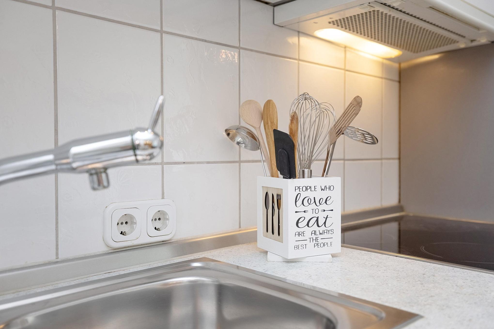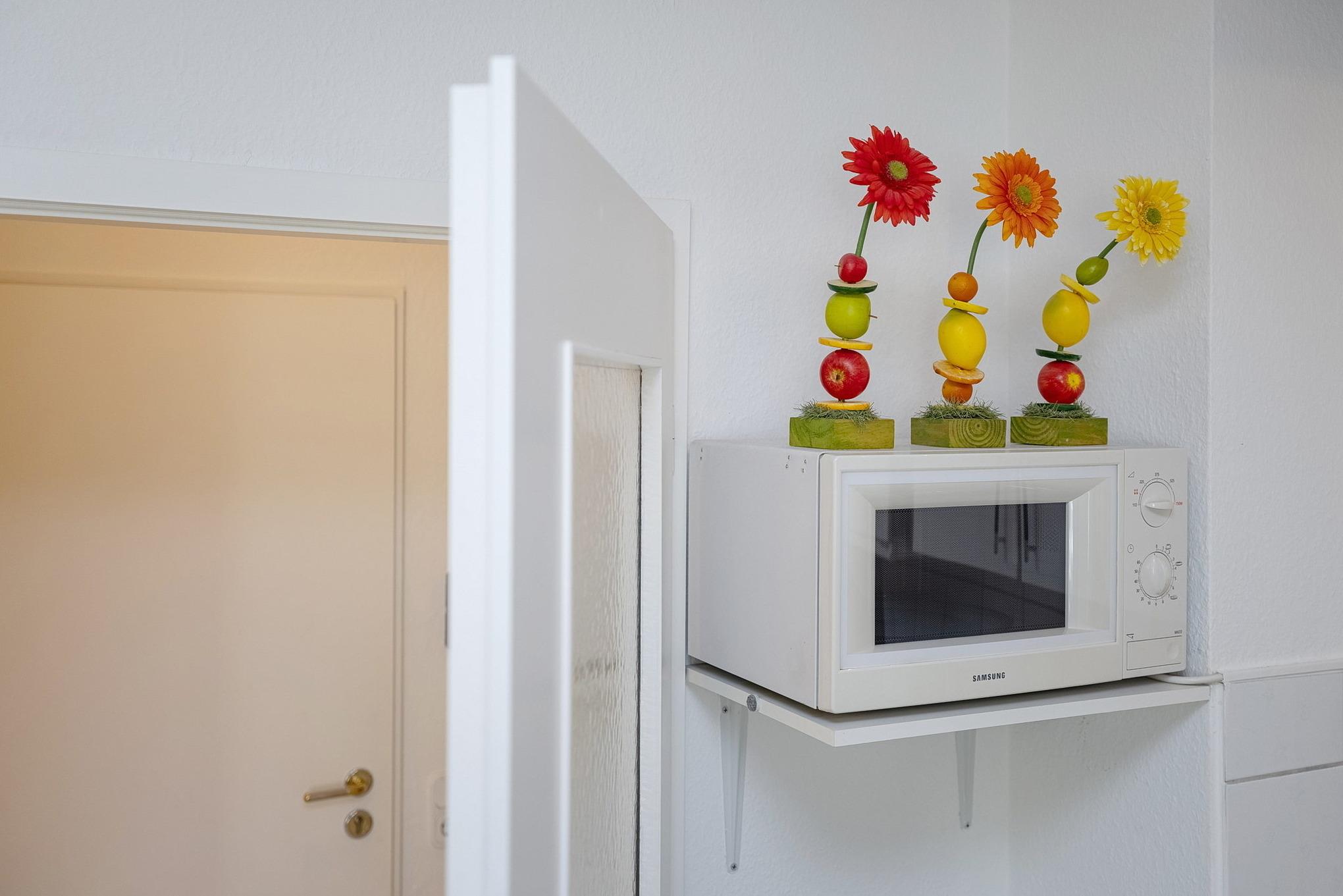 Moderne, zum Wohn- und Esszimmer offene, komplett ausgestattete Küche mit 4-Platten Cerankochfeld, Backofen, Mikrowelle, Kühlschrank, Kaffeemaschine, Wasserkocher und Toaster.