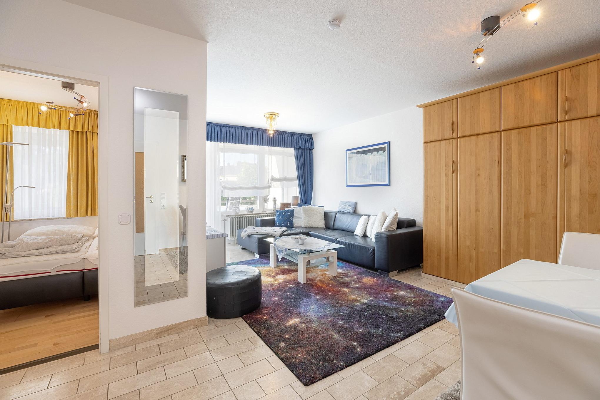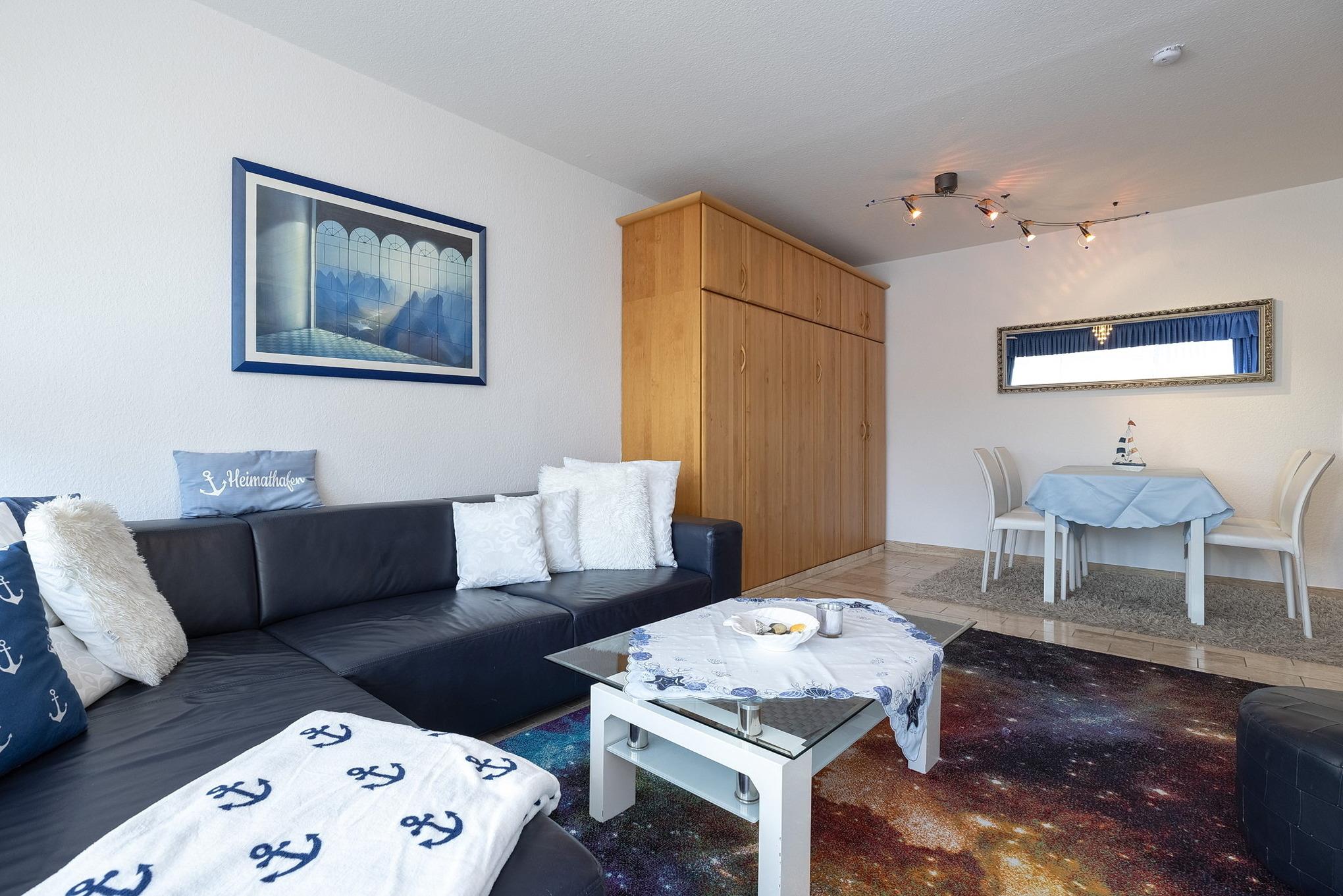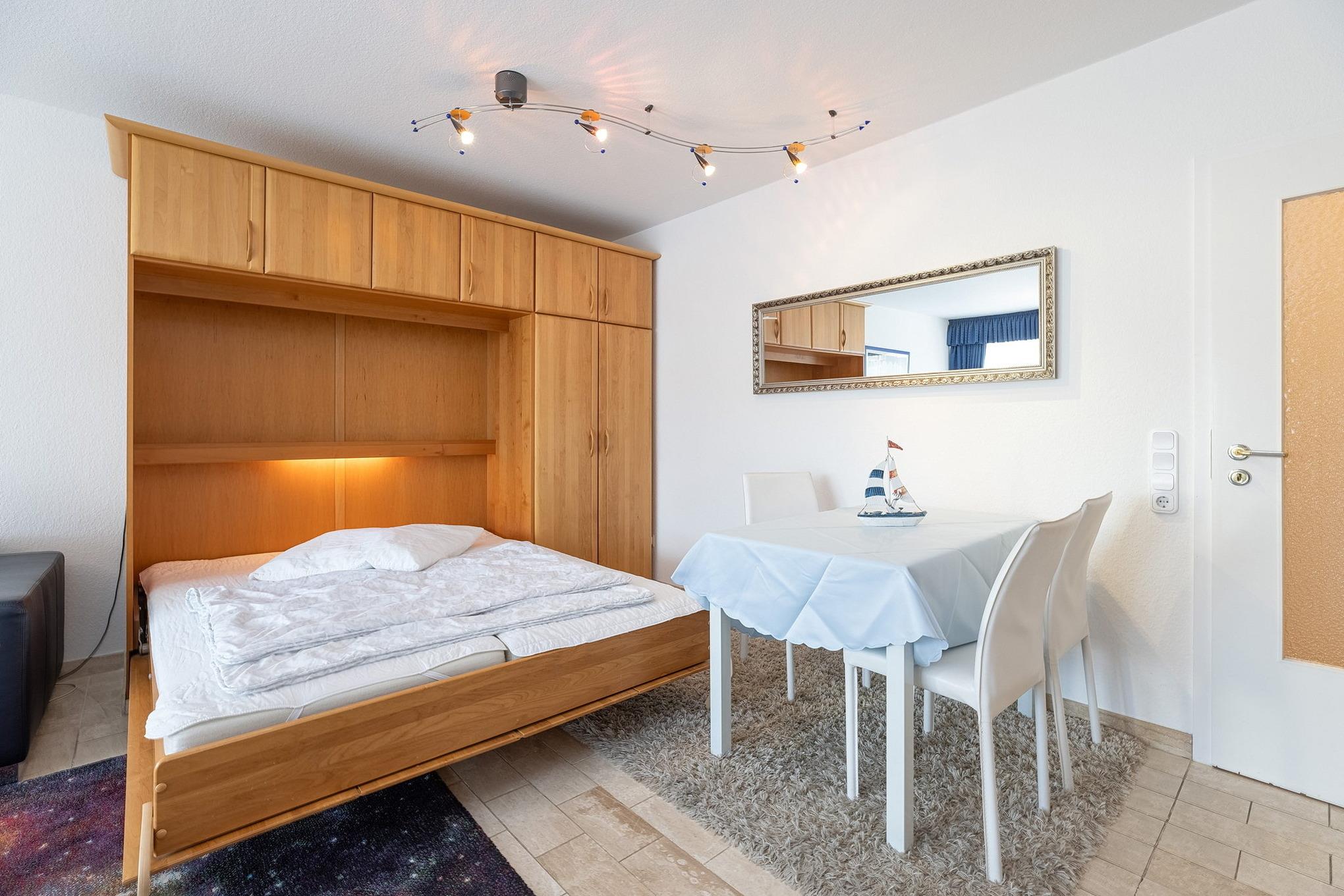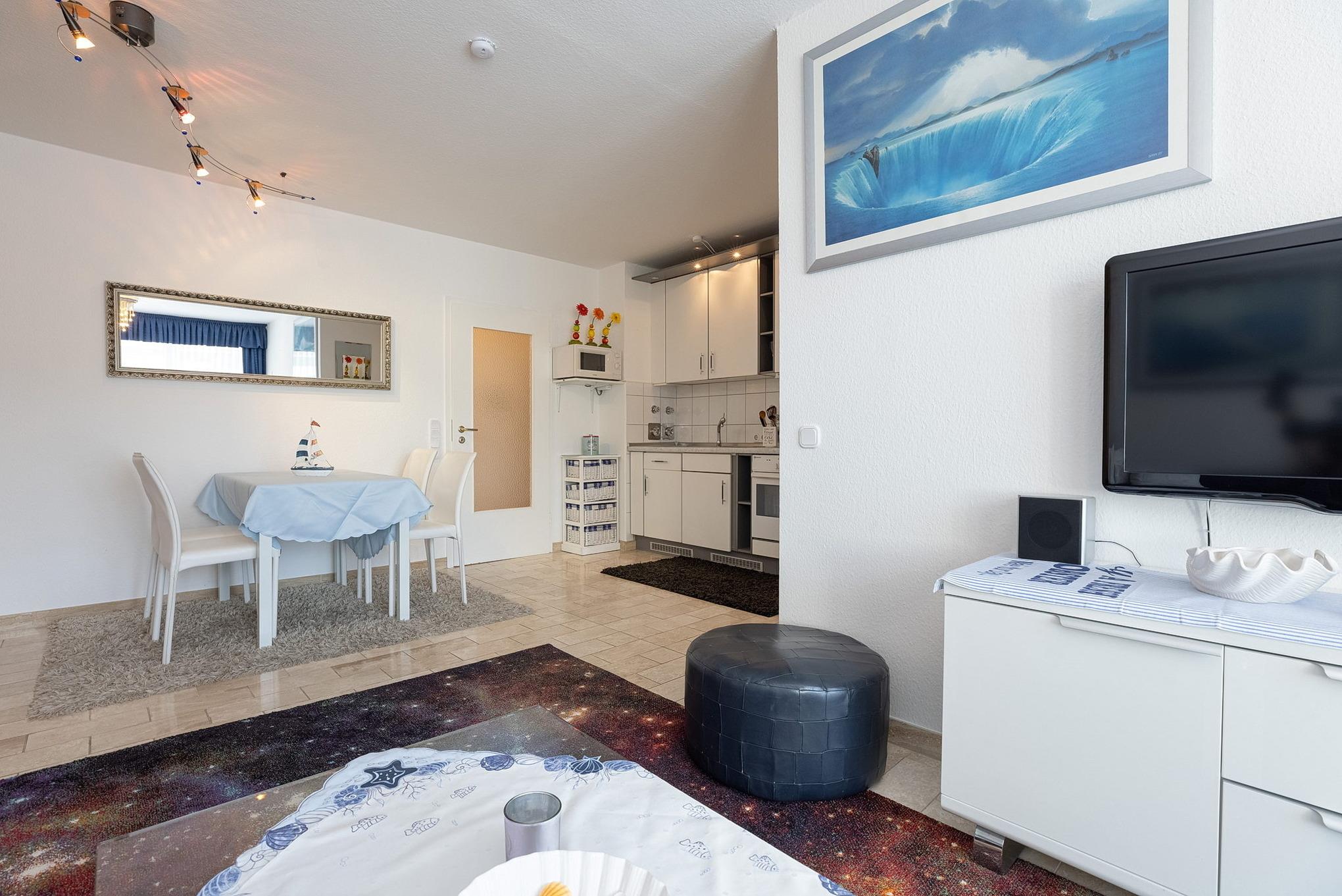 Modernes, freundliches Wohn- und Esszimmer mit direktem Zugang zum großen Balkon. Das Wohn- und Esszimmer ist mit einem Essplatz für 4 Personen, einer Eckcouch und einem Sessel, einem Couchtisch und einen Schrankbett (2x 80x200cm) und einem Kleiderschrank ausgestattet. Zur Unterhaltung steht ein Fernseher zur Verfügung. Das Wohn- und Esszimmer ist gefliest, das Fenster lässt sich durch eine blickdichte Gardine verdunkeln.