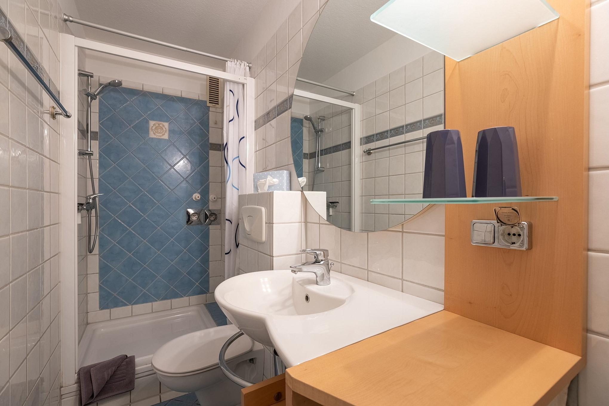 Modernes, hell gefliestes Bad mit Dusche, Waschbecken und WC.