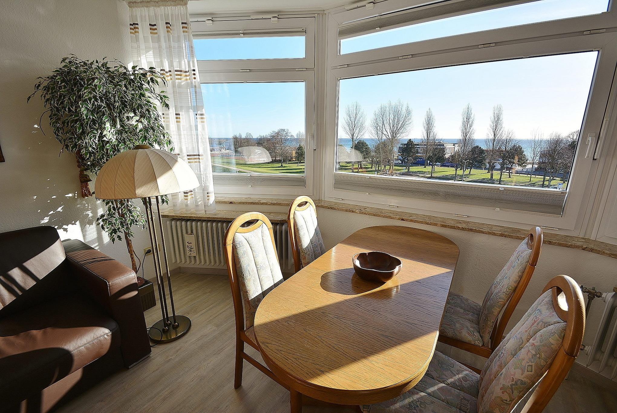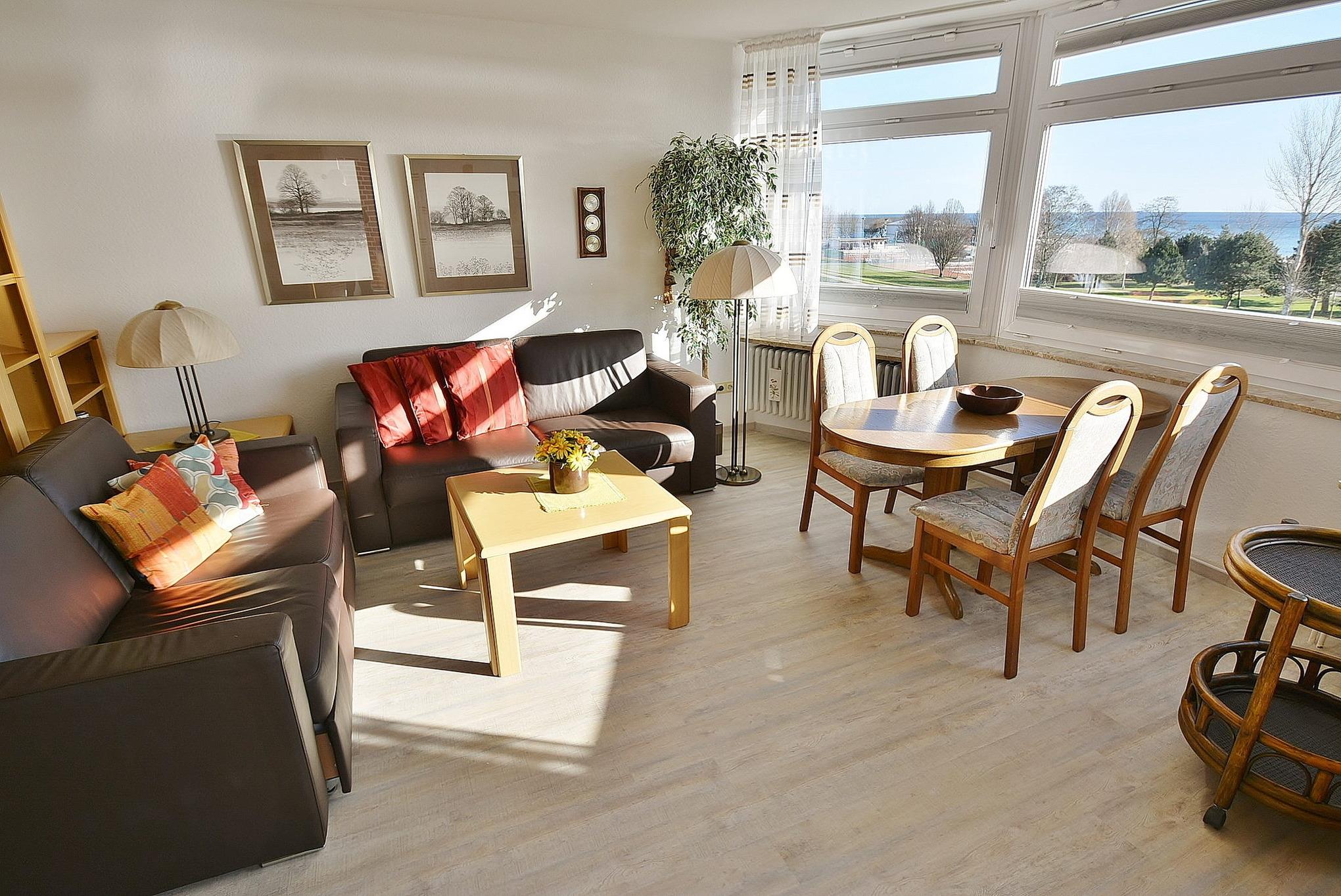Helles, freundliches Wohn- und Esszimmer mit offener Küche. Der Wohn- und Essbereich ist mit einer Schlafcouch (150 x 200cm), einer Couch, einem Couchtisch, einem Essplatz für 4 Personen und einer Kommode ausgestattet. Vom Essbereich schöner Panorama-Ausblick auf den Deich und die Ostsee. Das Zimmer ist mit Laminatboden ausgelegt. Zur Unterhaltung stehen ein Flachbildfernseher und eine Mini-Stereoanlage zur Verfügung. Die Fenster lassen sich durch Plissees vollständig verdunkeln.