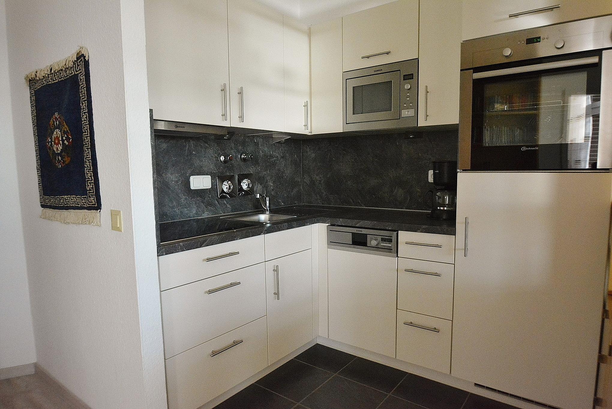 Moderne, komplett ausgestattete, zum Wohnbereich offene Küche mit 4-Platten Cerankochfeld, Backofen, Mikrowelle, Spülmaschine, Kühlschrank mit kleinem 3-Sterne Gefrierfach, Kaffeemaschine, Toaster und Wasserkocher.