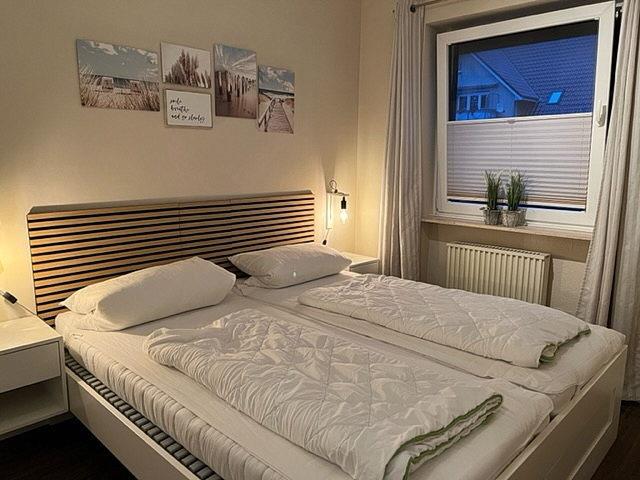 Modern ausgestattetes Schlafzimmer mit einem Doppelbett (2x 90x200cm), 2 Nachttischen, einem kleinen Kleiderschrank und einer Kommode. Das Schlafzimmer ist mit Laminatboden ausgelegt, das Fenster lässt sich durch einen Vorhang und einem Außenrollo vollständig verdunkeln.