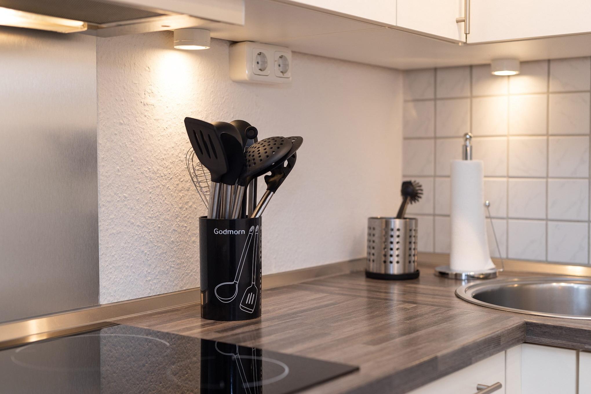 Komplett ausgestattete Küche mit 4-Platten E-Herd, Spülmaschine, Mikrowelle mit Grillfunktion, Kühlschrank mit kleinem 3-Sterne Gefrierfach, Wasserkocher und Kaffeemaschine.