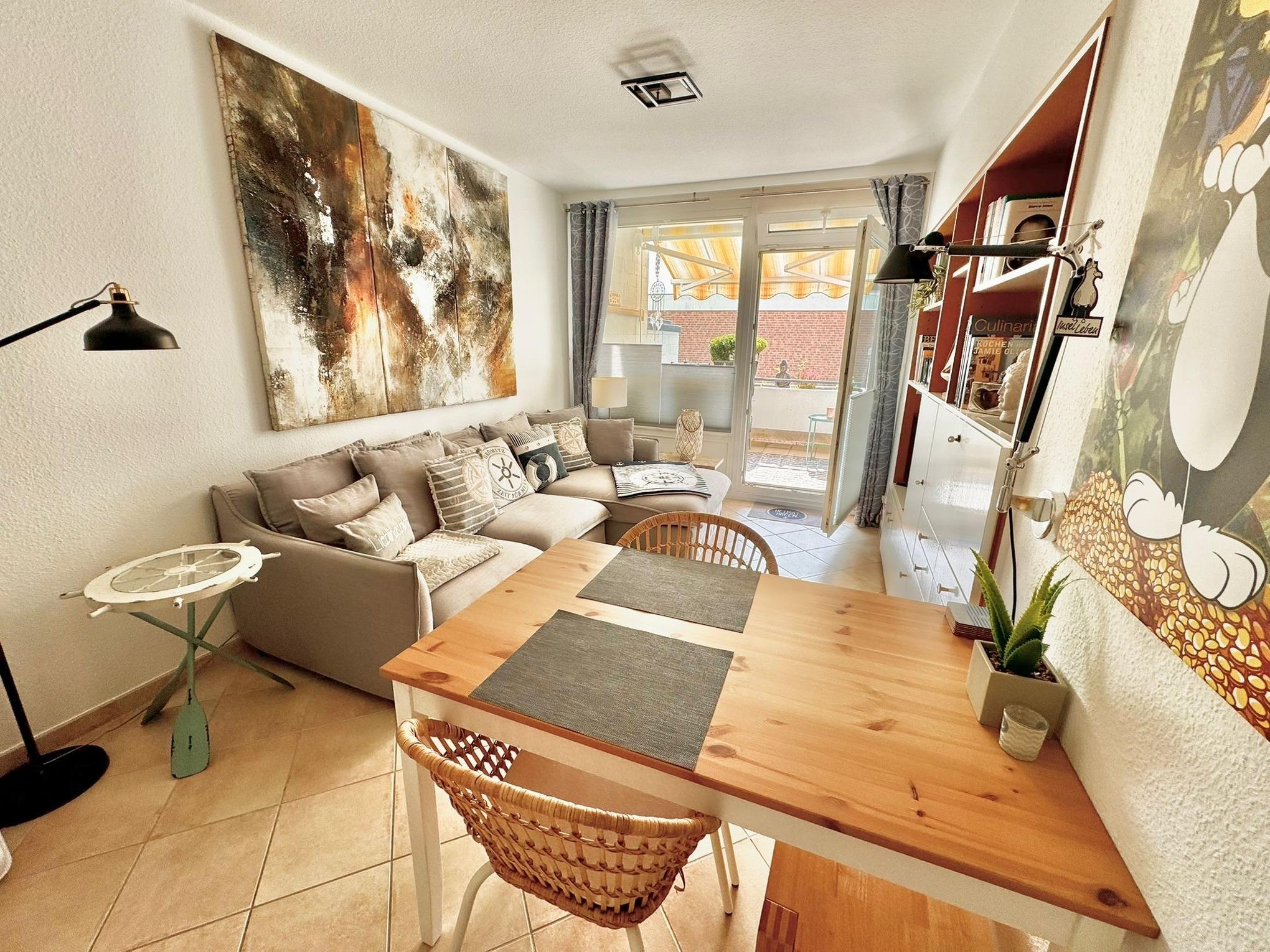Der helle Wohnbereich mit Esstisch für 4 Personen, gemütlichem Sofa und Wohnwand mit Flachbildfernseher führt direkt auf den sonnigen und windgeschützten süd-west- Balkon mit seitlichem Meerblick – ein idealer Ort, um die frische Meeresluft zu genießen.