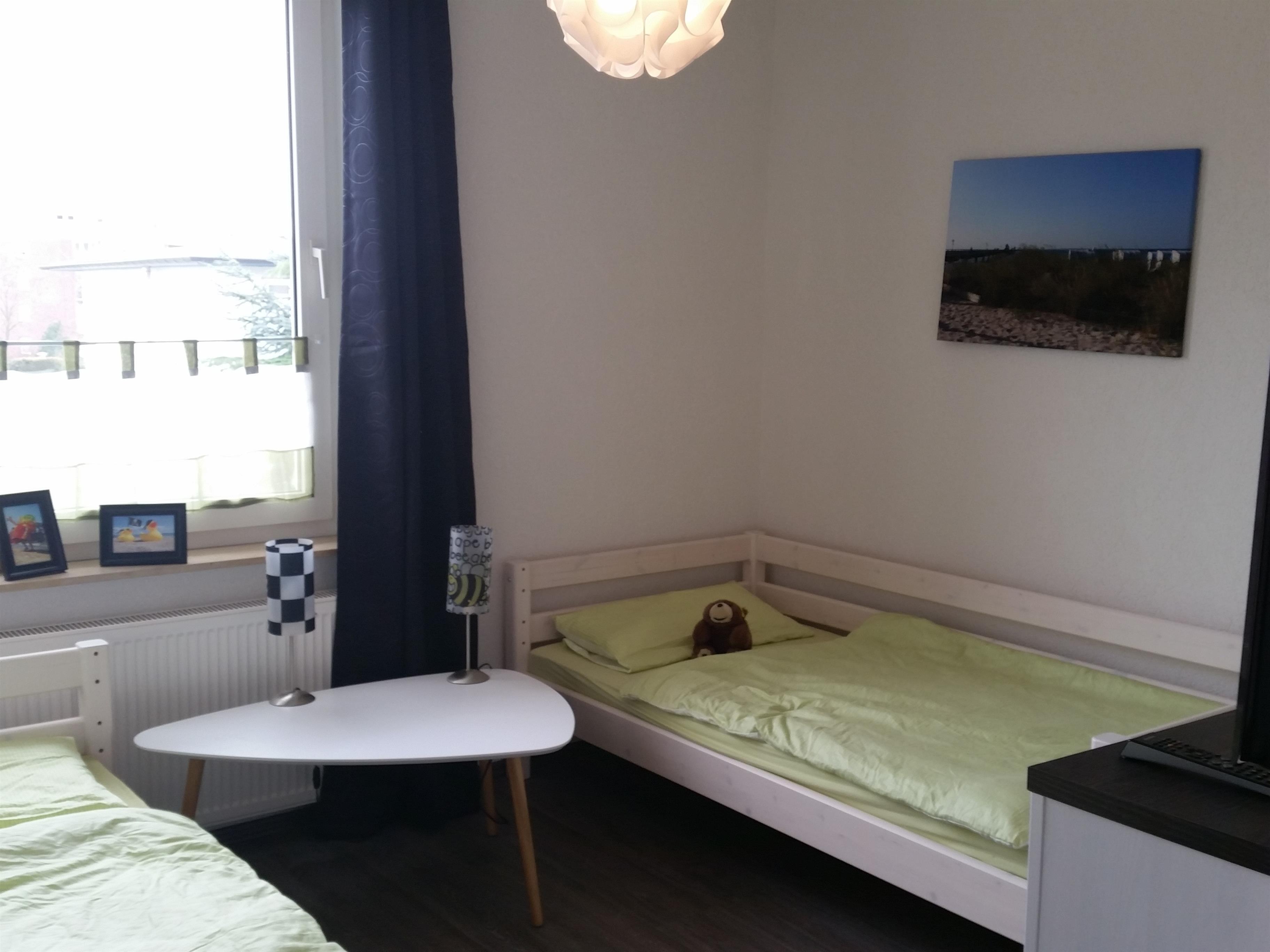 Ein weiteres Schlafzimmer bietet mit zwei Einzelbetten (90x200), einer Kommode und einem Smart-TV einen schönen Rückzugsort für Kinder. Auch im Wohnbereich steht ein Fernseher zur Verfügung.