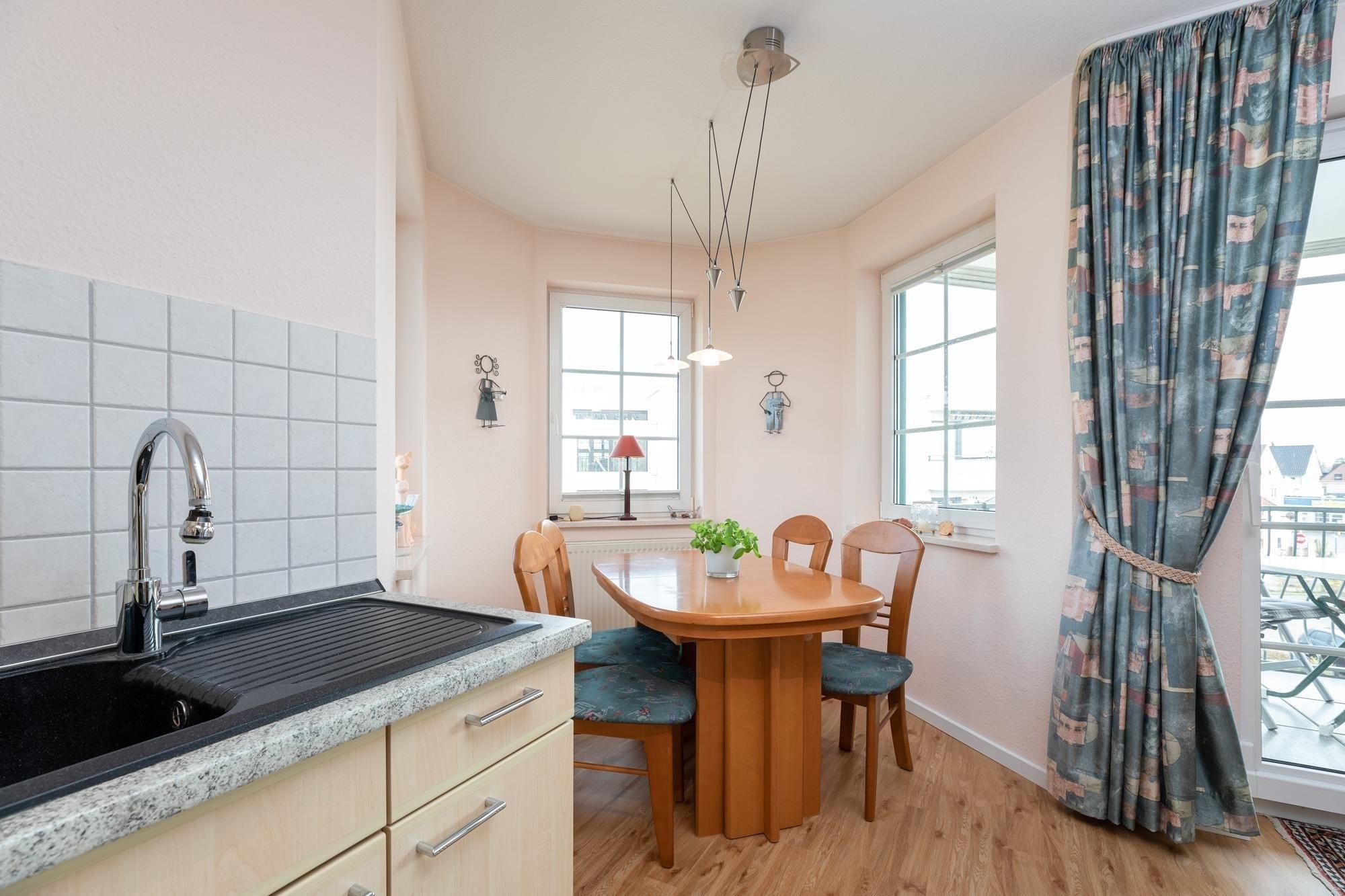 Auf ca. 55 m² Wohnfläche finden Sie reichlich Platz für Erholung und Entspannung. Der gemütliche Wohnraum mit offen gestalteter Küche bildet das Herzstück Ihres Feriendomizils. Ausgestattet mit Spülmaschine, Backofen, Kühlschrank mit Gefrierfach, Mixer, Toaster und vielem mehr, bietet die Küche perfekte Voraussetzungen für einen geselligen Kochabend. Auf Ihrem großzügigen Balkon genießen Sie zahlreiche Sonnenstunden.