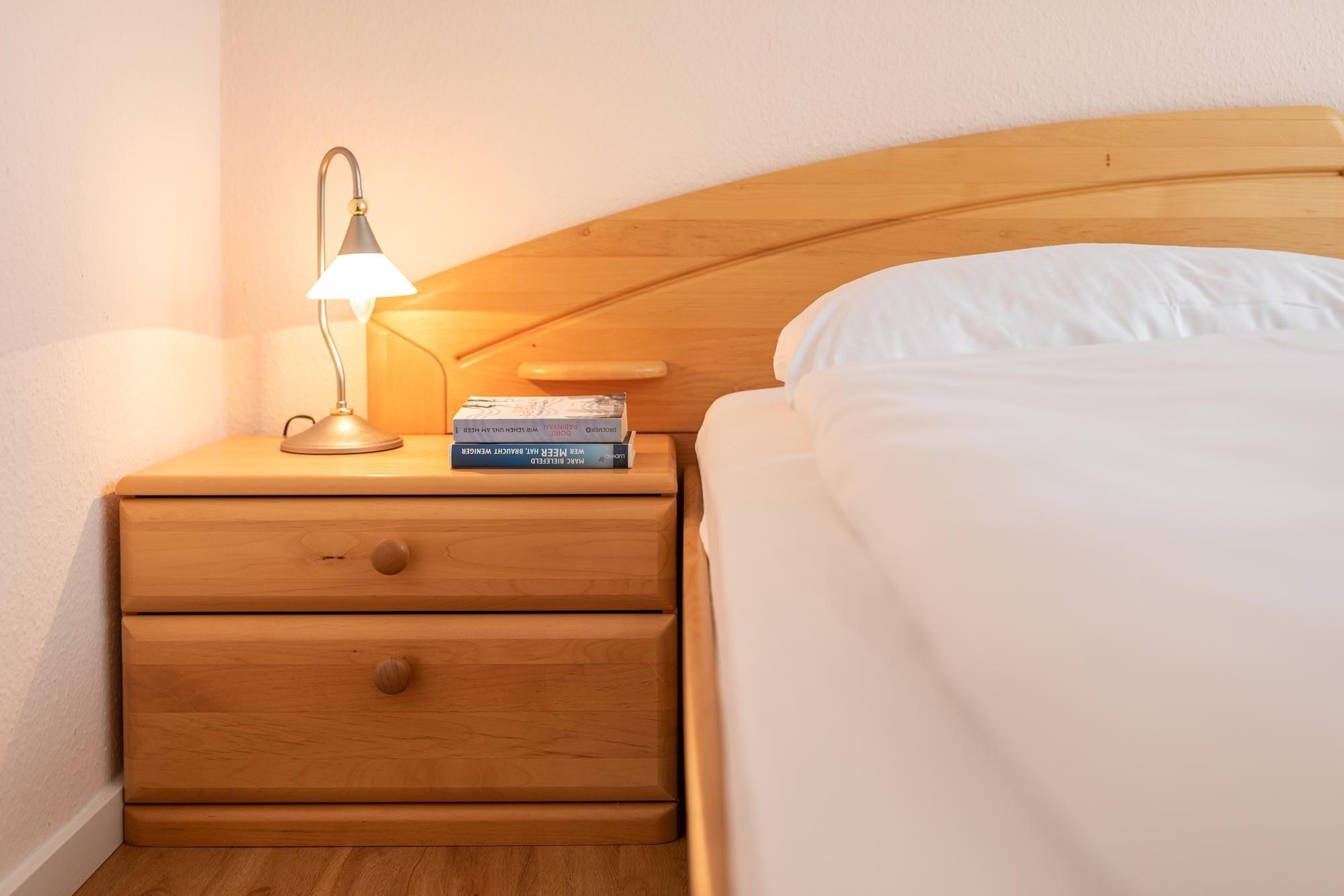 Nach einem ausgiebigen Strandtag finden Sie Ruhe und Entspannung in einem komfortablen Doppelbett (180x200 cm). Für zusätzliche Personen steht im Wohnzimmer eine Schlafcouch (140x220 cm) zur Verfügung.