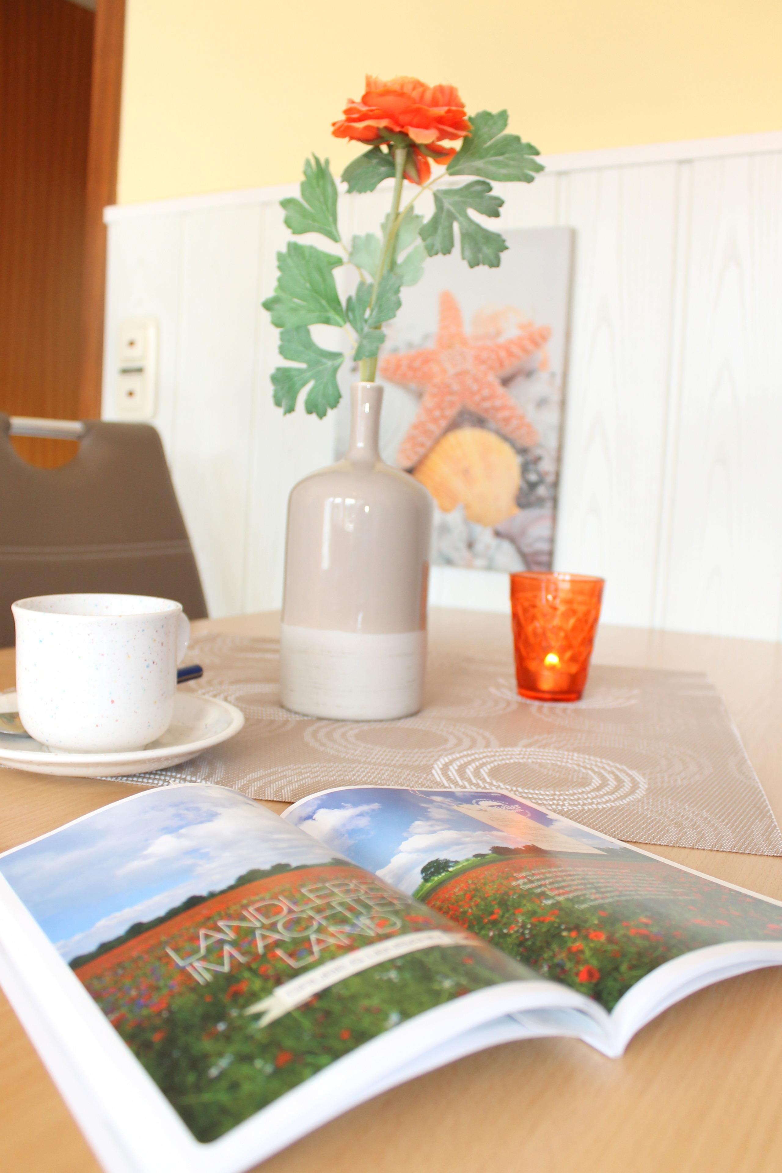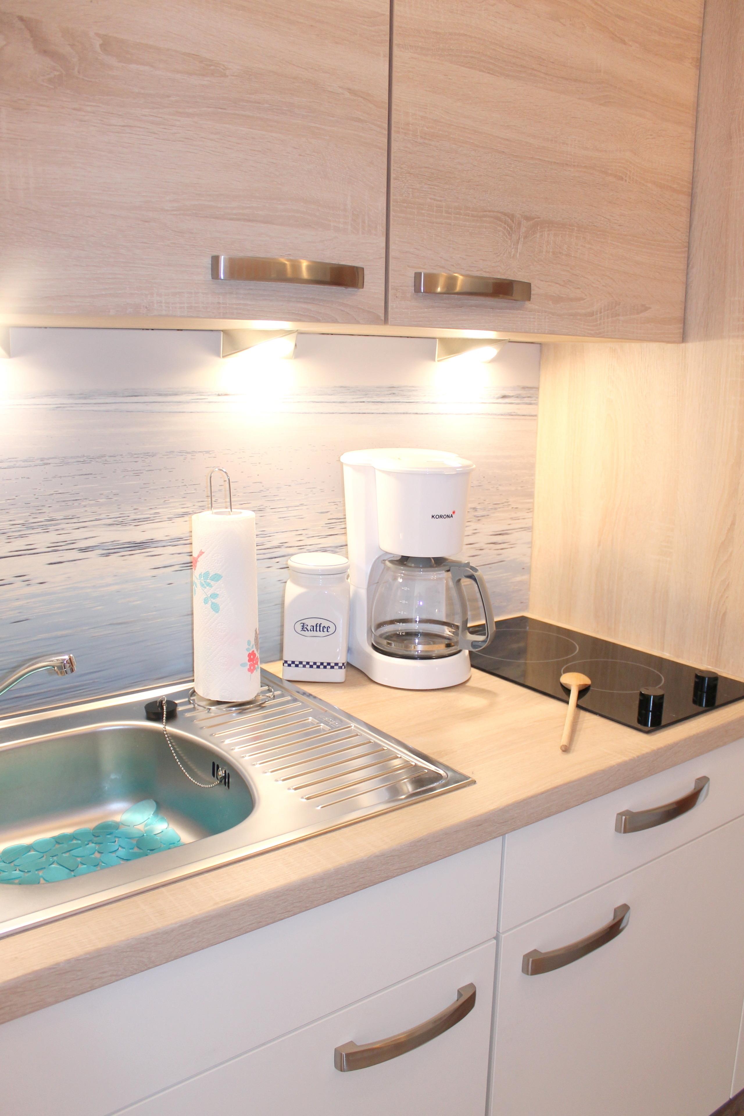 Das Wohnzimmer ist mit einer gemütlichen Sitzecke, TV, DVD-Player mit einer DVD-Sammlung für Groß & Klein, WLAN, einem Essplatz sowie einer offene Küchenzeile versehen. Die kleine Küchenzeile ist u.a. mit einem 2-Plattenherd, einer keinen Geschirrspülmaschine, einem Backofen, sowie einer Kaffeemaschine ausgestattet. Vom Wohnbereich aus haben Sie Zugang zur möbilierten Terrasse in SüdWest-Lage. Das Badezimmer verfügt über Dusche/WC und eine Handtuchheizung. Eins der beiden Schlafzimmer ist mit einem Doppelbett (getrennte Matratzen, offenes Fußende; Maße: 1,80 x 2,00 m) und einem Kleiderschrank versehen, ein bodentiefes Fenster ist vorhanden. Das Kinderzimmer ist mit einem Etagenbett (mit Schutzgitter) sowie einem Kleiderschrank versehen, auch hier befindet sich ein bodentiefes Fenster. Die Wohnung ist mit Steckdosenschutz versehen und eine Sammlung an Gesellschaftsspielen und Büchern speziell für Familien ist vorhanden.