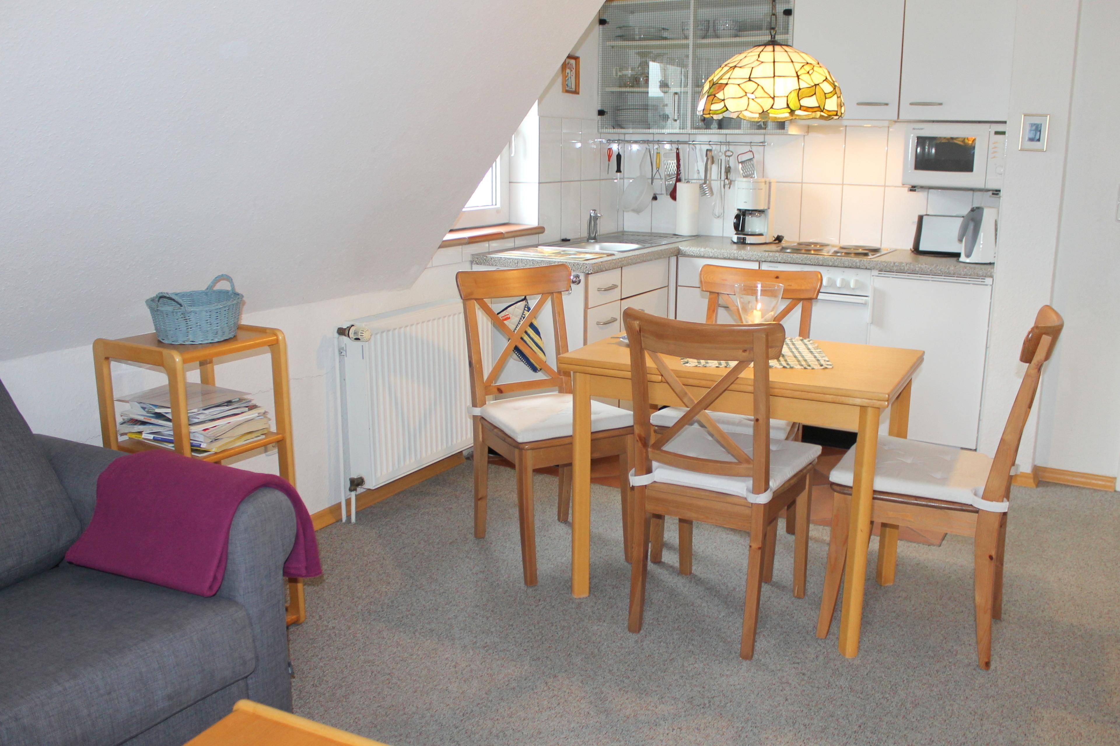 Das 3-Raum-Appartement "Nr. 2" im "Haus Rosenstraße" liegt in der 1. Etage und bietet Platz für max. 4 Personen. Die Wohnfläche der ca. 55 m² großen Ferienunterkunft verteilt sich auf ein Wohn- / Esszimmer, zwei separate Schlafzimmer sowie auf einen kleinen Flur und ein Badezimmer. Der Wohnraum ist mit einer gemütlichen kleinen Sitzecke, TV und einer offenen Küche versehen. Die Küchenzeile ist u. a. mit einer Mikrowelle, einem Backofen, einer Kaffeemaschine und weiteren Küchengeräten ausgestattet, ein Essplatz ist vorhanden. Von hier aus haben Sie Zugang zum möblierten Balkon. Der große Garten steht allen Gästen zur Verfügung. Vom Flur aus gelangen Sie in die beiden Schlafzimmer. Eins ist mit einem Doppelbett (Maße: 1,80 x 2,00 - getrennte Matratzen), einem Kleiderschrank und einer Kommode versehen, das zweite verfügt über ein Etagenbett, einen Kleiderschrank und auch eine Sitzecke ist vorhanden. Das Tageslicht-Badezimmer ist mit Dusche/WC und einer Handtuchheizung ausgestattet. Die Fenster in den Schlafzimmern sind mit Außenjalousien ausgestattet.