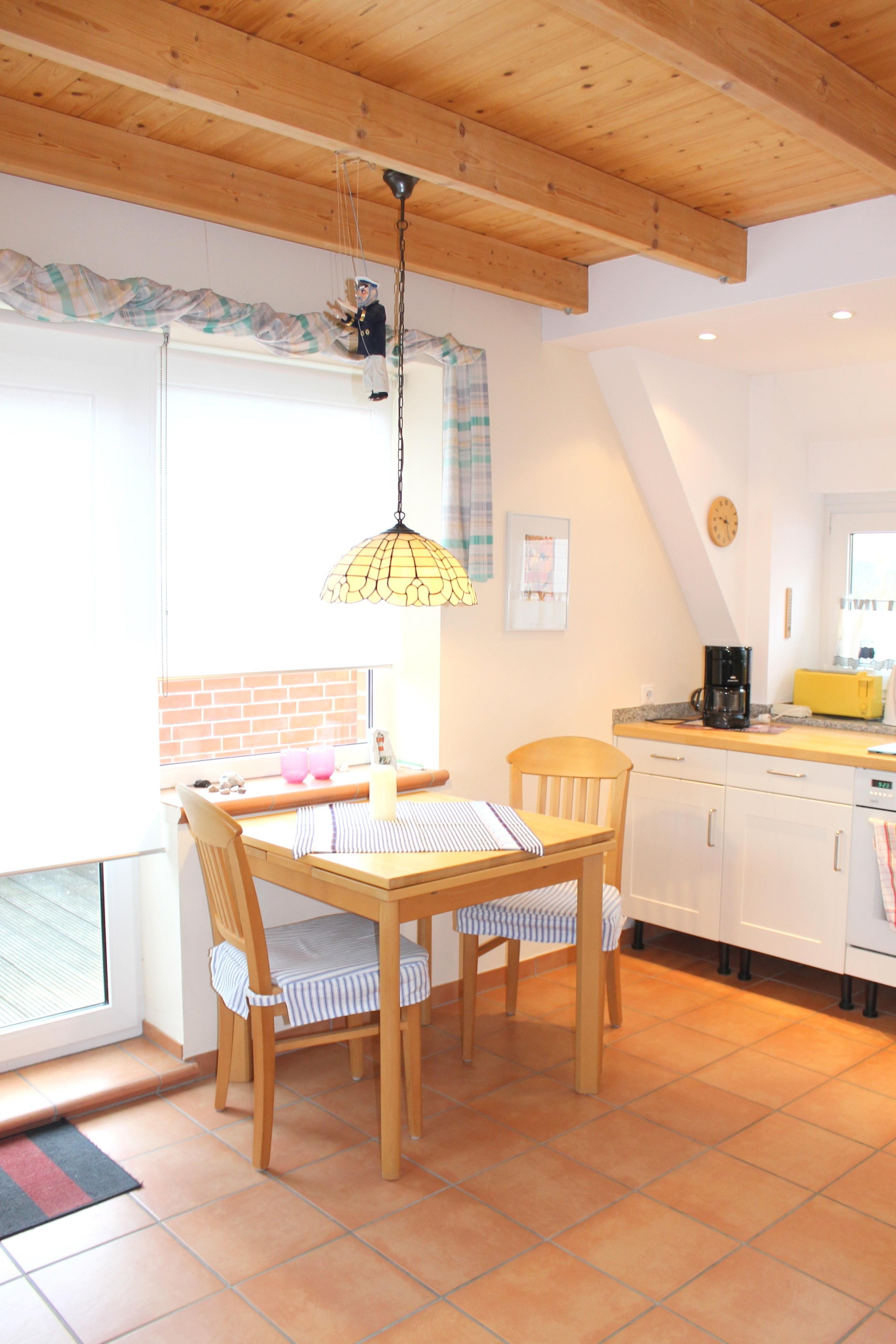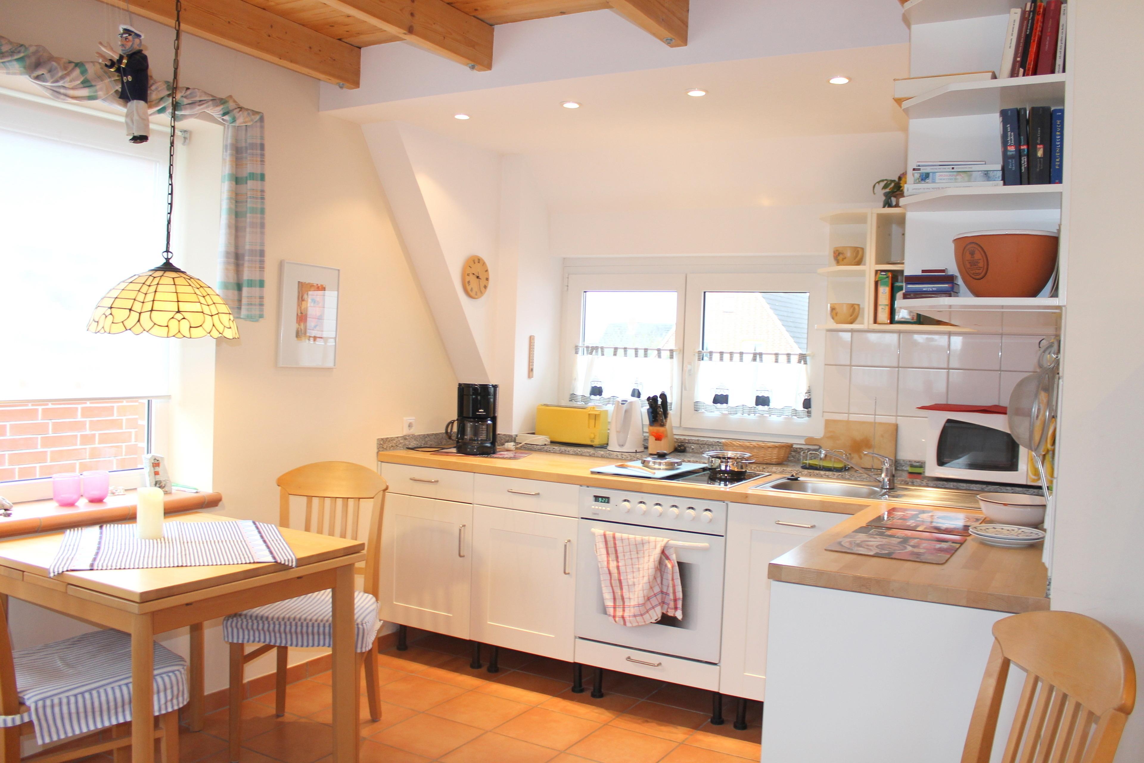 Der Wohnraum ist mit einer kleinen gemütlichen Sitzecke, TV, Stereoanlange mit CD-Player und einer offenen Küche versehen. Die Küchenzeile ist u. a. mit einer Mikrowelle, einem Backofen, einer Geschirrspülmaschine und weiteren Küchengeräten ausgestattet. Ein kleiner Essplatz ist hier ebenfalls vorhanden. Von hier aus haben Sie Zugang zum möblierten Balkon. Der Garten steht allen Gästen zur Verfügung. Das Eltern-Schlafzimmer befindet sich in der 1. Etage und ist mit einem Doppelbett (Maße: 1,80 x 2,00 m - getrennte Matratzen) und einem Kleiderschrank versehen. Das Tageslicht-Badezimmer befindet sich ebenfalls in der 1. Etage und verfügt über: Dusche/WC, eine Handtuchheizung und eine Kommode. Über eine Raumspartreppe gelangt man in das Dachgeschoss mit niedrigen Dachschrägen, hier befinden sich drei weitere Schlafmöglichkeiten für maximal 2 Personen. Eine Kommode, ein TV und eine Stereoanlage mit CD-Player sind vorhanden. Die 1. Etage ist mit keramischem Bodenbelag ausgelegt, das Dachgeschoss mit Teppichboden.