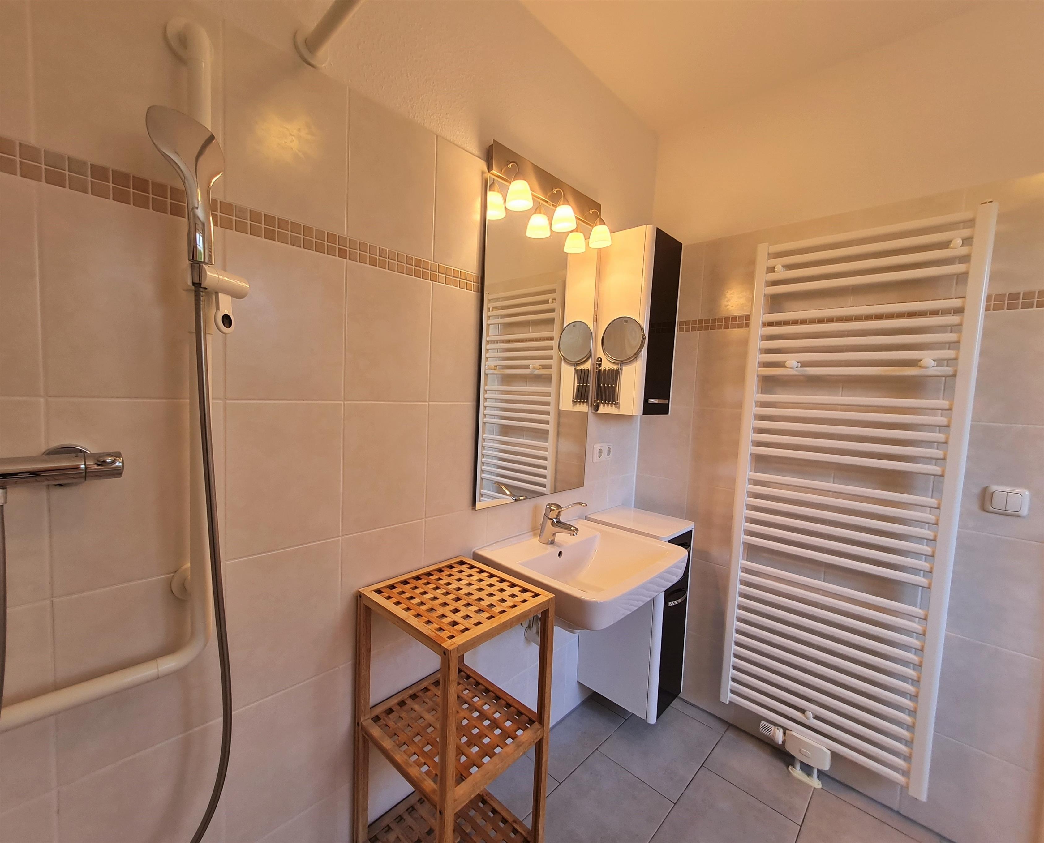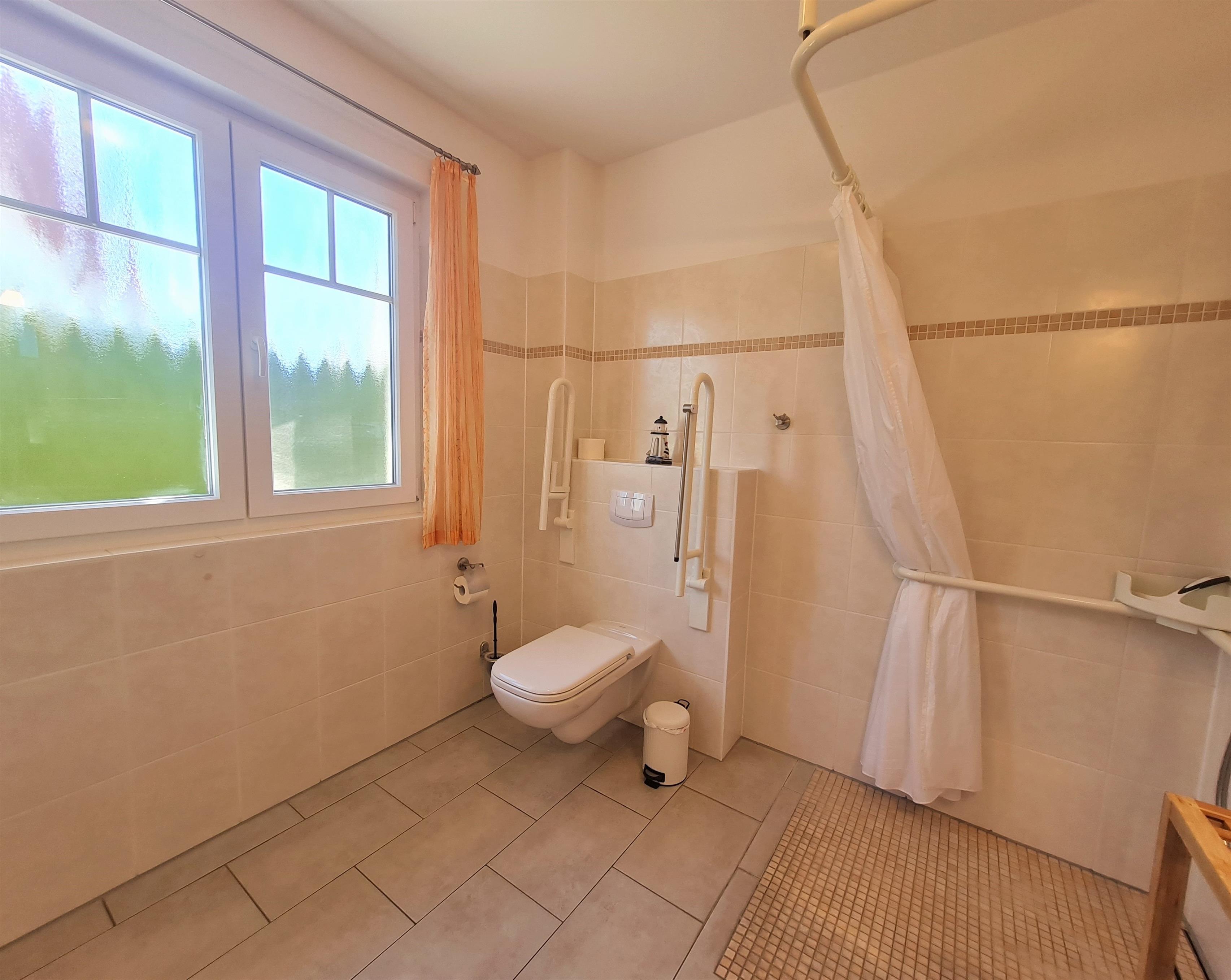 Das große Tageslicht-Badezimmer ist behindertengerecht ausgestattet: Die Dusche ist ebenerdig und mit einem Sitz sowie mit Haltegriffen ausgestattet. Das WC verfügt ebenfalls über einen Haltegriff. Die Türen innerhalb des Hauses sind jeweils 94 cm breit, die Haustür ist mit ca. 88 cm etwas schmaler. Auch die Terrassentür vom Wohnzimmer nach draußen ist barrierefrei gestaltet und lässt sich durch die zweiflügelige Bauweise weit öffnen, eine Passage mit einem Rollstuhl ist ohne weiteres möglich. Die Terrassentür lässt sich nicht von außen verschließen.