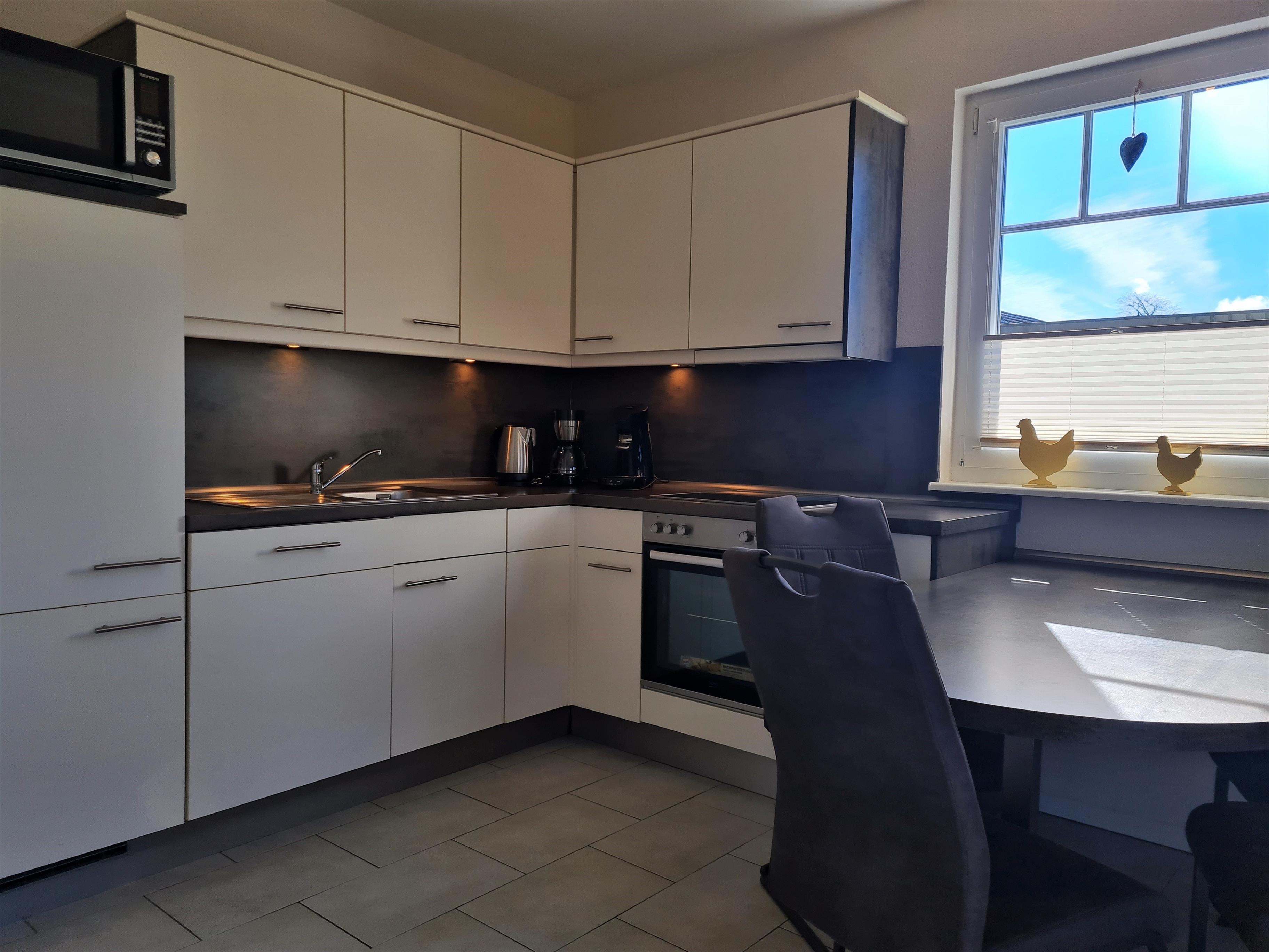 Das großzügige Wohnzimmer verfügt über eine gemütliche Couchgarnitur mit Schlaffunktion 1,20 x 1,80, ein großes TV-Gerät, DVD-Player, CD-Player, einen Essplatz - von hier aus haben Sie Zugang zur großen (teilw. überdachten) Terrasse sowie dem komfortablen Küchenbereich. Dieser ist u. a. mit einem 4er-Ceranfeld, Backofen, Mikrowelle und Geschirrspülmaschine ausgestattet.