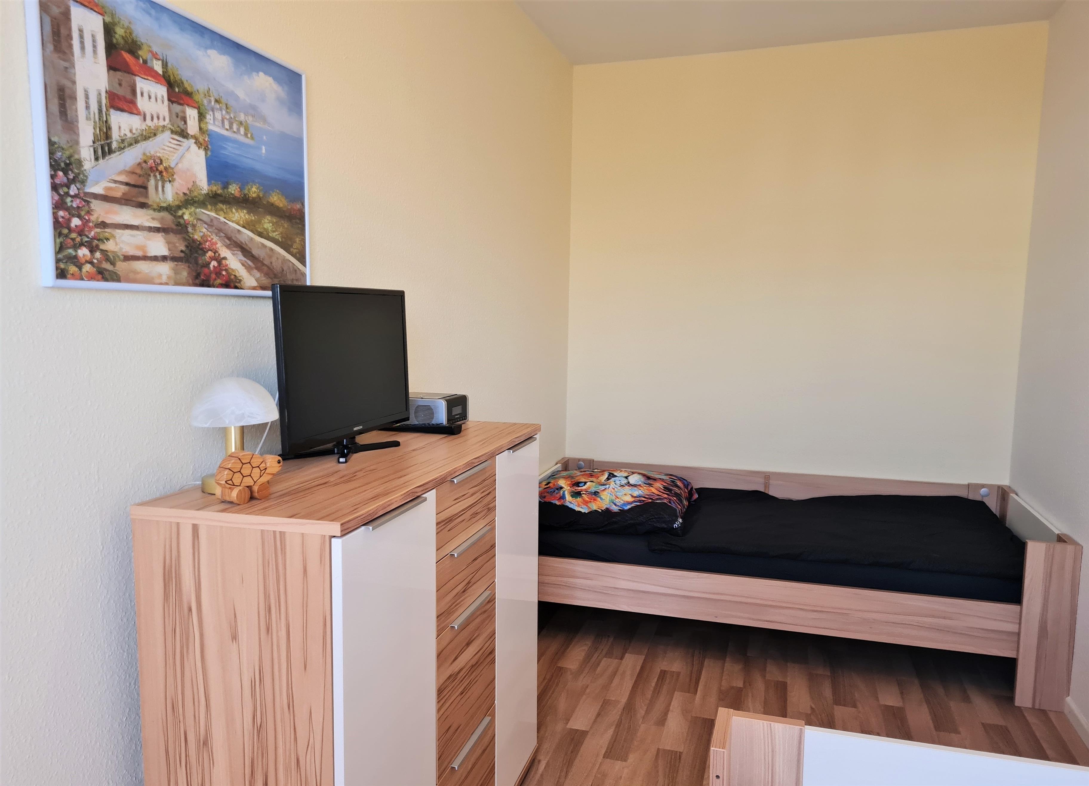 Eines der Schlafzimmer verfügt über ein leicht erhöhtes Doppelbett (1,80 x 2 m) mit am Kopfende verstellbaren Lattenrosten und TV-Gerät, das zweite Schlafzimmer ist mit zwei Einzelbetten, je 90x2 ausgestattet. Ein Kinderbett kann aufgestellt werden, ein Kinderhochstuhl ist ebenfalls vorhanden.