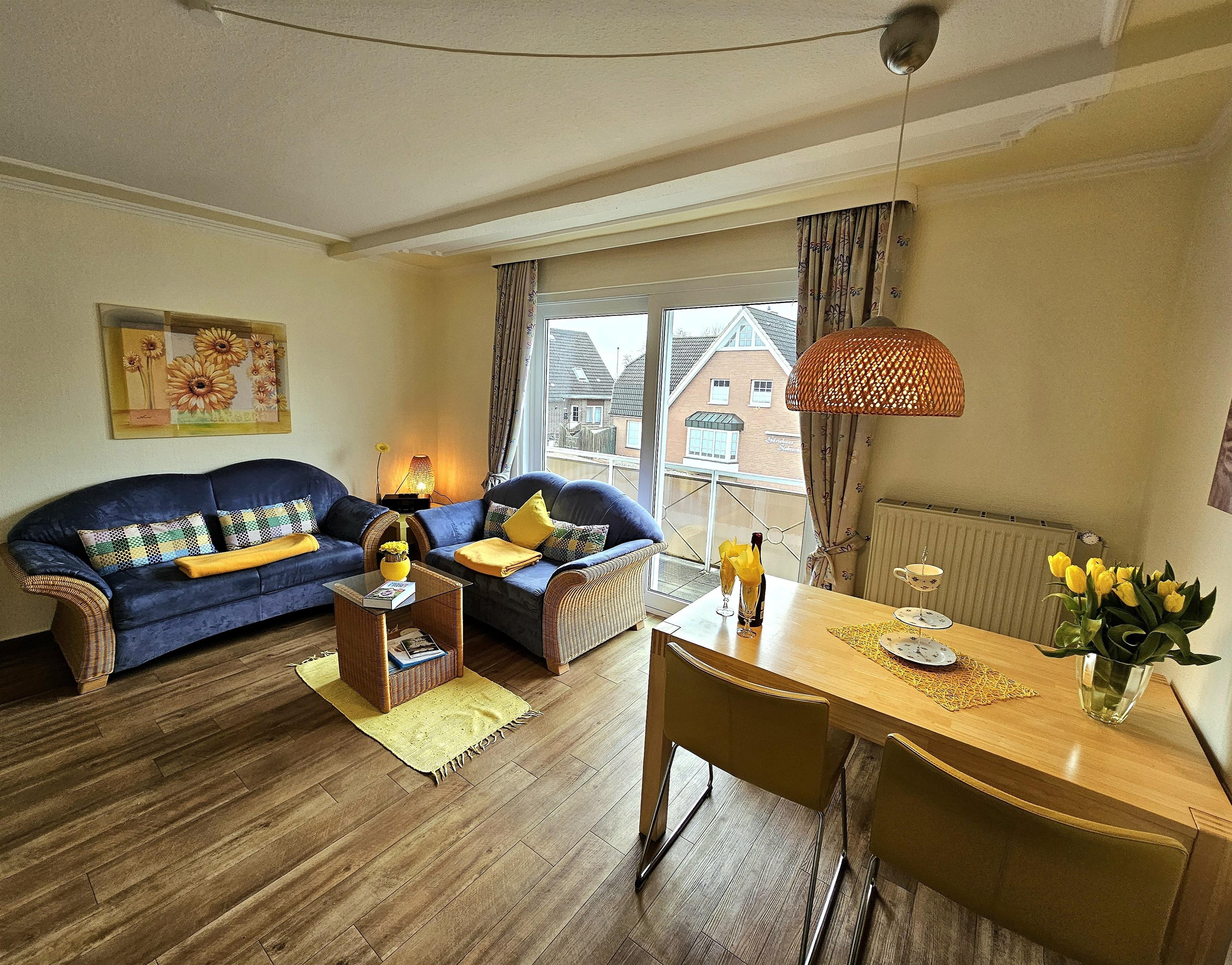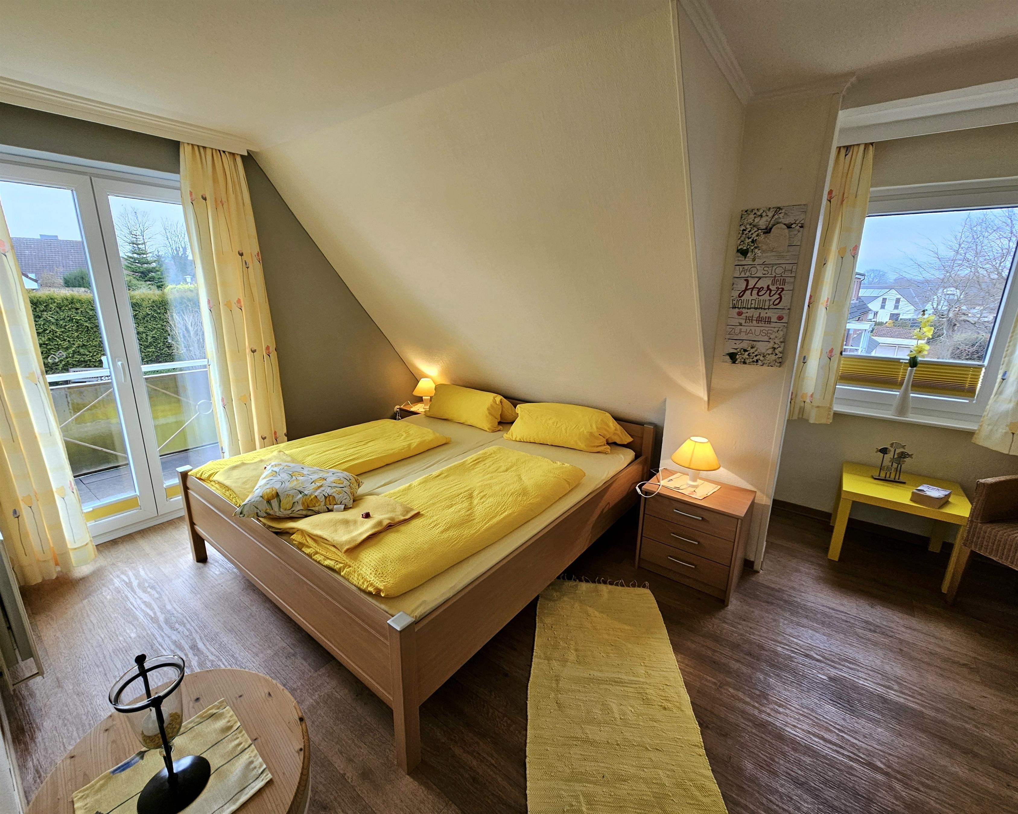 Wir freuen uns auf Ihren Besuch. Unsere gelbe 4 Sterne Wohnung für 1 - 4 Personen (2 x Doppelbetten . 1 x Kinderbett) Sie verfügt über einen Flur, zwei geräumige Schlafzimmer mit Doppelbetten, großes Wohnzimmer mit Sofa-Ecke und Essplatz, großzügiges Duschbad, Küche sowie Süd- und Westbalkon.