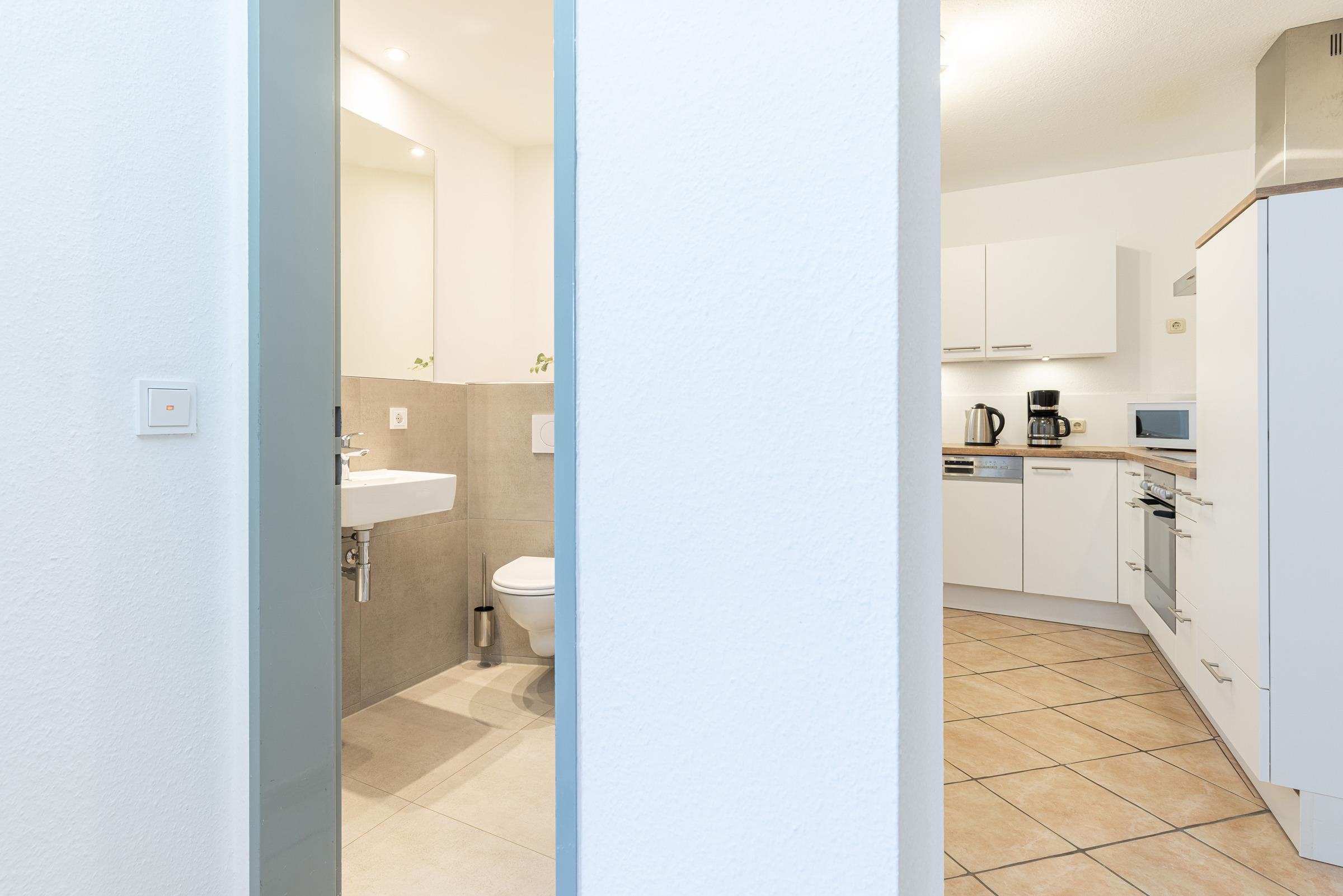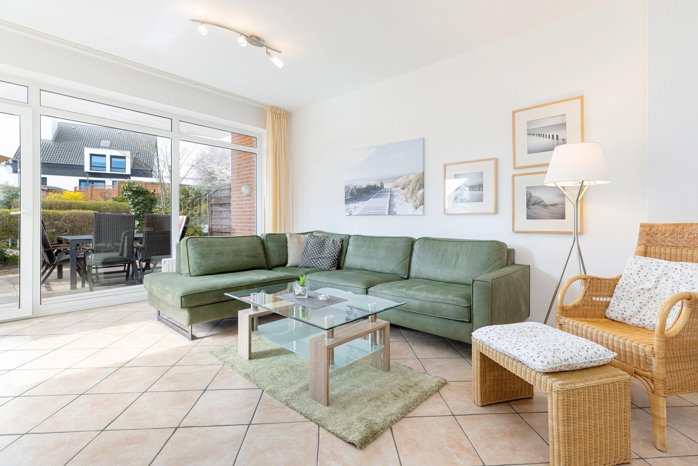 Genießen Sie die komfortable Größe dieser modern eingerichteten Ferienwohnung mit geräumiger Terrasse zur Süd-Westseite, offenem Wohnraum mit großem Esstisch, Wohnlandschaft mit moderner Smart-TV-Wand und neu verbauter Komfort-Küche. Fußböden sind gefliest.