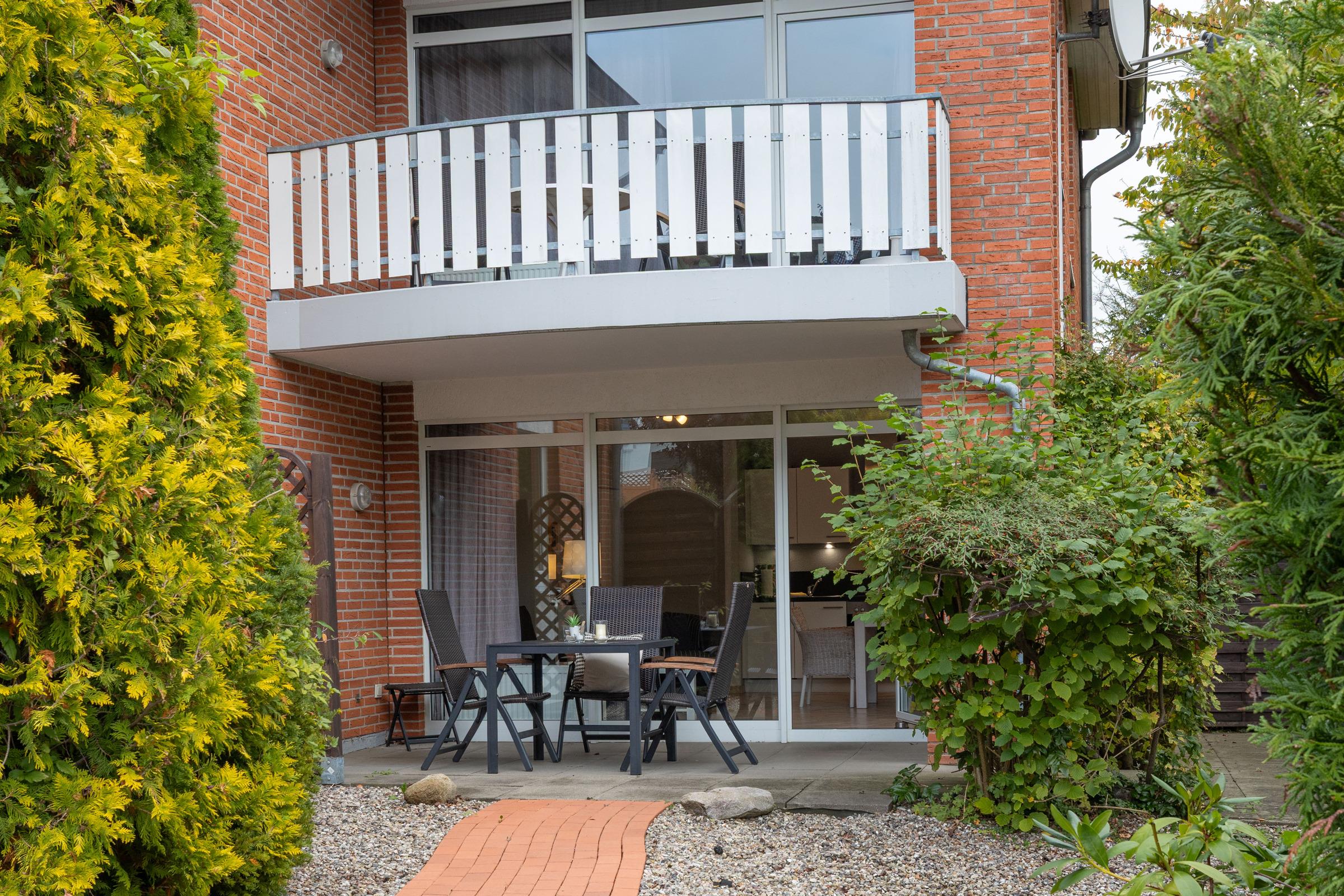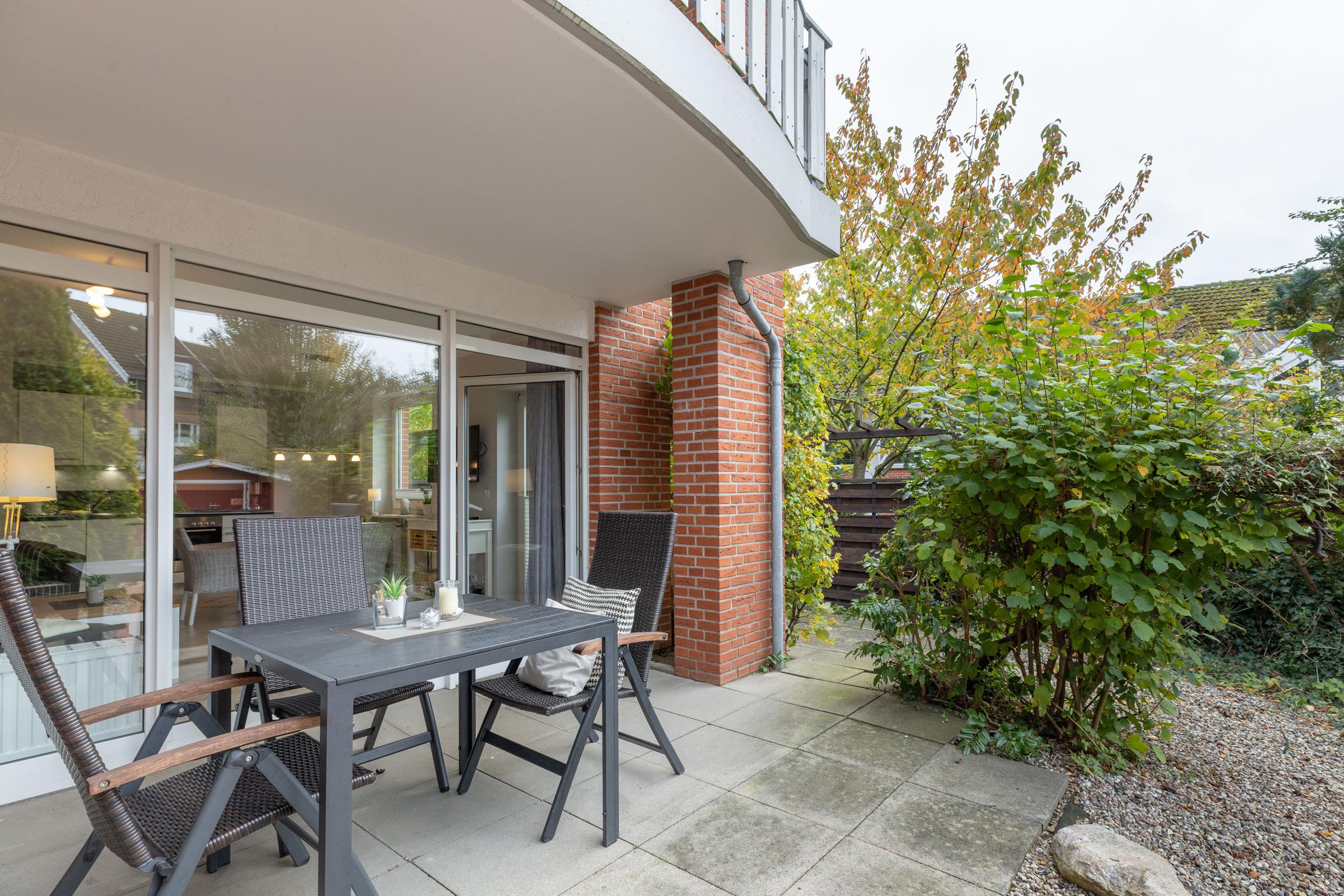 Harmonie und Urlaubsfreude strahlt dieses Apartment aus. Vom Wohnraum aus genießen Sie den Blick ins Grüne. Die große Terrasse mit dem Gartenstück zur Süd- und Westseite lädt zum Sonnen und Faulenzen ein.