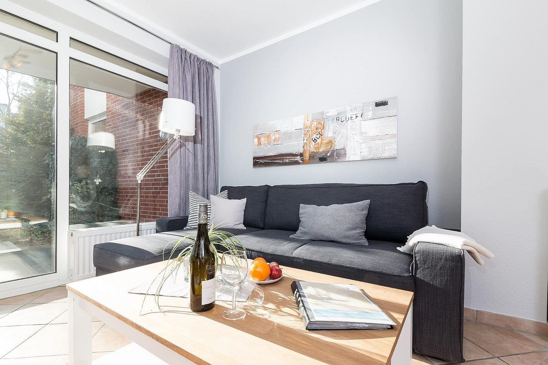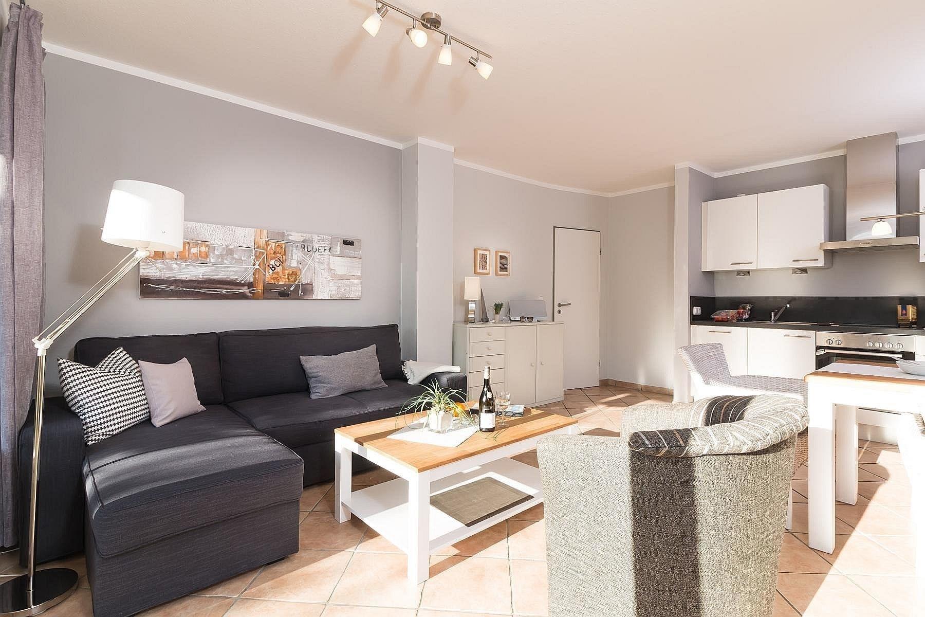 Modernes Wohlfühl-Apartment in zentraler und strandnaher Lage (200 m zum Kurzentrum und Hauptstrand) für 3 Personen auf 50 m² Wohnfläche mit 1 Schlafzimmer mit Boxspringbett und Wohnraum mit Schlafcouch.