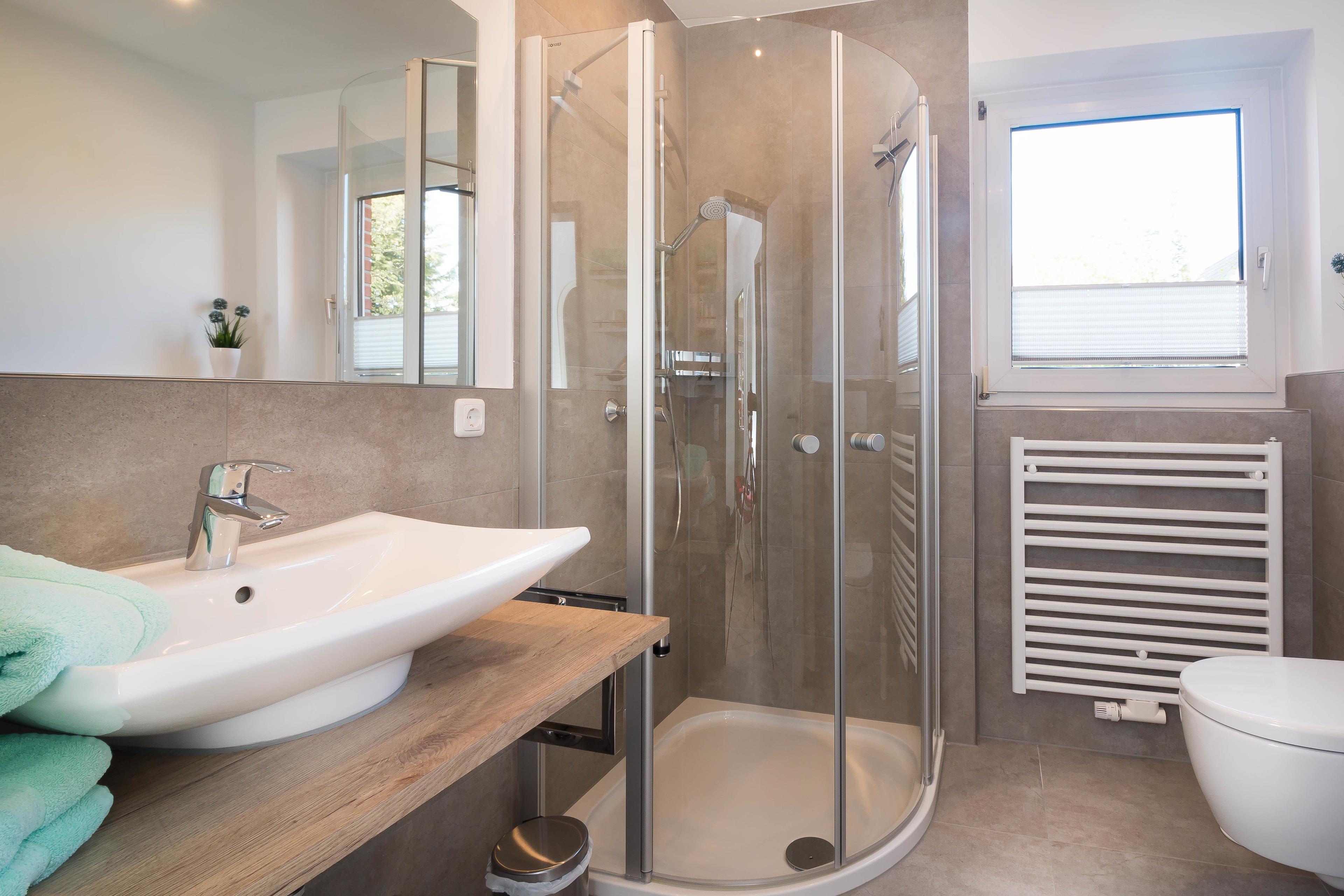 Auch im Flur bietet ein weiterer Schrank genügend Platz. Das Duschbad wird durch ein Fenster vom Tageslicht erhellt.