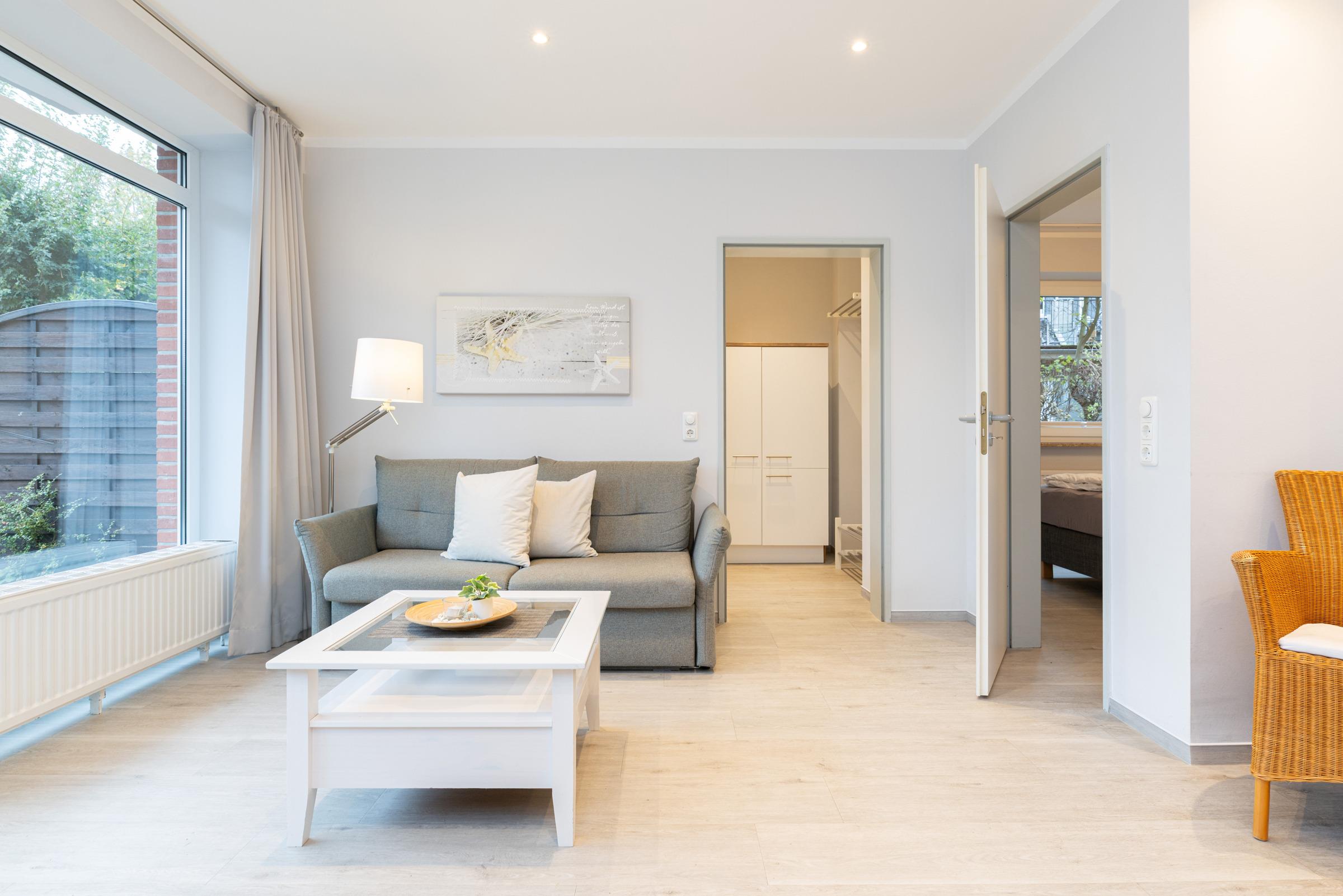 Ruhig gelegenes Erdgeschoss-Apartment mit separatem Eingang in zentraler und strandnaher Lage (200 m zum Kurzentrum und Hauptstrand) für 2-3 Personen auf 42 m² Wohnfläche mit 1 Schlafzimmer und 1 Wohn-Schlafraum (Schlaf-Couch).