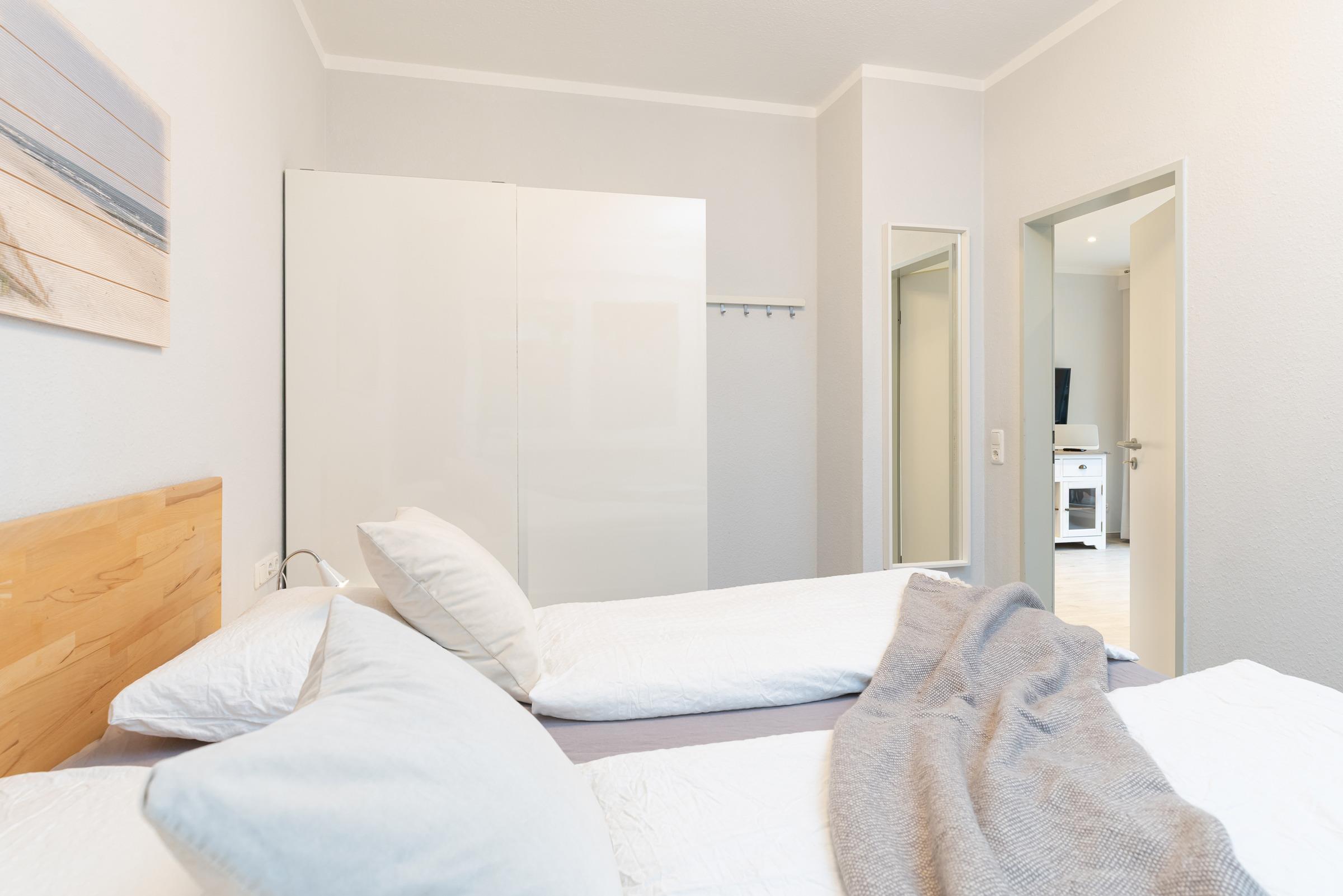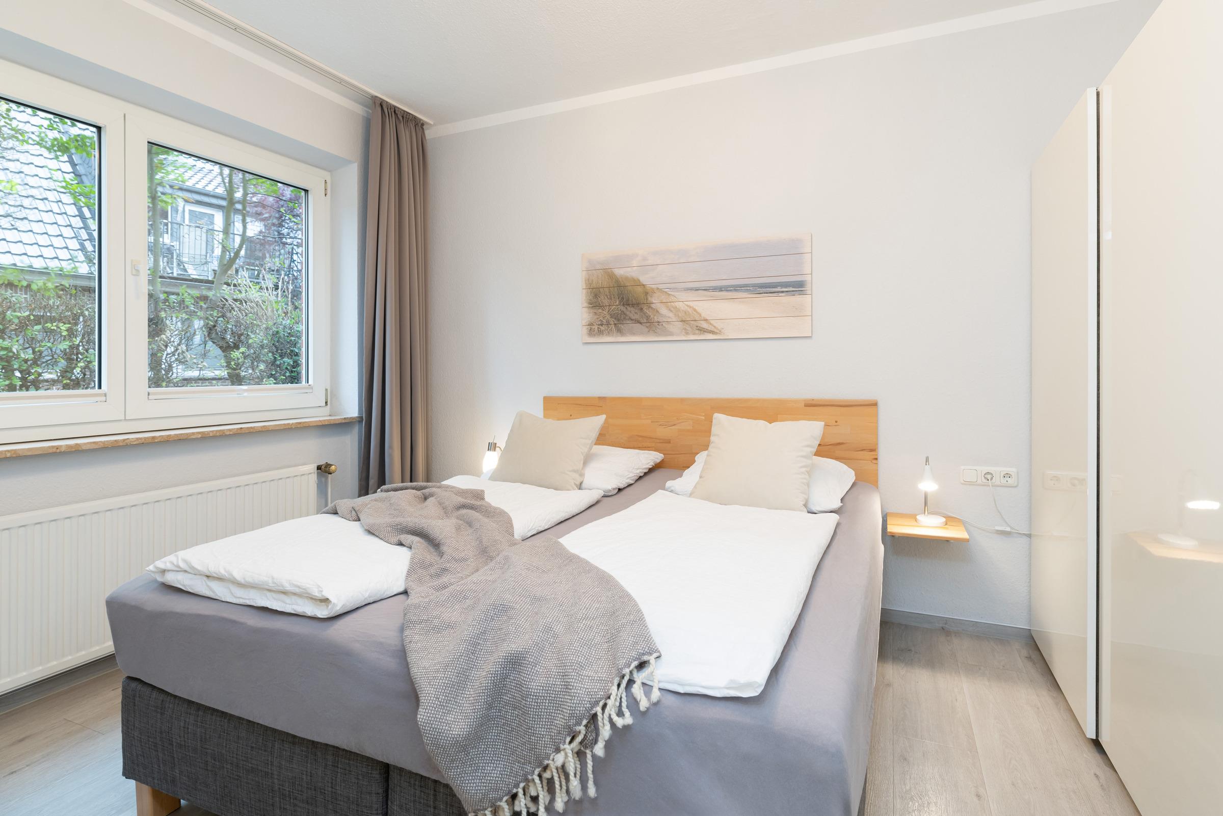 Auch der Schlafraum ist ruhig gelegen und besteht aus einem Doppel-Boxspringbett (je 90 x 200 cm) und 2-türigem Kleiderschrank.