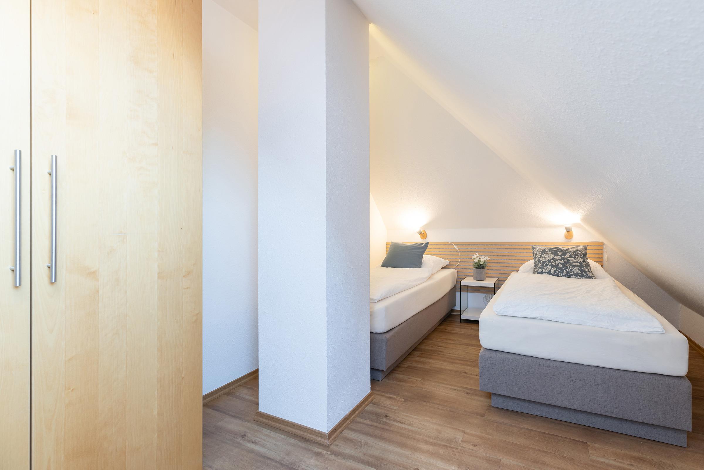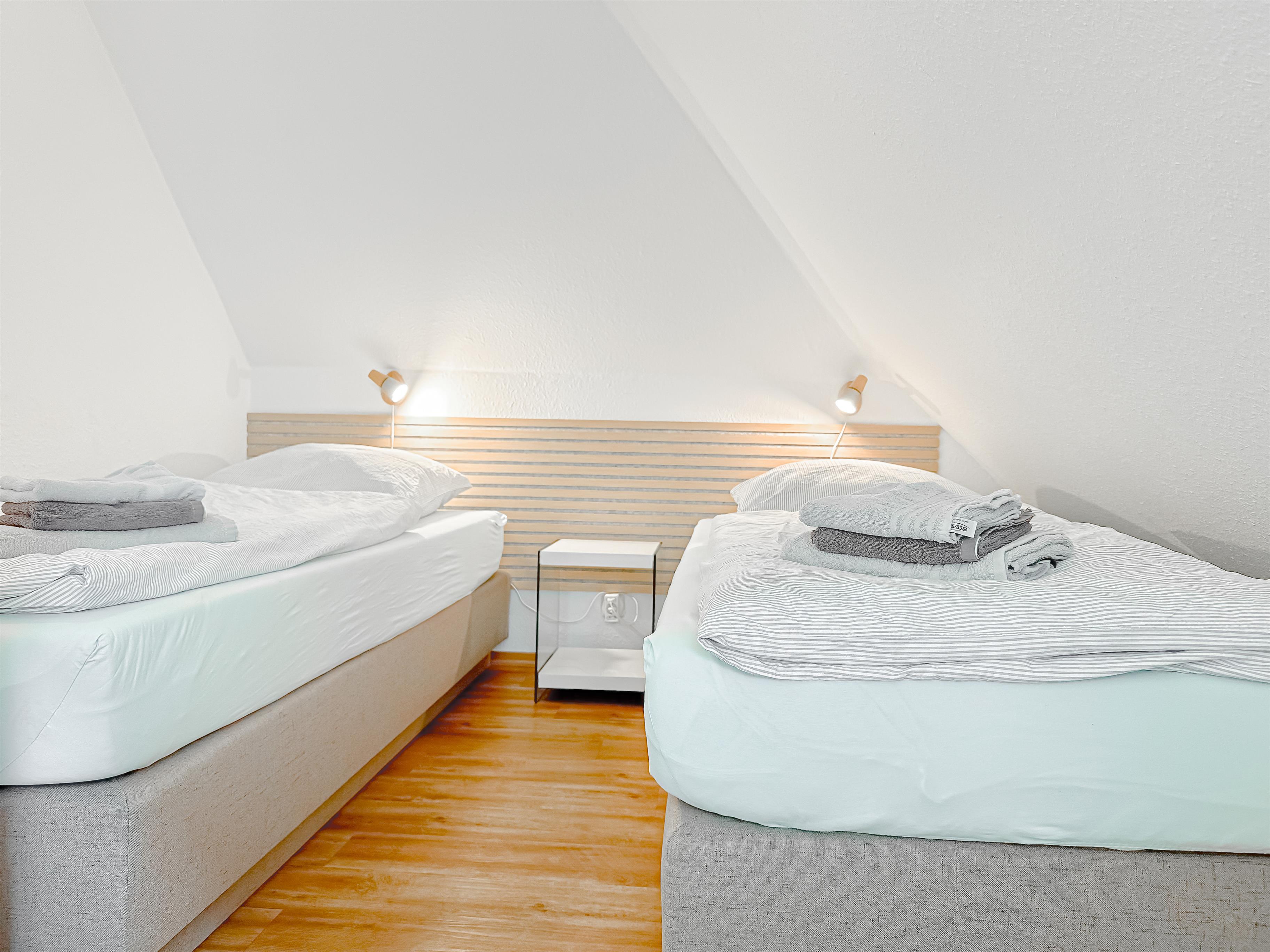 Im zweiten Schlafraum befindet sich, zusätzlich zu zwei neuen Boxspring-Einzelbetten (90x200 cm), ein Babybett und Kleiderschrank (100 cm).